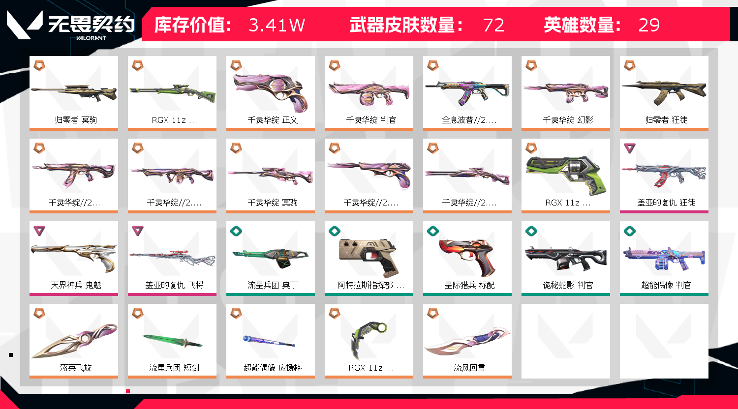 套装:千灵华绽套装|千灵华绽2.0套装 千灵华绽套装:千灵华绽幻影V4|千灵华绽判官V4|千灵华绽冥驹V4|千灵华绽正义V4|落英飞旋V2| 千灵华绽套2.0套装:千灵华绽狂徒V4|千灵华绽鬼魅V4|千灵华绽莽侠V4|千灵华绽战神V4|流风回雪V2| 莲花套装:莲花狂徒V4|莲花幻影V4|莲花鬼魅V4|莲花正义V4|莲花莽侠V4|莲花冥驹V4|莲花判官V4|莲花扇子V2| 显卡3.0套装:显卡正义V5|显卡莽侠V5|显卡爪刀V2| 其他皮肤:全息波普狂徒V4|盖亚的复仇狂徒V4|归零者狂徒V4|超能偶像狂徒|流星兵团狂徒|弧光异彩狂徒|诡秘蛇影狂徒|聚合之力幻影|末日之翼幻影|彩梦之城戍卫|超能偶像戍卫|战术熊与伙伴们戍卫|折光棱晶戍卫|弧光异彩獠犬|采蜜小蜂队獠犬|信手涂鸦骇灵|流星兵团骇灵|弧光异彩蜂刺|纤云弄巧蜂刺|聚合之力蜂刺|折光棱晶蜂刺|采蜜小蜂队判官|超能偶像判官|诡秘蛇影判官|彩梦之城雄鹿|归零者冥驹V4|诡秘蛇影莽侠|纤云弄巧莽侠|战术熊与伙伴们莽侠|盖亚的复仇V4飞将|信手涂鸦飞将|末日之翼飞将|聚合之力飞将|信手涂鸦奥丁|末日之翼奥丁|流星兵团奥丁|采蜜小蜂队战神|超限闪存正义|纤云弄巧正义|星云暗涌鬼魅|信手涂鸦鬼魅|流星兵团鬼魅|天界神兵鬼魅V4|采蜜小蜂队鬼魅|战术熊与伙伴们狂怒|聚合之力狂怒|纤云弄巧短炮|末日之翼短炮|超能偶像标配|战术熊与伙伴们标配|折光棱晶标配|彩梦之城标配|超能偶像应援棒|流星兵团短剑;盖亚的复仇 狂徒,归零者 冥驹,RGX 11z Pro//3.0 莽侠,天界神兵 鬼魅,千灵华绽 正义,