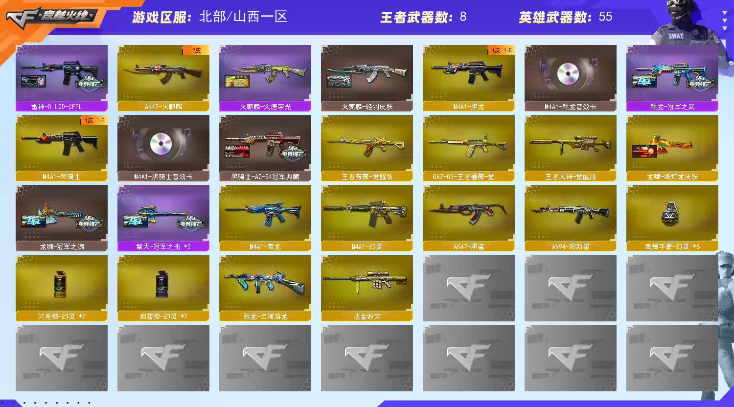 传说灵眸》《m200幻神+冠军之幻+纸灯龙》《裁决》《王者风神》《cop幻灵 1911大黄蜂》《冠军小刀》《幻灵套》《白虎》《青龙》《玄武》《王者芳薇》《qbz王者蔷薇》《qbz金色蔷薇》《毁灭》《火麒麟》《雷神》《黑骑士》《黑武士》《黑龙》《双面神》《火麒麟零纪元》《荒漠琉璃 4防司雨 4防影豹 4防岚兮儿 奇洋探员 乔伊教练 4防王者春 4防王者潘多拉 4防王者影豹 云海玲珑满配 卡塔琳娜 灵狐者职业经理 五号兵器赛博朋克》《超级背包》《烈龙云海游龙音效卡 碧霄极光音效卡 黑龙音效卡 擎天云海游龙音效卡 修罗云海游龙音效卡 黑骑士音效卡 碧霄极光音效卡 白虎音效卡》《金色蔷薇纸灯龙 雷神脉冲核心 qbz03巅峰荣耀 雷神rlgdcfpls18 黑龙冠军之武 白虎电玩粉兔》;Knife-冠军之刃,QBZ03-金色蔷薇,M200-幻神,Scar Light-白虎,传说灵眸,