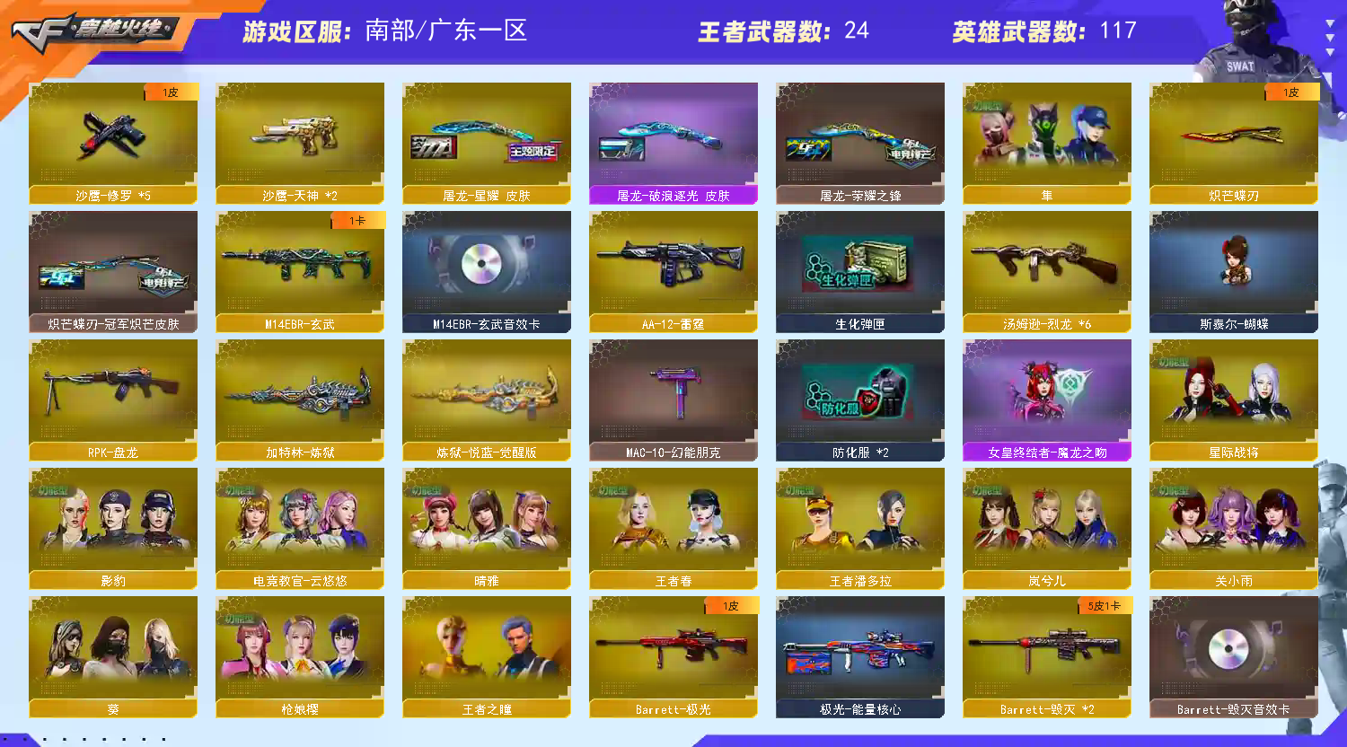 《传说影煞》《传说灵眸》《传说幽瞳》《传说夜影》《传说幽冥2》《传说破晓》《幻神+黄忠+降龙+青鹤+冠军之幻+女团+星火小队+音效卡》《星神+漫游+巅峰荣耀+音效卡》《M200竞技荣光》《王者幻神 王者星神 王者风神 王者星霆》《毁灭 极光 裁决 朱雀》《白虎》《G36C幻影》《白虎之魄》《王者芳薇 qbz金色蔷薇 玄武 千变 火麒麟 黑龙 雷神 黑骑士》《6烈龙》《暴君乱 世超越Max 斯泰尔蝴蝶 死亡之眼》《usp雷暴 cop幻灵 柯尔特竞技荣光 幻兽 柯尔特冠军之特》《炽芒蝶刃》《冠军之刃》《竞技荣光套装》《四防传说影煞 电竞教官云悠悠 关小雨 枪娘樱 晴雅 星际战将 影豹 岚兮儿 隼 乔伊教练 蛇隐宗 四防王者春 四防王者潘多拉 四防灵狐者职业经理》《玄武音效卡 白虎音效卡 毁灭音效卡 雷神音效卡 黑骑士音效卡》《屠龙星耀 雷神女团 幻影波浪逐光 黑龙冠军之武 黑骑士战神马超 毁灭战神张飞 M4A1战神赵云 火麒麟战神关羽 火麒麟冠军之心 毁灭荣耀之怒 雷神冠军之魄 炽芒蝶刃冠军炽芒 毁灭16冠军 金色蔷薇枪娘阿敏;USP-雷暴,传说幽冥,柯尔特-冠军之特,炽芒蝶刃,Knife-冠军之刃,传说影煞,隼,