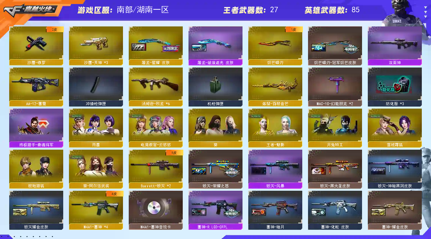 【幻神三件套/QBZ三件套/星神三件套/裁决三件套/雷神三件套/黑骑士三件套/竞技荣光套】 【传说武器】:传说幽冥/传说辉光 【英雄级武器】:AK47-火麒麟/AK47-无影/AK12-天启/AWM-裁决(2)/AA-12-雷霆/Barrett-毁灭(2)/炽芒蝶刃/Kar98K-星神/柯尔特-竞技荣光/龙啸/M4A1-黑龙/M4A1-雷神(4)/M4A1-黑骑士/M4A1-玫瑰精灵(2)/M200-幻神/M200-竞技荣光/擎天(2)/麒麟刺/擎天-竞技荣光/沙鹰-修罗/沙鹰-天神(3)/汤姆逊-烈龙(6)/屠龙(3)/ScarLight-白虎/G36C-幻影/黑武士-锦绣游龙/金色蔷薇-古蛇迷踪/死神-雪域霜狐/QBZ03-金色蔷薇(4)/王者之心-觉醒版/王者之影-觉醒版/王者之圣-觉醒版/黑骑士-海王/M4A1-雷霆王者-觉醒版/王者之怒-觉醒版/王者幻神-觉醒版/王者蔷薇-觉醒版/炼狱-百战金芒/COP357-雷霆王者-觉醒版/USP-冥王/修罗-古蛇迷踪/麒麟刺-百战金芒/雷霆王者之锋-觉醒版/高爆手雷-竞技荣光(7)/高爆手雷-古蛇迷踪/高爆手雷-玄豹/闪光弹-竞技荣光(3)/闪光弹-雷霆王者-觉醒版(3)/烟雾弹-竞技荣光(3)/烟雾弹-古蛇迷踪/烟雾弹-玄豹/烟雾弹-雷霆王者-觉醒版(3)/M4A1-赤狱骑士/M4A1-苍鸣雷神/AWM-昌龙/Barrett-碧霄极光 【王者炫金武器】:王者之城/王者玉锋/炫金雷神/炫金毁灭/王者凌虎/王者星魄/王者星光/王者森力 【音效卡】:AWM-裁决音效卡/M200-幻神音效卡/M4A1-黑骑士音效卡/QBZ03-金色蔷薇音效卡/M4A1-雷神音效卡/Kar98K-星神音效卡/Barrett-碧霄极光音效卡/炼狱-百战金芒-庆典舞曲音效卡/死神-雪域霜狐-怀旧音效卡/AWM-昌龙-怀旧音效卡 【皮肤】:白虎-AG-CFPLS20冠军/毁灭-黑大圣皮肤/幻神-AG-CFPLS17冠军/幻神-丹凤(2)/火麒麟-平天大圣/火麒麟-百城/毁灭-荣耀之怒/毁灭耀金皮肤/毁灭-风暴/黑骑士-冠军之势/雷神-荣耀之魄/雷神-虎将/雷神-耀金皮肤/雷神-R.LGD-CFPLS18冠军/龙啸-冠军之啸/M200-幻神-荣耀世冠白鲨/QBZ03-传奇宠儿/擎天-冠军之击/ScarLight-白虎-暗星/修罗-星空/幻神-星耀皮肤/幻神-荣耀世冠白鲨2023皮肤/幻神-AG-CFPLS24冠军皮肤/幻神-荣耀世冠EP皮肤/白虎-白鲨-CFPLS23冠军/金色蔷薇-破浪逐光皮肤/QBZ03-荣耀世冠EP皮肤/裁决-流光秘银/裁决-叶芒苍灵皮肤/裁决-运输船皮肤/星神-巅峰荣耀皮肤/星神-傲竹金蛇皮肤/雷神-暗月/雷神-梦蝶皮肤/雷神-源计划2.0专属皮肤/雷神-化蛇皮肤/雷神-诺拉皮肤/M4A1-再燃火线/毁灭-神秘黑洞皮肤/毁灭-百城浙江皮肤/毁灭-虹光风暴皮肤/黑骑士-破界皮肤/天启-暗月/天启-紫霄皮肤/玫瑰精灵-蓝调梦幻皮肤/烈火-动感闪耀皮肤/AWM-再燃火线/Barrett-金色蔷薇-蛇姬皮肤/加特林-炼狱-钟馗皮肤/修罗-能量核心/屠龙-星耀皮肤/屠龙-破浪逐光皮肤/屠龙-惊鸿皮肤/龙啸-蛇姬皮肤/轻型军用手斧-再燃火线/擎天-秘银/麒麟刺-月皮肤/炽芒蝶刃-冠军炽芒皮肤 【道具】:AG战队炫彩背包/BS战队炫彩背包/CFS限定背包/EP战队炫彩背包/亚洲杯纪念炫彩背包/冰冰背包-猛男专用/古蛇迷踪炫彩背包/战舰背包/机械魔影背包-红色/沙漠龙背包-猛男专属/牛魔王背包-至尊黄金/百战金芒炫彩背包/背包-洛丽塔/超级背包/雪域霜狐炫彩背包/黄金巨石泰坦-魔花研究所背包/黄金曼提柯尔的背包/黄金超能特工背包/超核名片/终极猎手-秦魂将军/虚空终结者-暗域熔岩/救世主-黑桃战神/绿色巨人/灵魂忍者/妖姬/迷雾幽灵(2)/夺命之镰/防化服(3)/巅峰赛先锋-金色流光/流光-再燃火线/枪王排位28赛季金色流光/枪王排位29赛季金色流光/语音特效-盛典烟火/语音特效-怀旧/雪域霜狐表情/蛇隐宗表情/萌萌小葵表情/炽雪表情/斯沃特表情/动感闪耀表情/CFPL选手表情-第1套/CFPL选手表情-第2套/新白银C4/C4-红龙/防弹头盔(5)/防弹衣(5)/C4工具钳(4)/手雷包(4) 【人偶武器】:AWM-灵狐-15周年嘉年华/COP-旗袍/C.A.T/Cat-刀锋/海滩汪汪-巴雷特/M4A1-雷神-精英刀锋/迷你深渊冰龙/迷你生化手雷/牛牛-AK47/生化手雷-机甲核心/天龙-曼陀罗/雷神-小红/裁决-雪莉杨/星神-炽天使/ScarLight-马枪 【暴走生化】:黑龙吞噬者/死亡之眼/双面神 【挑战大师】:冰龙粉碎者-白马银枪/激光毁灭者III-白马银枪/激光毁灭者III/KAC-圣炎切割者III 【角色】:新角色妮妮/电竞教官-云悠悠/葵/王者-魅影/月兔特工/雨墨/樱-青春偶像/战地猎狐/雪域霜狐/蛇隐宗/乔伊教练/修道士/暗夜-X/电竞少女/风暴女/兰妹妹/灵狐-花神/灵狐者-X/龙儿/曼陀罗-X/蛇姬/斯沃特-X/兔囡囡/影武者-X;传说幽冥,炽芒蝶刃,Knife-冠军之刃,电竞教官-云悠悠,妮妮,QBZ03-金色蔷薇,G36C-幻影,