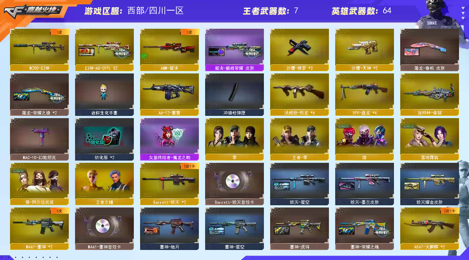 【m200幻神+幻神ag24冠军】【裁决+裁决巅峰荣耀】【4盘龙6烈龙+死亡之眼】【星神漫游+火麒麟巅峰荣耀+毁灭ag冠军+毁灭sv冠军+毁灭2018+雷神荣耀之魄+屠龙荣耀之锋】【毁灭音效卡+雷神音效卡+火麒麟音效卡】【隐+暗夜审判】【火麒麟+雷神+黑骑士+毁灭+炼狱】【火麒麟灵狐+cop旗袍】【1911大黄蜂】【手斧镜】【超级背包+a背包扩展卷】【工具钳+手雷包】;