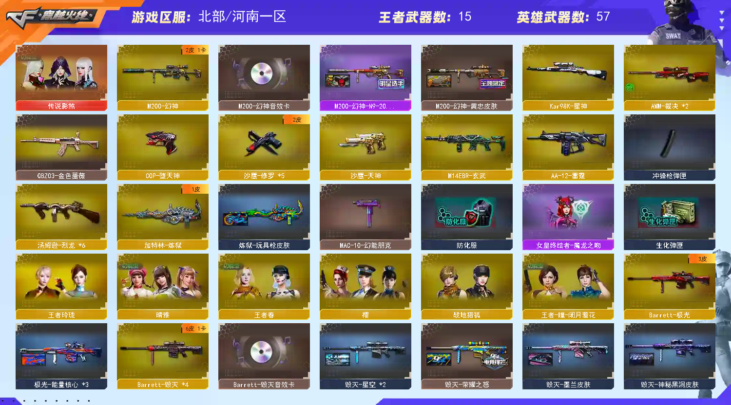 首页 > 租号大厅 > 穿越火线 > 网通区/河南一区 > 【炽芒蝶刃】M200-幻神音效卡⚡幻神N9黄忠双皮98k星神COP王者幻神⚡传说影煞晴雅✅生化6烈龙