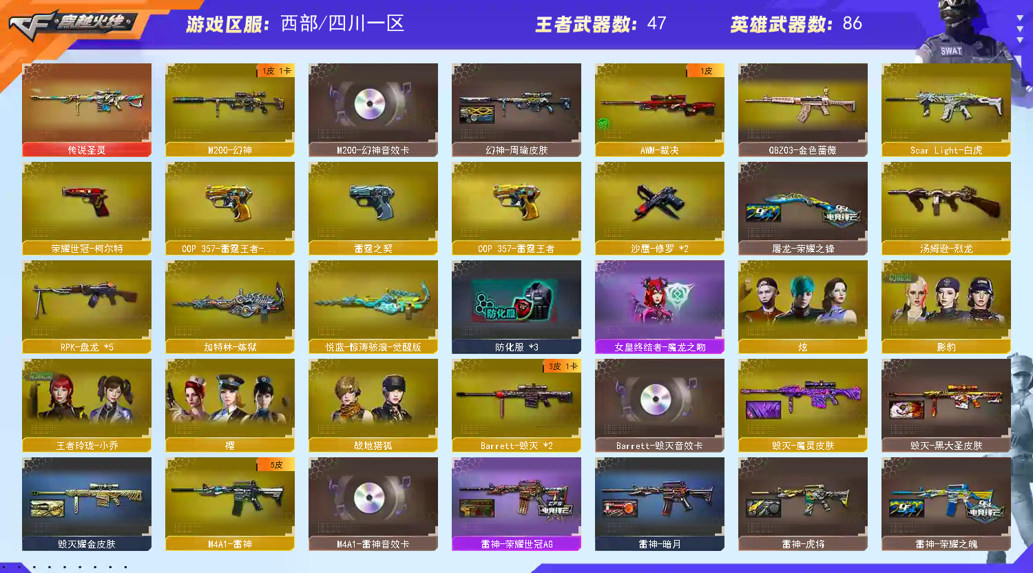 首页 > 租号大厅 > 穿越火线 > 电信区/四川一区 > 双幻神⚡M200-幻神音效卡周瑜皮肤三件套⚡王者幻神⚡传说圣灵✅白虎蔷薇荣耀世冠套✅生化6盘6烈死眼