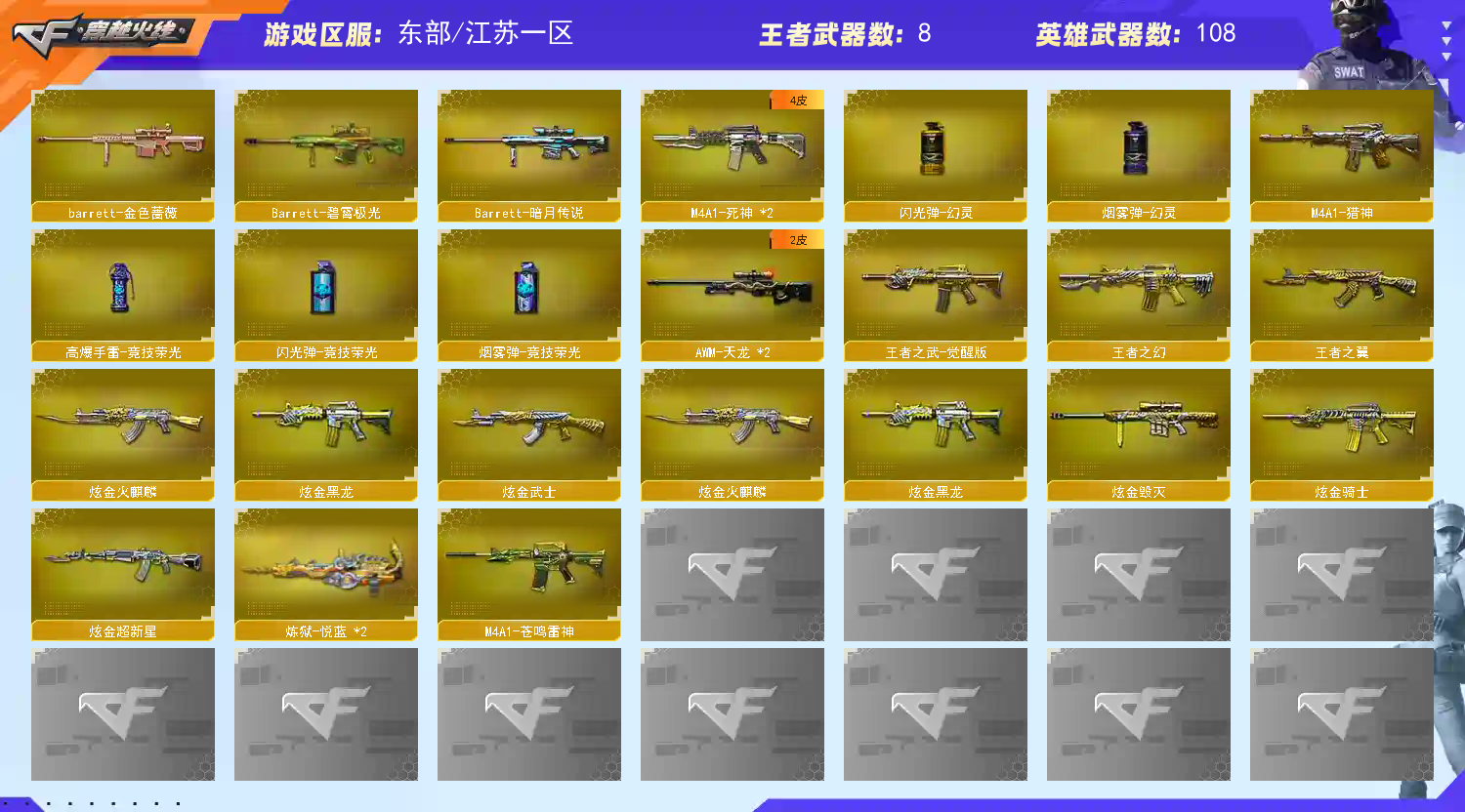 110v-幻神-朱雀-qbz金色蔷薇-毁灭(毁灭音效卡+荣耀之怒)-【6盘龙+炼狱+6烈龙】-火麒麟(火麒麟音效卡)-雷神(雷神音效卡+宠儿) 请看截图 喜欢请点收藏 方便下次租 可以当成自己号玩【感谢老板租此号】优质账号 如果有个别装备到期 影响不大的情况下请不要维权,如遇到账号密码错误 顶号 冻结 请直接维权即可, 科技大佬麻烦看了请绕道,出zu不易,给你跪下了!;RPK-盘龙,QBZ03-金色蔷薇,M200-幻神,