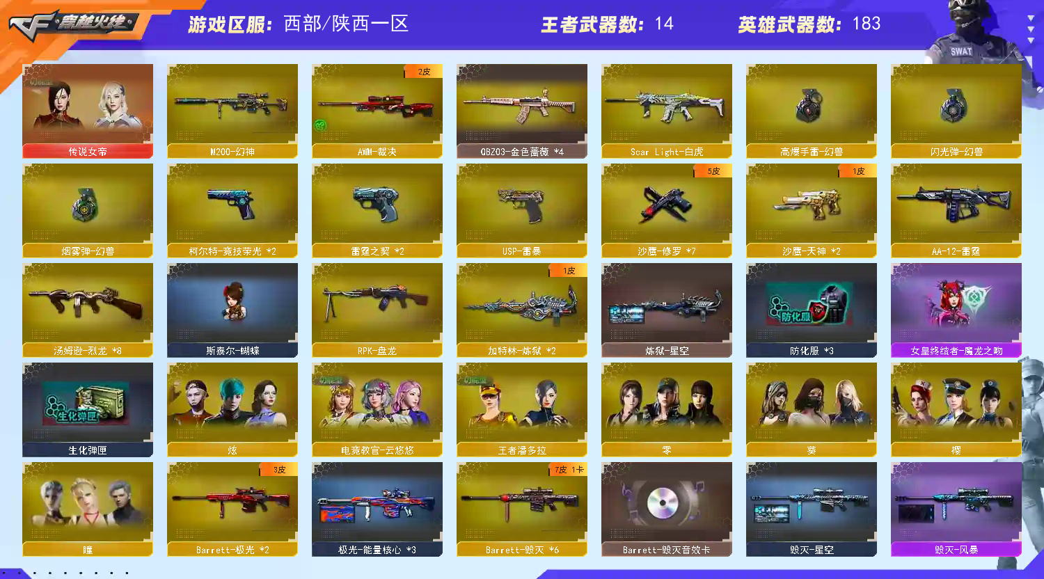 首页 > 租号大厅 > 穿越火线 > 电信区/陕西一区 > 【西.部】183V女帝幻神裁决白虎♥幻兽套USP雷暴雷霆×7♥竞技荣光套雷神毁灭冠军三件套♥精品双全