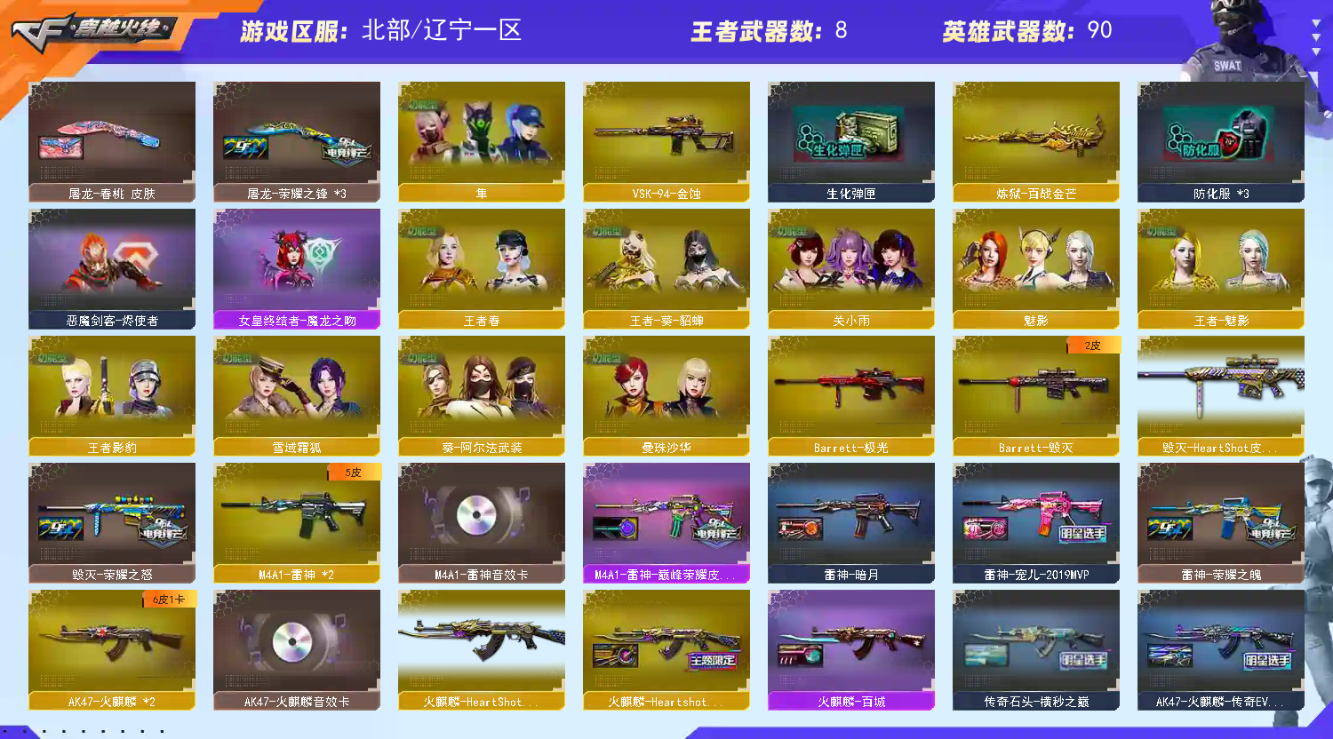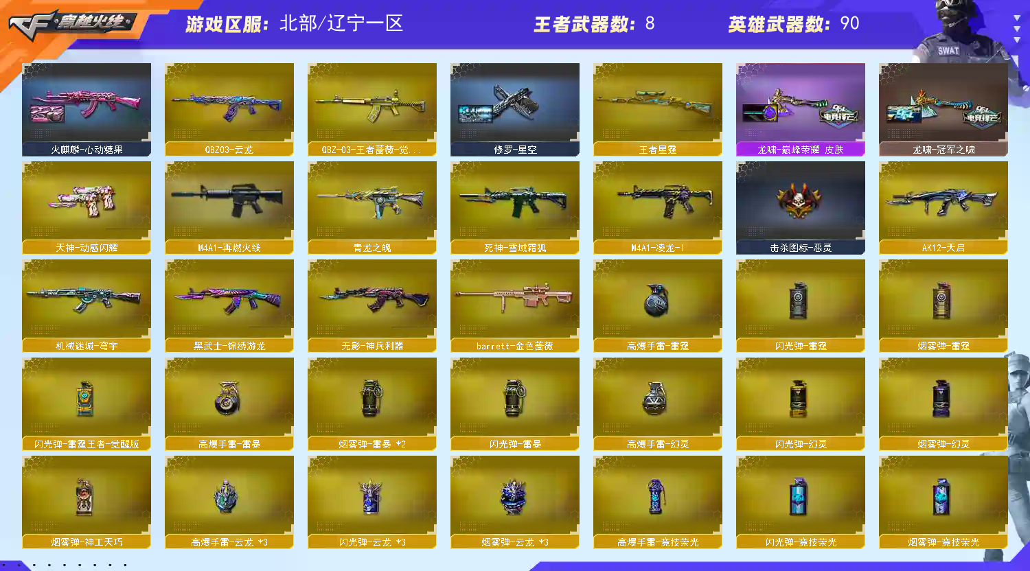 恶意开挂、开鼠标宏、开DMA导致账号封禁者、本店将起诉至法院索赔 新到北部【辽宁一区】紫金6 【传说影煞+幻神M200【荣耀世冠EP+电流骇客+HeartShot+荣耀世冠白鲨+传奇欧欧+降龙+音效卡】星神【CFS2025+璀璨+破竹+音效卡】+裁决【巅峰荣耀+流光秘银+羽掣+音效卡】+QBZ金色蔷薇【枪娘阿敏+荣耀世冠白鲨+音效卡】+白虎【热带奇洋】+G36C幻影+USP雷暴+COP云龙+荣耀世冠EP柯尔特+柯尔特荣耀世冠白鲨2023+COP雪域霜狐+冠军之特*4账号 稀有武器:QBZ云龙 QBZ古蛇迷踪 王者蔷薇 VSK94金蚀 王者星霆 柯尔特赛博朋克 人物:传说影煞 妮妮 关小雨 曼莎珠华 隼 魅影 奇洋探员 乔伊教练 蛇隐宗 王者春【四防】 王者葵貂蝉【四防】 王者魅影【四防】 王者影豹【四防】修道士 雪域霜狐 云海玲珑 音效卡:星神音效卡 幻神音效卡 裁决音效卡 雷神音效卡 QBZ音效卡 火麒麟音效卡 死神雪域霜狐怀旧音效卡 炼狱百战金芒音效卡 皮肤:【幻神-荣耀世冠EP+电流骇客+HeartShot+荣耀世冠白鲨+传奇欧欧+降龙】【星神-CFS2025+璀璨+破竹】【裁决-巅峰荣耀+流光秘银+羽掣】【QBZ金色蔷薇-枪娘阿敏+荣耀世冠白鲨】【白虎-热带奇洋】【雷神-暗月+巅峰荣耀+宠儿+HeartShot+荣耀之魄】【火麒麟-百城+心动糖果+枪娘格雷姐妹+HeartShot+横秒之巅+传奇EVEN】【毁灭-荣耀之怒+AG+百城浙江+HeartShot】【屠龙-春桃+彼岸花+荣耀之锋+巅峰荣耀】【龙啸-冠军之啸+巅峰荣耀】 小人枪:朱雀蛇隐宗 金色蔷薇空 毁灭孙三炮 COP白鲨 M37葵 雷套:雷霆套*1 雷暴套*1 堕天神套*1 夜魔套*1 幻灵套*1 竞技荣光套*1 云龙套*3 荣耀世冠EP烟雾弹*2 其他:白鲨炫彩背包 RLGD炫彩背包 XROCK炫彩背包 古蛇迷踪炫彩背包 热带奇洋炫彩背包 雪域霜狐炫彩背包 亚洲杯纪念炫彩背包 云海游龙炫彩背包 百战金芒炫彩背包;USP-雷暴,柯尔特-荣耀世冠白鲨2023,柯尔特-冠军之特,传说影煞,隼,妮妮,QBZ03-金色蔷薇,