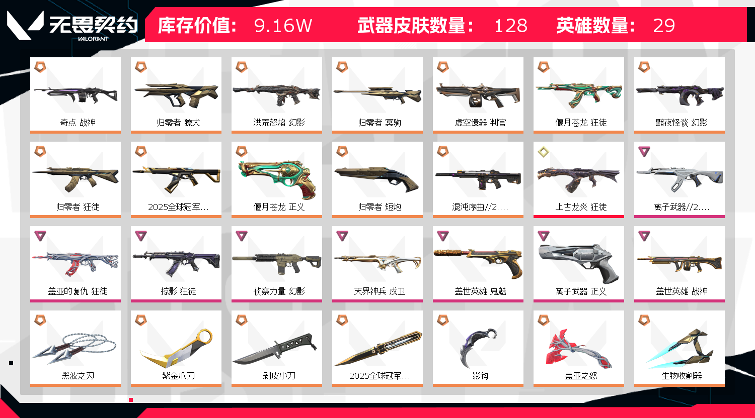 首页 > 租号大厅 > 无畏契约-wegame > wegame/wegame > 【上赛季钻石2】✅掠影20套25冠军套⚡混沌2.0侦查流脓✅黑波之刃RGX显卡紫金爪刀盖亚套归零者套