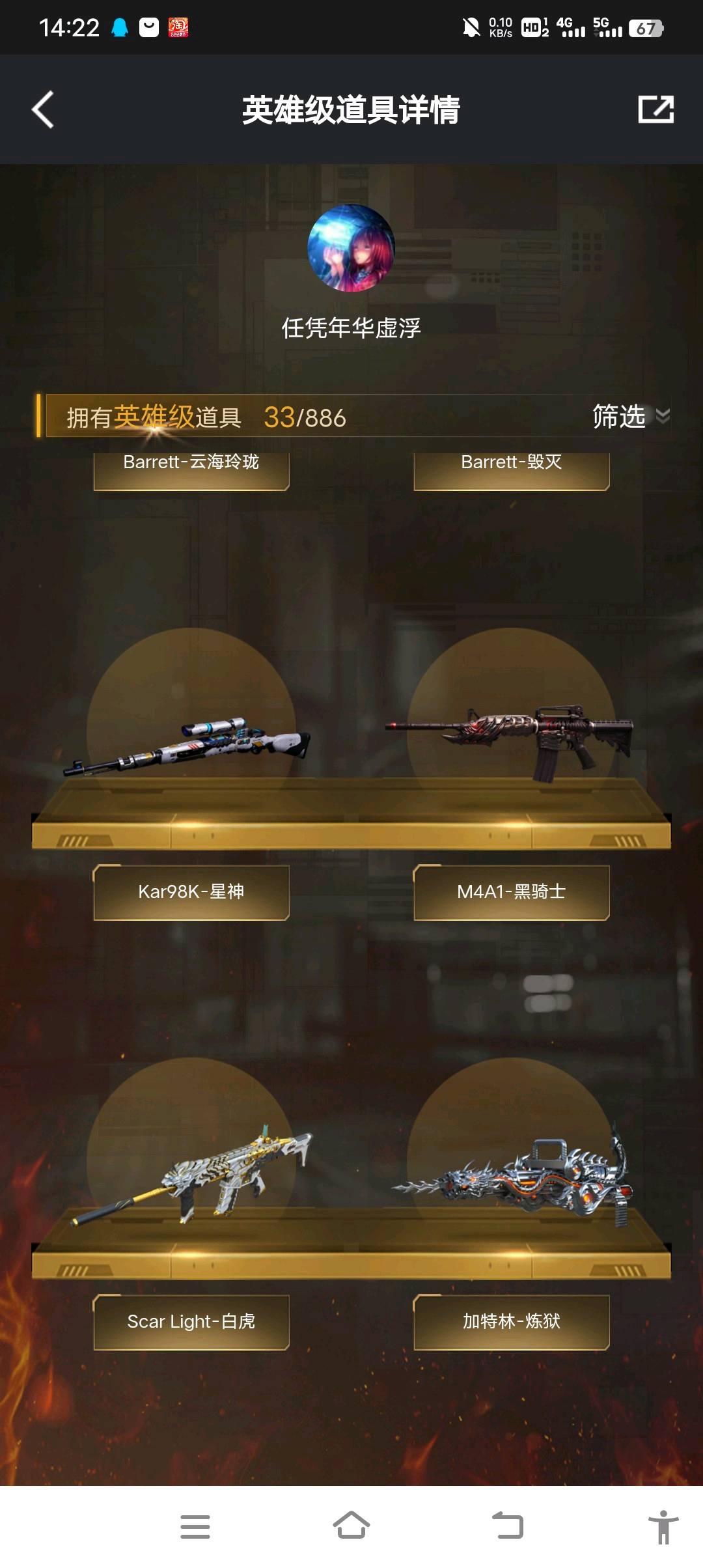 传说影煞/破晓/5烈龙/蝴蝶/迷你炼狱/清道夫/白虎/星神/炼狱音效卡/王者之武/尼泊尔-雷霆/斩神刀-雷暴/虎啸/钟馗/毁灭耀金/炫金火麒麟/黑骑士/雷神;传说影煞,G36C-幻影,Scar Light-白虎,Kar98K-星神,