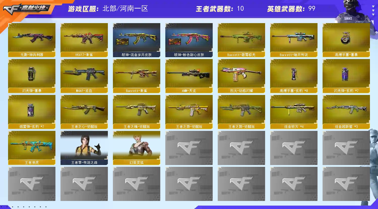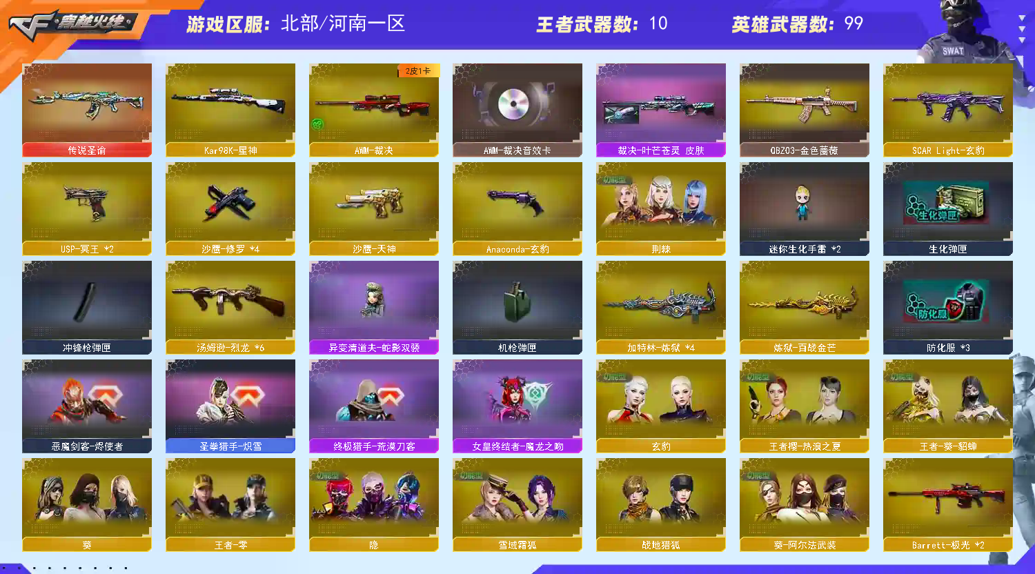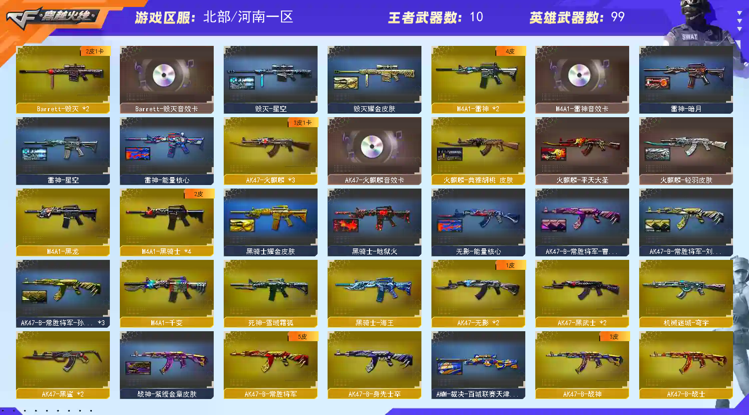 《传说圣谕》《星神》《毁灭 极光 裁决》《qbz金色蔷薇 王者凌虎 烈火 朱雀 千变 火麒麟 黑龙 雷神 黑骑士 黑武士》《6烈龙》《usp冥王 玄豹》《四防荆棘 四防玄豹 隐 幻面灵狐 葵阿尔法武装 乔伊教练 四防王者葵貂蝉 王者樱热浪之夏 裁决音效卡 毁灭音效卡 雷神音效卡 火麒麟音效卡》《火麒麟典雅胡桃 裁决叶芒苍灵 火麒麟CFSTAR》;QBZ03-金色蔷薇,Kar98K-星神,传说圣谕,