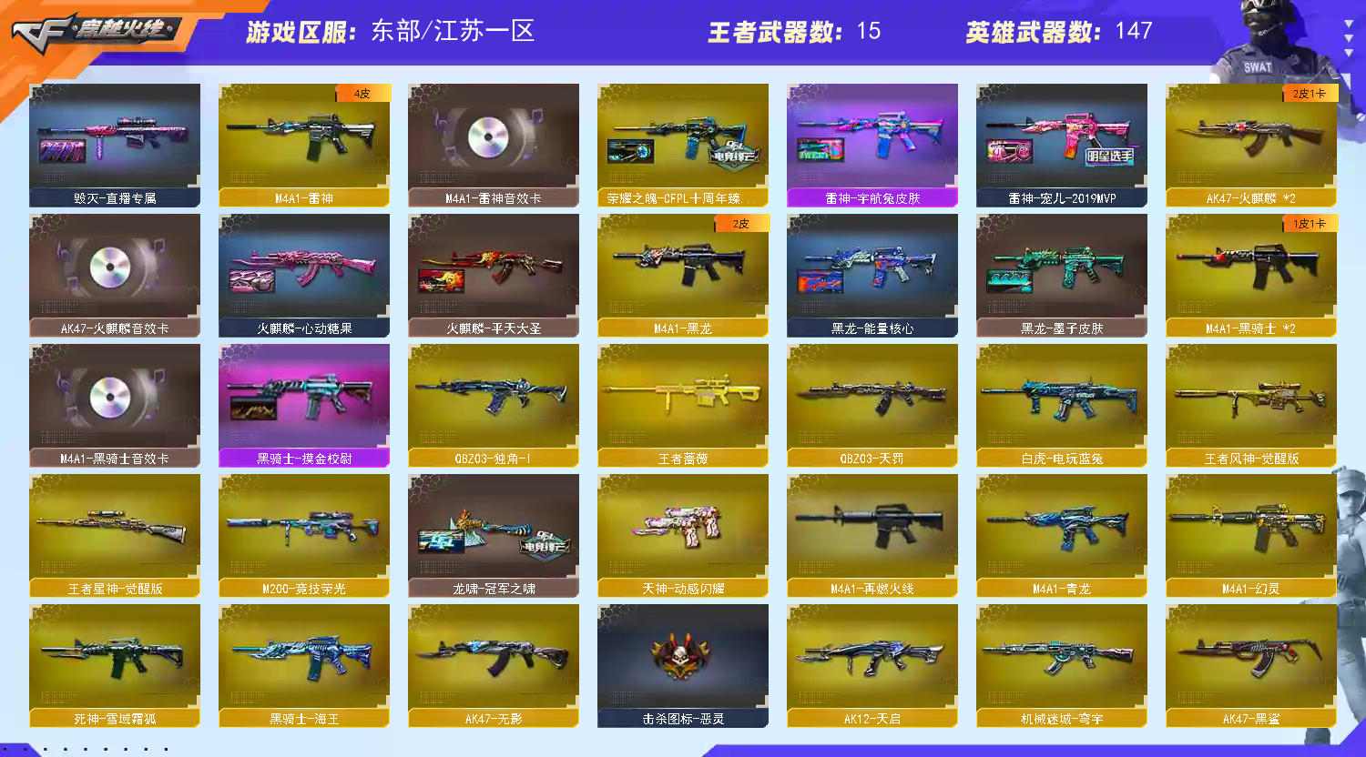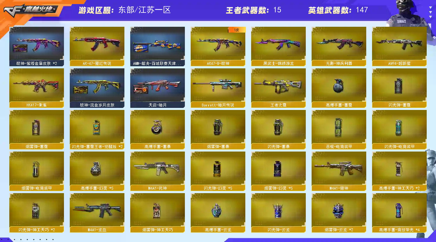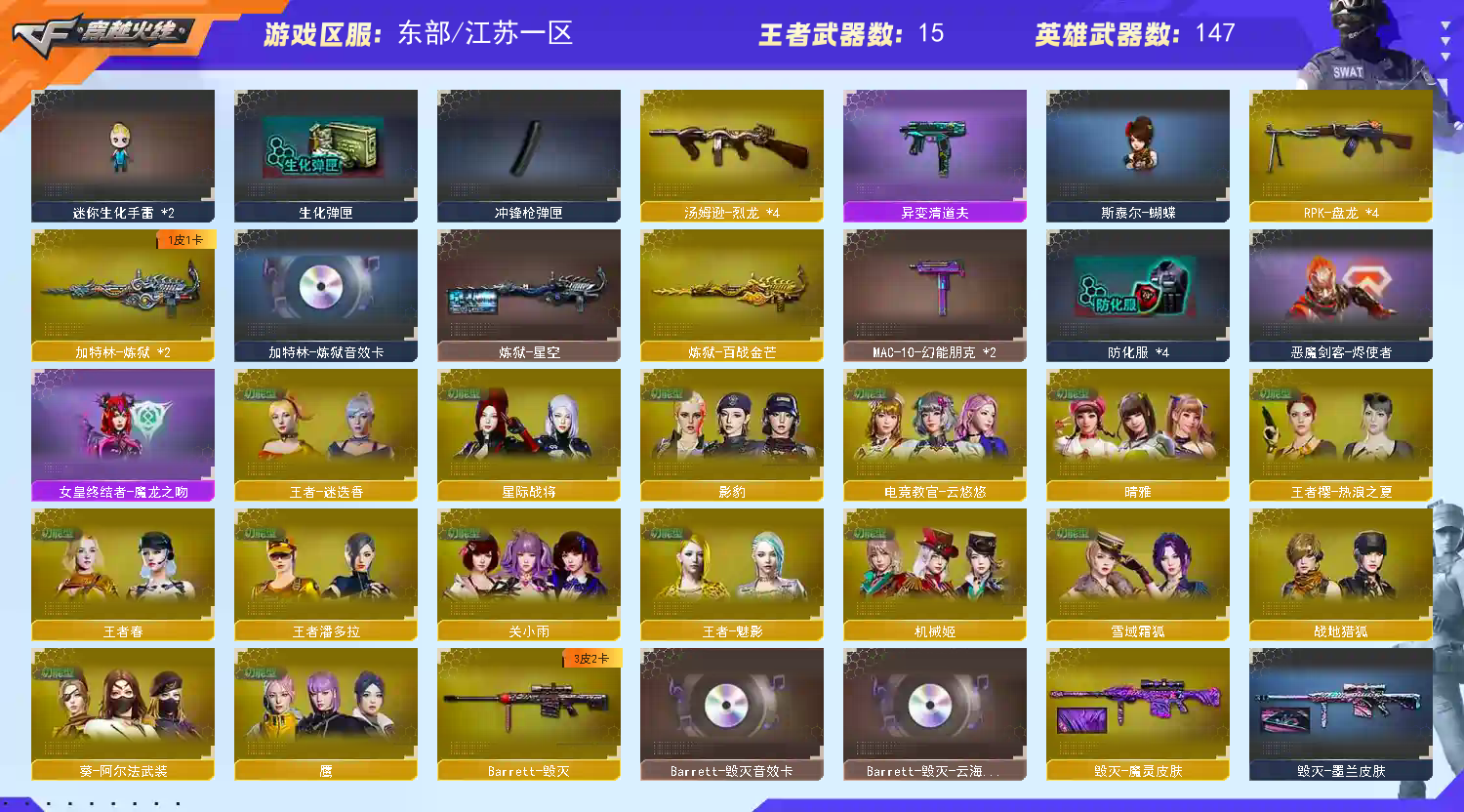 >>>>>>毁号,涉及毁坏虚拟财产罪及计算机安全罪,请文明游戏素质游戏,让我们共建美好租号平台>>>>>> 本游戏账号:英雄武器125个; 王者武器18个。 装备不多,但是主武器、副武器、近身武器够用 拥有完美游戏体验。重要的是,特殊装备有:柯尔特-荣耀世冠白鲨2023、黑骑士-海王、AN94-超新星、Kar98K-星神、麒麟刺-堕天神、烟雾弹-堕天神、闪光弹-堕天神、雷霆之锋、Scar Light-白虎、M4A1-黑骑士、M14EBR-玄武、M4A1-青龙、COP 357-幻灵、幻灵之锋、M4A1-幻灵、烟雾弹-神工天巧、高爆手雷-神工天巧、闪光弹-神工天巧、唐刀-神工天巧、AK47-火麒麟、HK417-朱雀、Barrett-毁灭、M200-幻神、QBZ03-金色蔷薇、M4A1-雷神、烟雾弹-竞技荣光、闪光弹-竞技荣光、高爆手雷-竞技荣光、柯尔特-竞技荣光、USP-雷暴、M200-竞技荣光、擎天-竞技荣光、加特林-炼狱、M4A1-黑龙、麒麟刺、王者破空枪刃、王者蔷薇、王者之锋-觉醒版、王者之霆、炫金火麒麟、炫金毁灭、王者冰魄-觉醒版、炫金雷神、传说女帝、关小雨、潘多拉、堕天使、王者-;USP-雷暴,柯尔特-荣耀世冠白鲨2023,炽芒蝶刃,传说女帝,隼,电竞教官-云悠悠,晴雅,