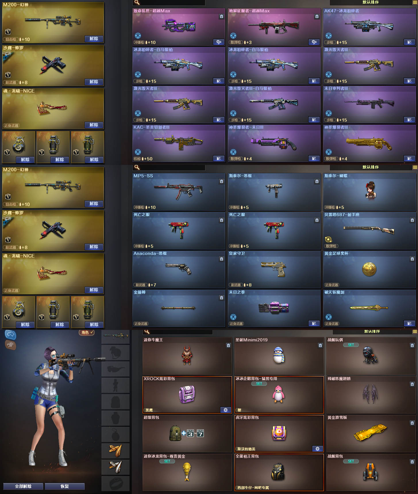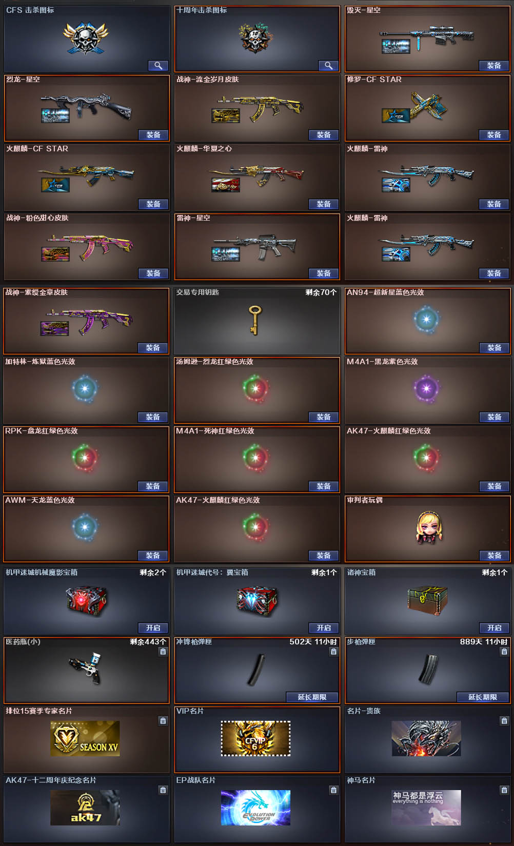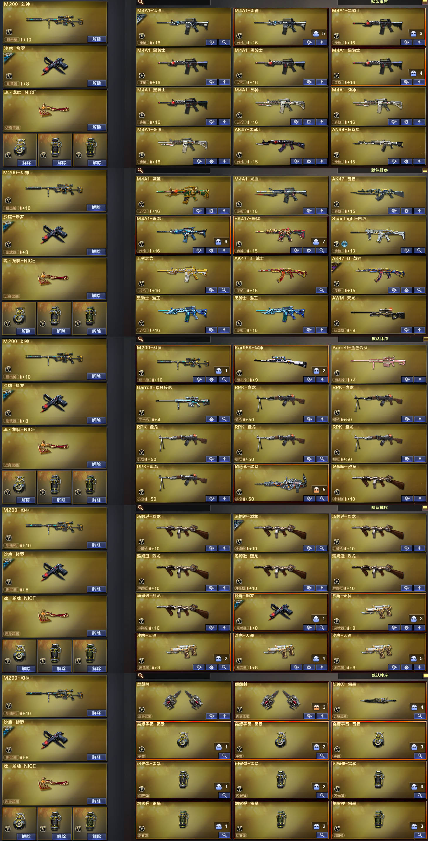 湖北一区,M200幻神,星神,青龙,朱雀,白虎,Bar金色蔷薇,雷暴,王者之势,武圣,6盘龙+炼狱,8烈龙+蝴蝶+死亡之眼*2,天神*4,修罗,致命乱世-超越Max,地狱征服者-超越Max,樱,虎牙背包,生化永久道具齐全,永久头盔,永久防弹衣,永久C4工具钳,永久手雷包,STAR,星空,流金,华夏之心,雷神,粉色甜心等等想请看图。;RPK-盘龙,M200-幻神,Scar Light-白虎,Kar98K-星神,