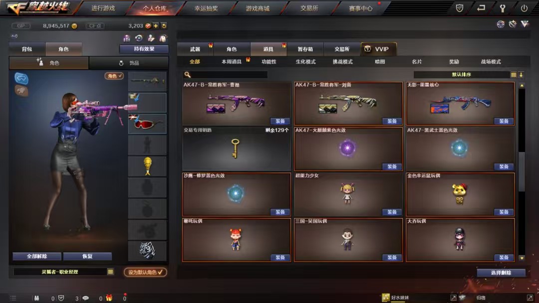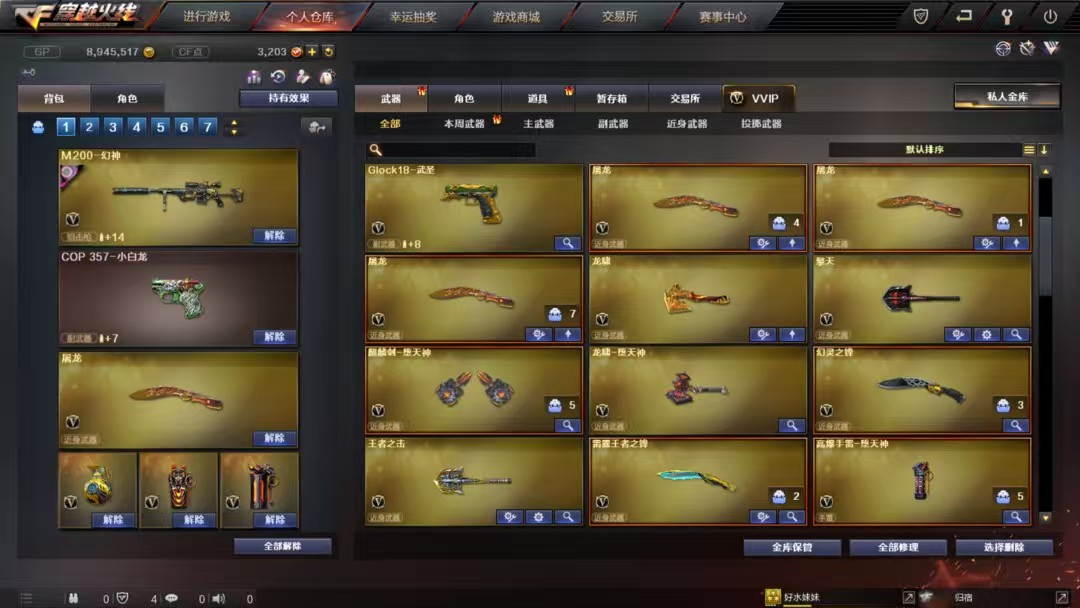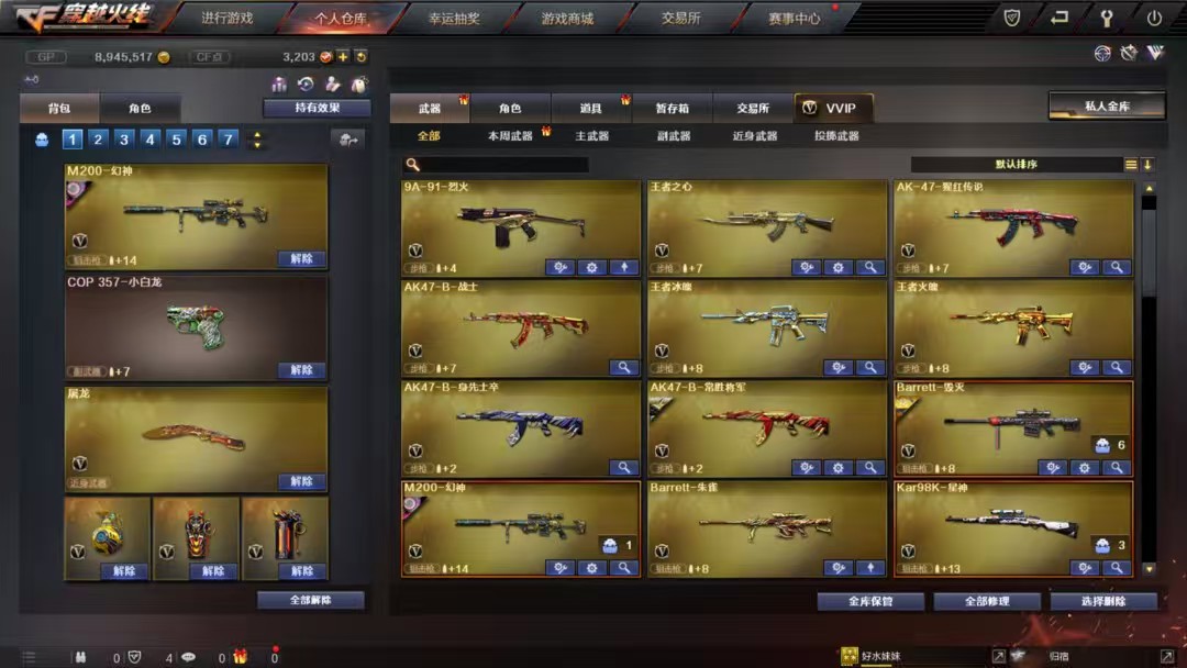 幻神宠儿周瑜音效、星神、王者冰魄、王者火魄、6烈龙+斯特尔蝴蝶、白虎、修罗*3、金刚伞、萝卜匕首、荣耀之证、王者小乔、职业经理、黄金海岸、龙儿、王者貂蝉等优质角色,音效*6,毁灭2020、盘古、白马银枪、雷神宠儿、光效玩偶齐全。;RPK-盘龙,QBZ03-金色蔷薇,M200-幻神,Scar Light-白虎,Kar98K-星神,