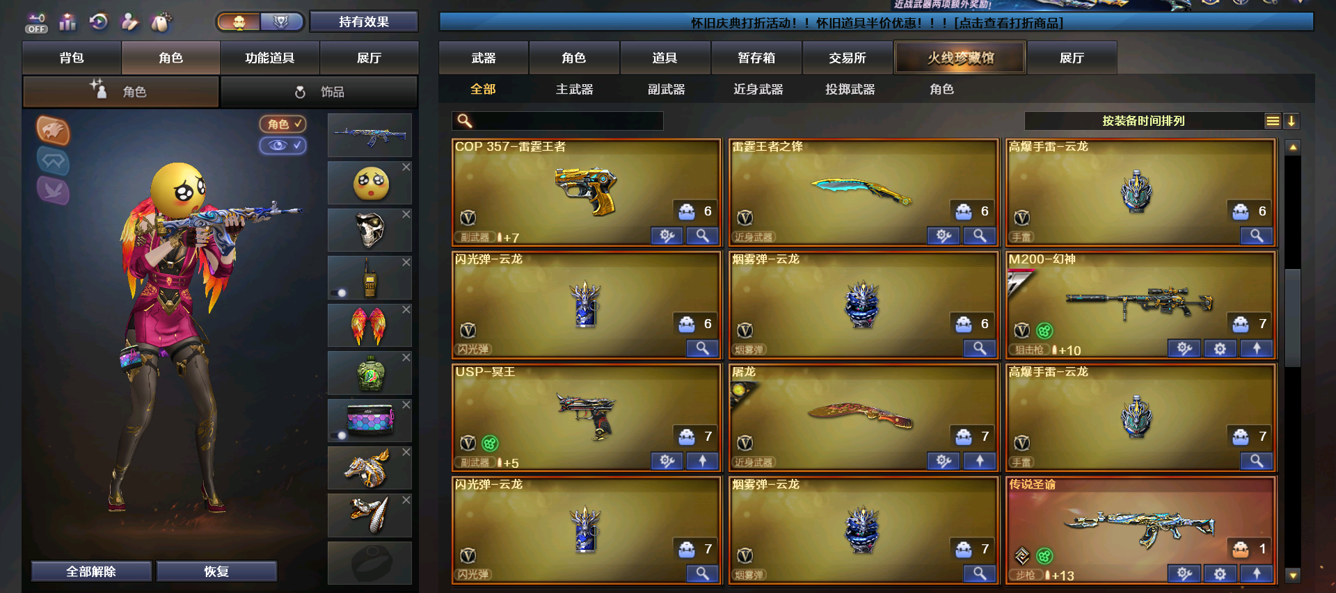 传说圣谕,传说影煞,幻神,星神,蝴蝶刀,鹰,王者雷暴,cop雷霆王者,uap冥王,蝴蝶,炼狱小刚。雷神皮肤音效卡,毁灭皮肤音效卡,黑骑士皮肤音效卡。云龙主副近,雷霆王者主副近,a背包7套手雷。67v,多个四防角色适应爆破生化。;