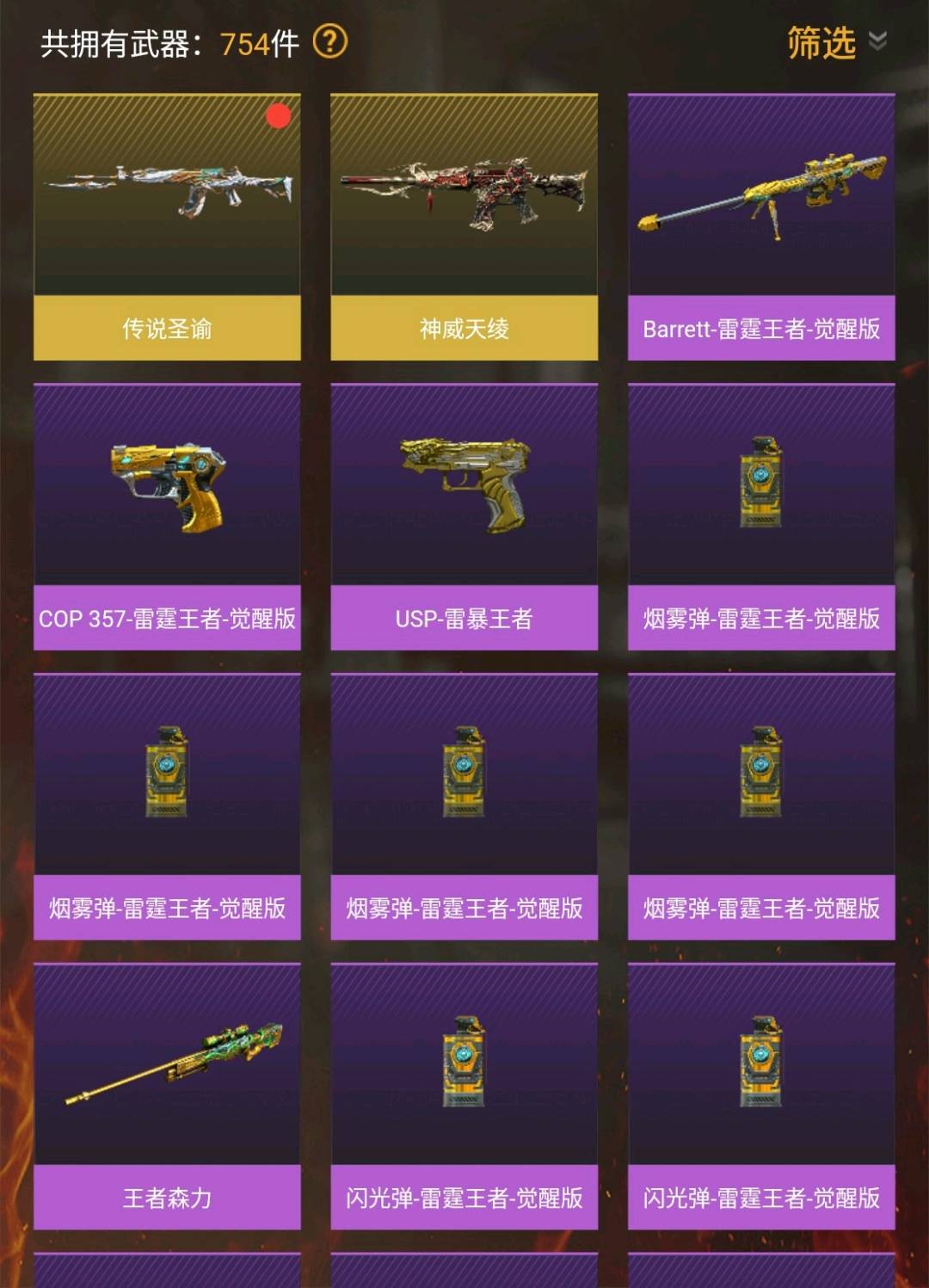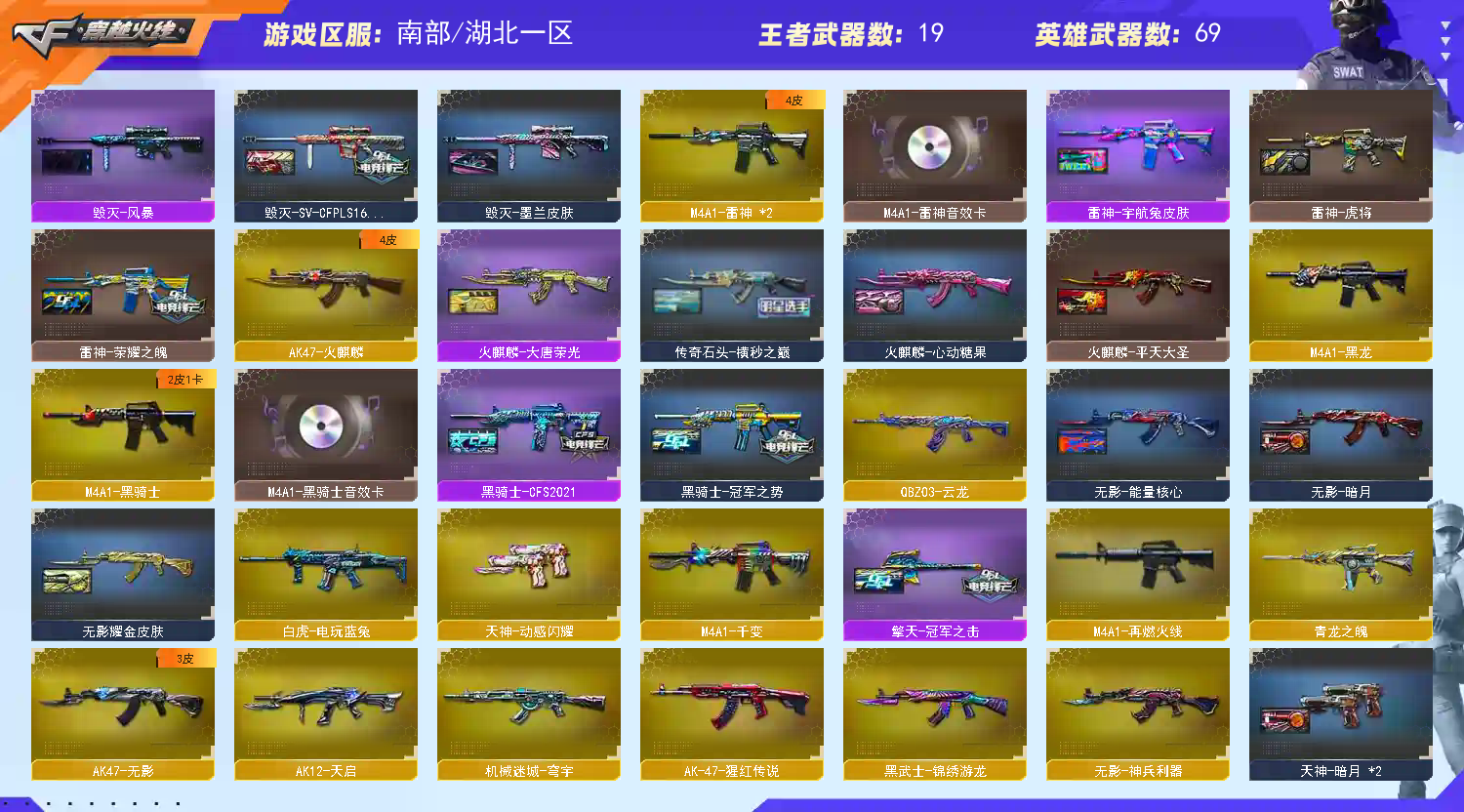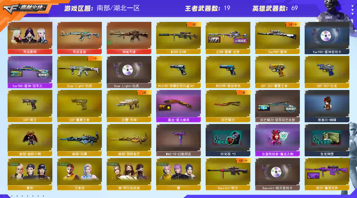 神威天绫,传说圣谕,传说影煞,幻神,星神,白虎,蝴蝶刀,鹰,王者雷暴,cop雷霆王者,uap冥王,蝴蝶,炼狱小刚。雷神皮肤音效卡,毁灭皮肤音效卡,黑骑士皮肤音效卡。云龙主副近,雷霆王者主副近,a背包7套手雷。67v,多个四防角色适应爆破生化。;USP-雷暴王者,柯尔特-荣耀世冠白鲨2023,炽芒蝶刃,传说影煞,M200-幻神,Scar Light-白虎,Kar98K-星神,