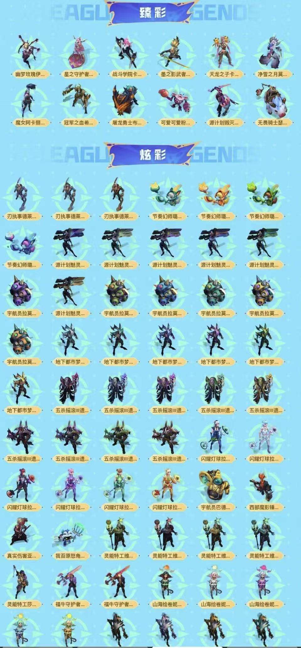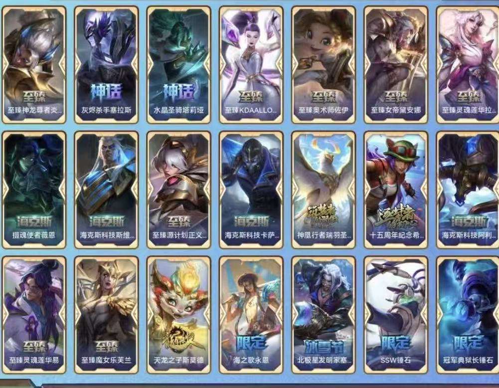 至臻卡莎、至臻奇亚娜、至臻女警、海克斯诺手、海克斯鳄鱼、钢铁拉克丝、克格汪、羊年金克丝、花木兰等优质皮肤