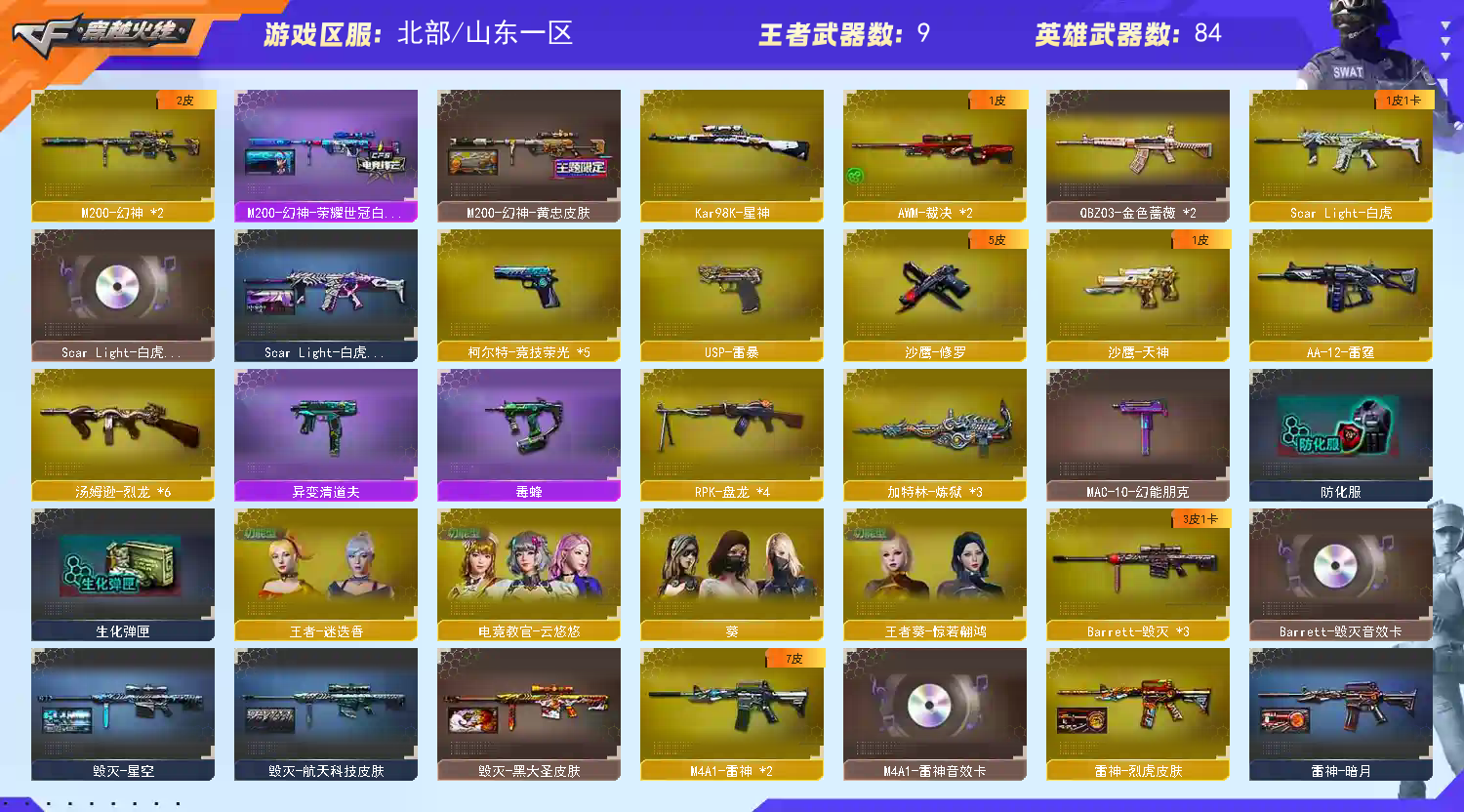 爆破生化号中意请租,希望大哥手下留情;USP-雷暴,电竞教官-云悠悠,RPK-盘龙,QBZ03-金色蔷薇,M200-幻神,Scar Light-白虎,Kar98K-星神,