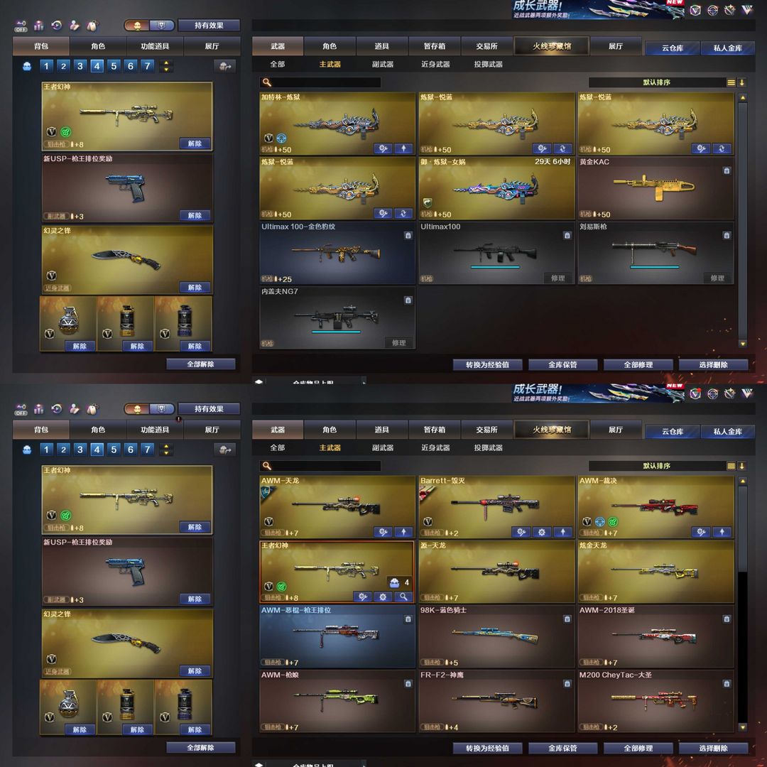 王者幻神❤️AWM天龙 火麒麟 雷神❤️QBZ金色蔷薇❤️加特林❤️复仇者❤️王者玲珑❤️usp枪王