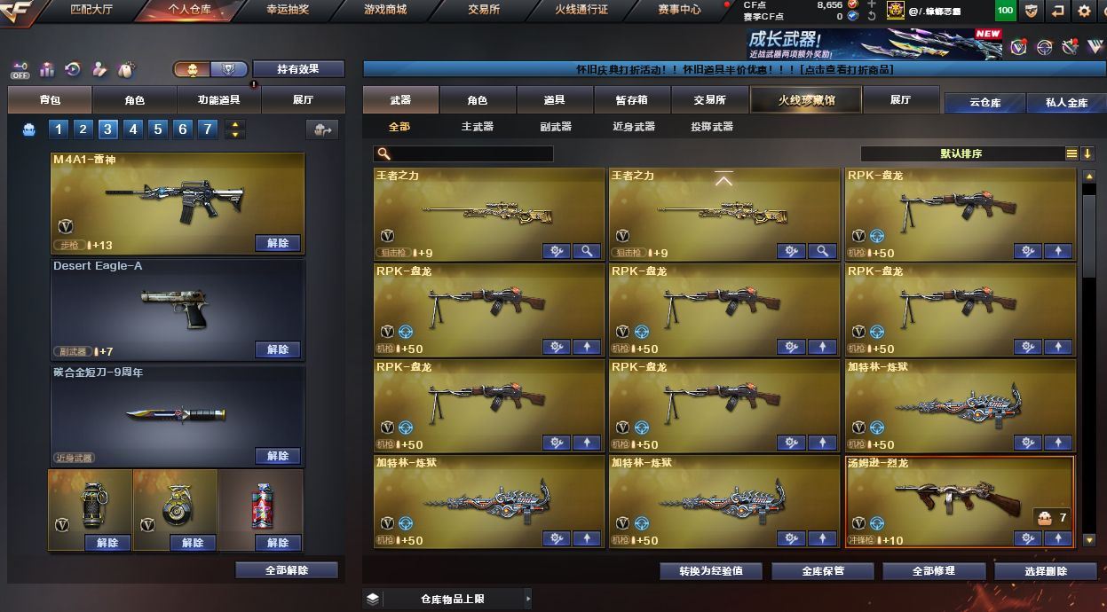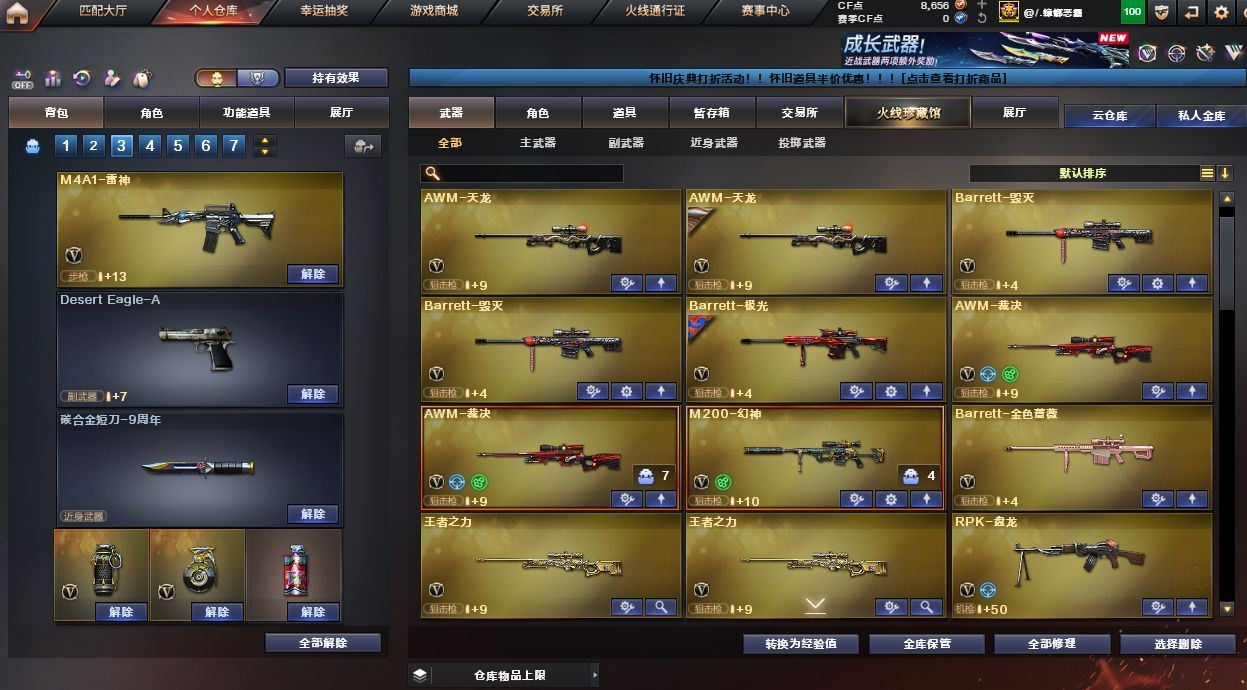【M200-幻神】【AWM-裁决(2)】【Scar Light-白虎】【QBZ03-金色蔷薇】【王者之力-觉醒版(2)/王者之魄-觉醒版/王者之心-觉醒版/王者之锋-觉醒版】【沙鹰-天神(3)/沙鹰-修罗(3)/柯尔特-竞技荣光(2)/USP-雷暴】【麒麟刺/龙啸(6)/擎天(3)+擎天-竞技荣光/屠龙(2)/幻灵之锋/斩神刀-雷暴】【6盘龙/8烈龙/3炼狱】 【斯泰尔-蝴蝶】【王者之戮/超新星-悦享/雷霆王者之锋/王者之刺】【葵/魅影/影豹/电竞教官-云悠悠/职业选手/空/灵狐者-黄金海岸】【M4A1-雷神音效卡/M4A1-黑骑士音效卡/Barrett-毁灭音效卡/Barrett-极光音效卡】【毁灭耀金皮肤/毁灭-墨兰皮肤/毁灭-魔灵皮肤/极光-能量核心/天龙-秘银/火麒麟-CFSTAR/火麒麟-战神关羽/AK47-黑武士-361/M4A1-雷神-巅峰荣耀皮肤/雷神-R.LGD-CFPLS18冠军/雷神-冠军之魄/雷神-虎将/雷神-耀金皮肤/雷神-能量核心/雷神-星空/黑骑士耀金皮肤/黑骑士-暗月/黑龙-暗月/战神-流金岁月皮肤/战神-紫绶金章皮肤/修罗-星空/屠龙-荣耀之锋】【Barrett-毁灭(2)/Barrett-极光/barrett-金色蔷薇/AWM-天龙(2)/M4A1-雷神(4)/M4A1-黑龙/M4A1-龙血/M4A1-千变(2)/M4A1-黑骑士/M4A1-武圣/M4A1-玫瑰精灵/AK12-天启/AK47-火麒麟(2)/AK47-黑鲨/AK47-黑武士/AK-47-猩红传说(2)/AK47-B-战士/9A91-烈火】;USP-雷暴,电竞教官-云悠悠,RPK-盘龙,QBZ03-金色蔷薇,M200-幻神,Scar Light-白虎,