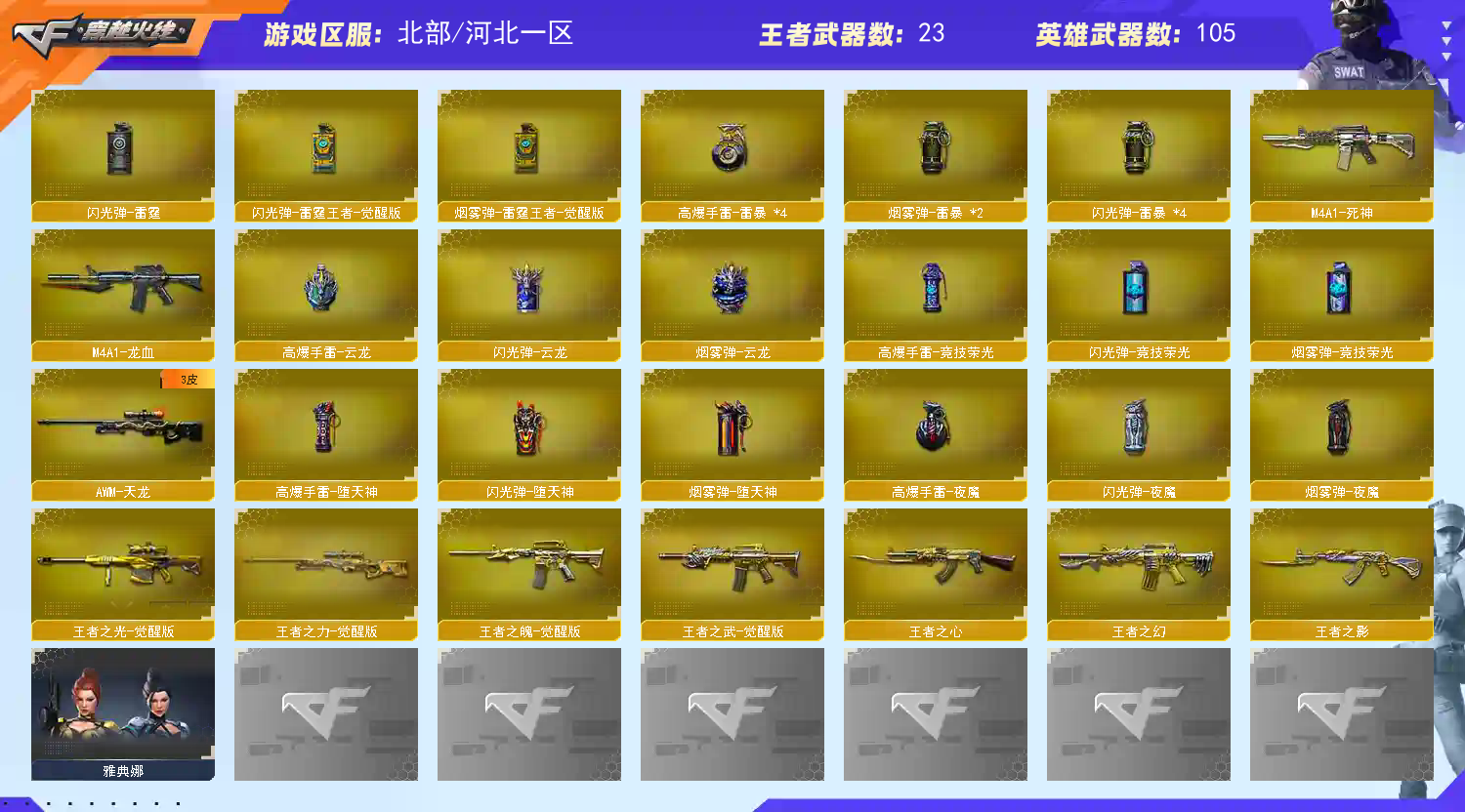 传说破晓/Barrett金色蔷薇蛇姬 /毁灭CFPL冠军/毁灭百城浙江 /毁灭星空/毁灭耀金/毁灭暗月/毁灭秦师 /极光能量核心/天龙传奇70KG/天龙传奇白鲨/_零/_葵/_樱/_瞳/魅影/M200-幻神/Barrett-毁灭/Barrett-极光/barrett-金色蔷薇/Barrett-暗月传说/雷暴套装/云龙套装/M200-幻神音效卡/Kar98K-星神音效卡/M4A1-雷神音效卡/M4A1-黑骑士音效卡/死神-雪域霜狐-怀旧音效卡/Barrett-毁灭音效卡(截图展示段位不代表实际段位,如赛季更新等不可抗拒因素发生变化、时限道具不保证所剩时间,其余道具看截图或咨询客服);USP-雷暴,电竞教官-云悠悠,晴雅,RPK-盘龙,QBZ03-金色蔷薇,M200-幻神,Scar Light-白虎,