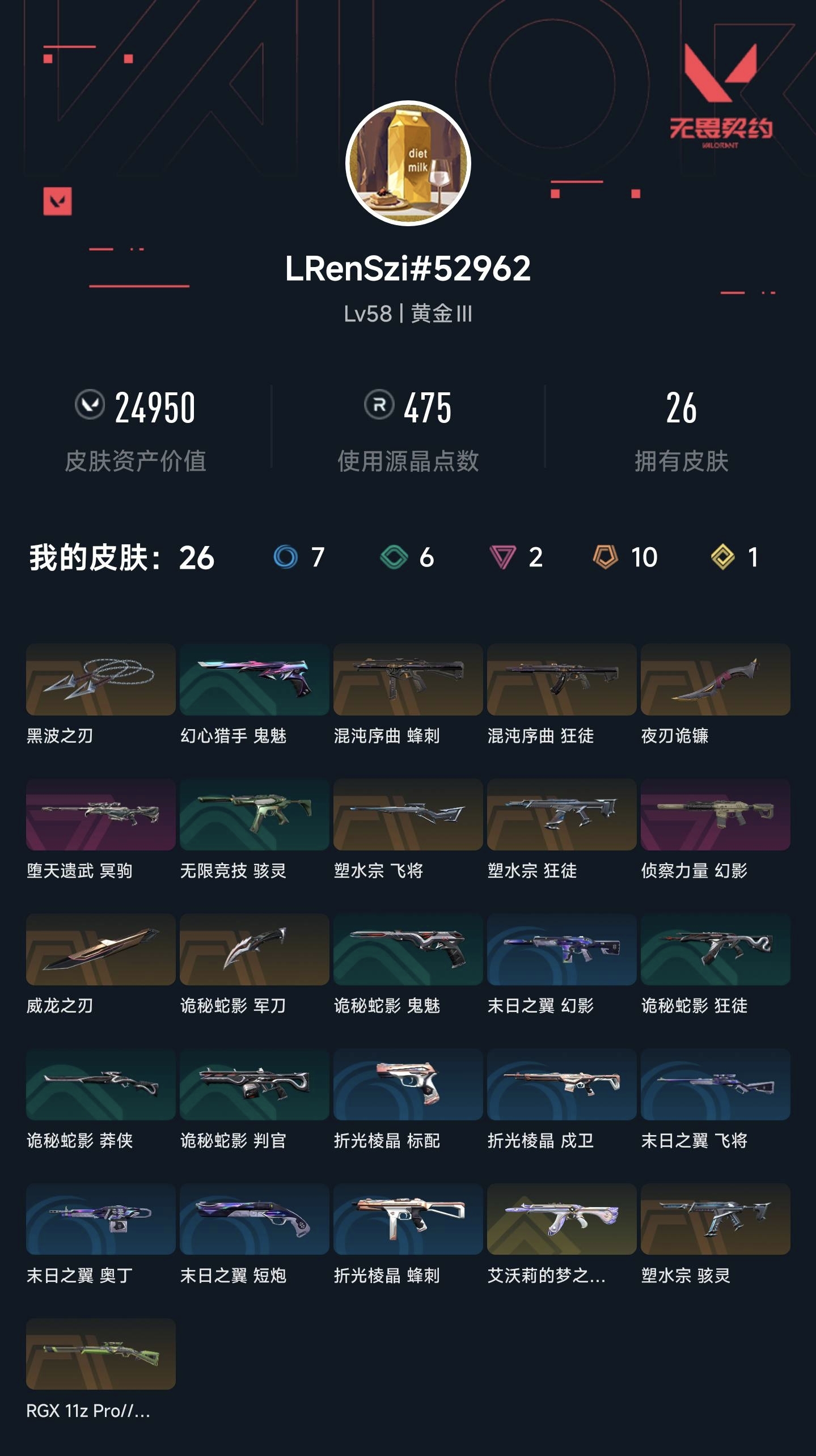 首页 > 租号大厅 > 无畏契约-wegame > wegame/wegame > 黑波之刃+威龙+诡镰/塑水+猫猫+混沌狂徒/侦察幻影/堕天冥驹/RGX莽侠/塑水飞将+骇灵/混沌蜂刺