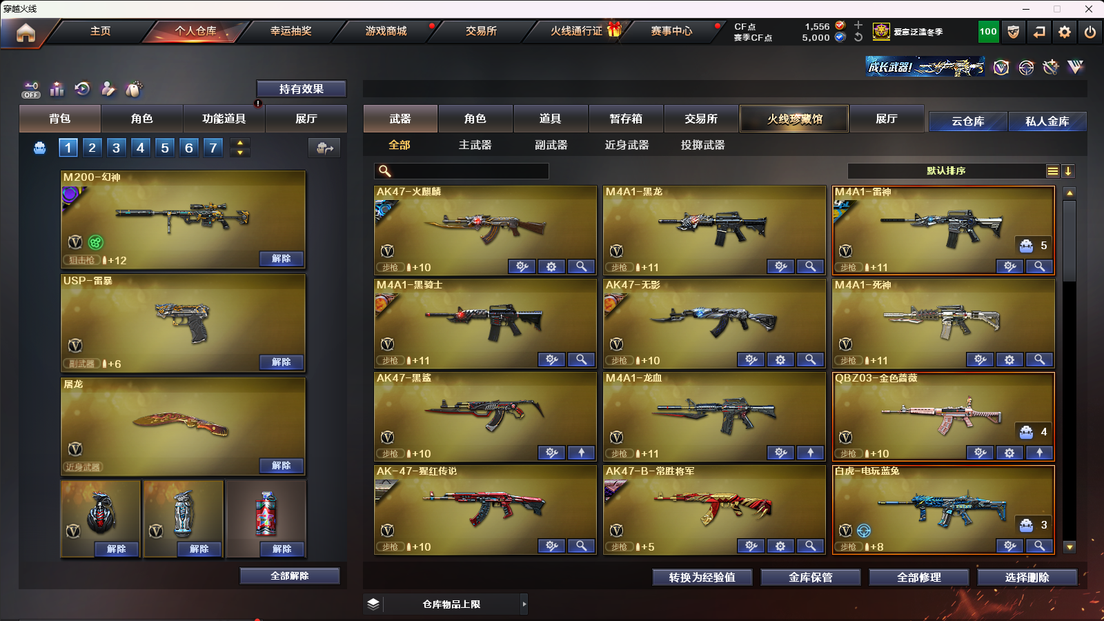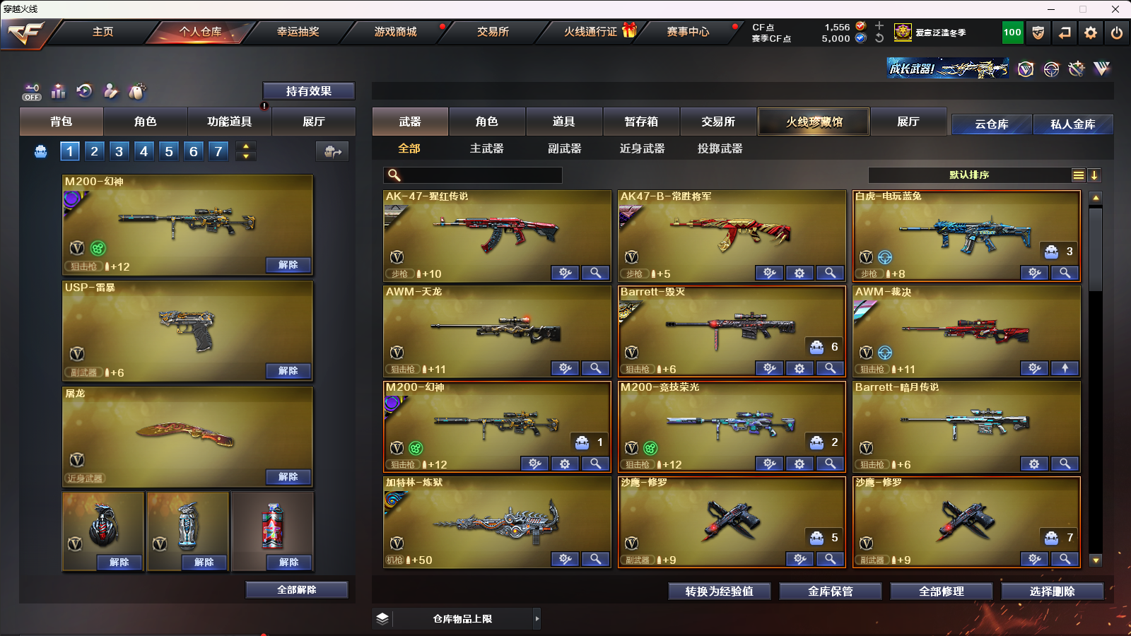 幻神➕巅峰荣耀➕幻神音效卡➕竞技荣光白虎荣耀之魄荣耀之怒➕四防角色冠军之特雷暴;USP-雷暴,柯尔特-冠军之特,炽芒蝶刃,电竞教官-云悠悠,QBZ03-金色蔷薇,M200-幻神,Scar Light-白虎,