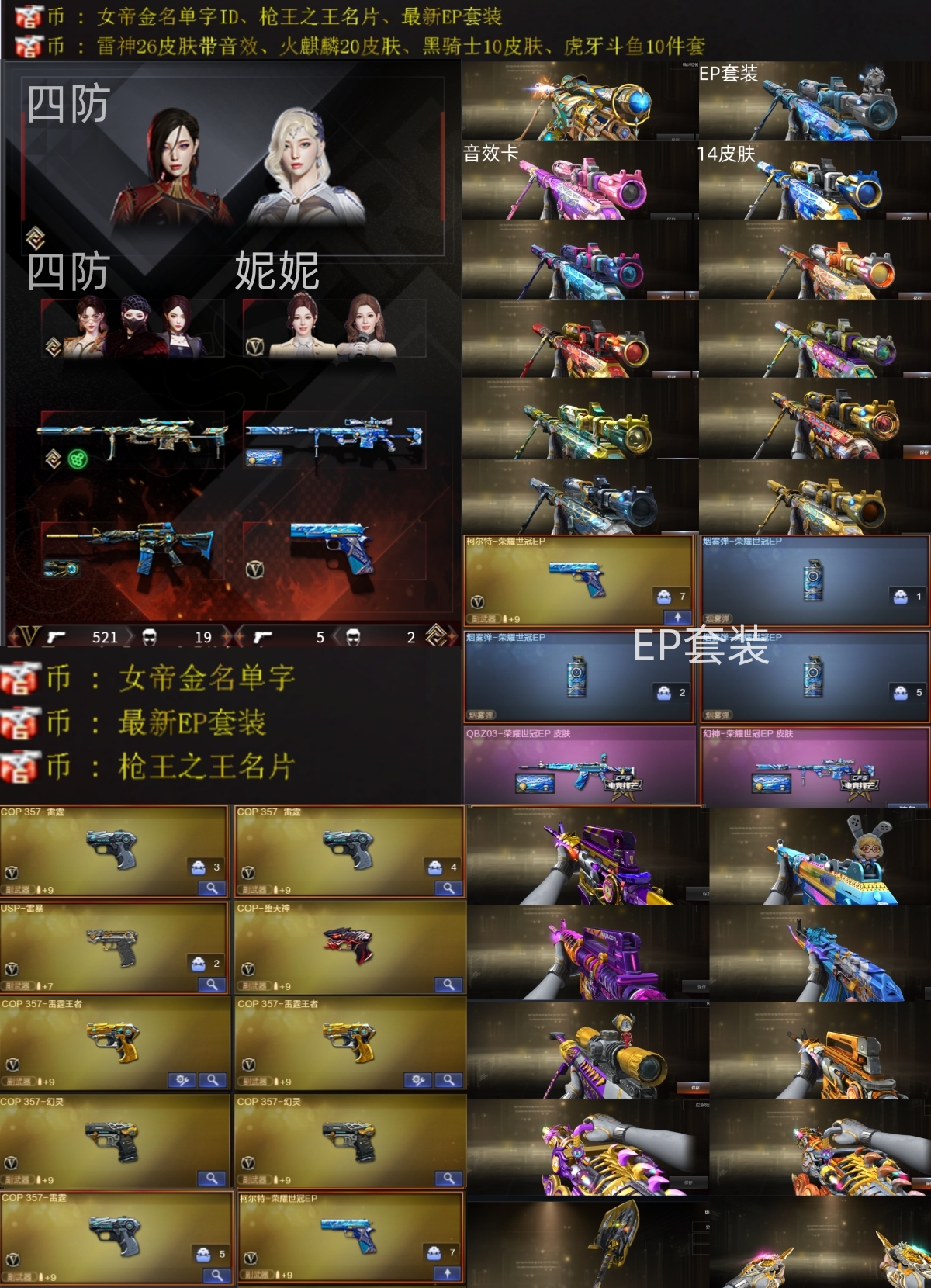 女帝金名单ID:币、灵眸&幻神14皮、裁决流光三件套&星神三件套、虎牙&斗鱼10件套、图鉴75%;