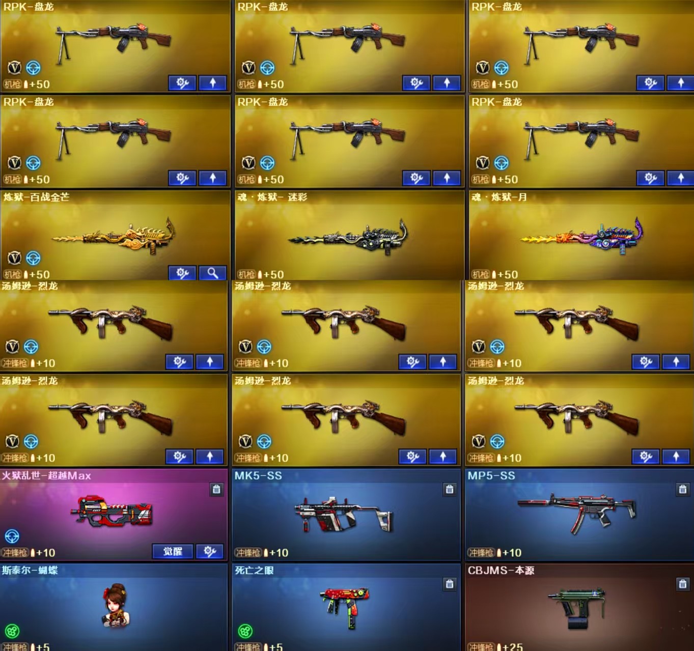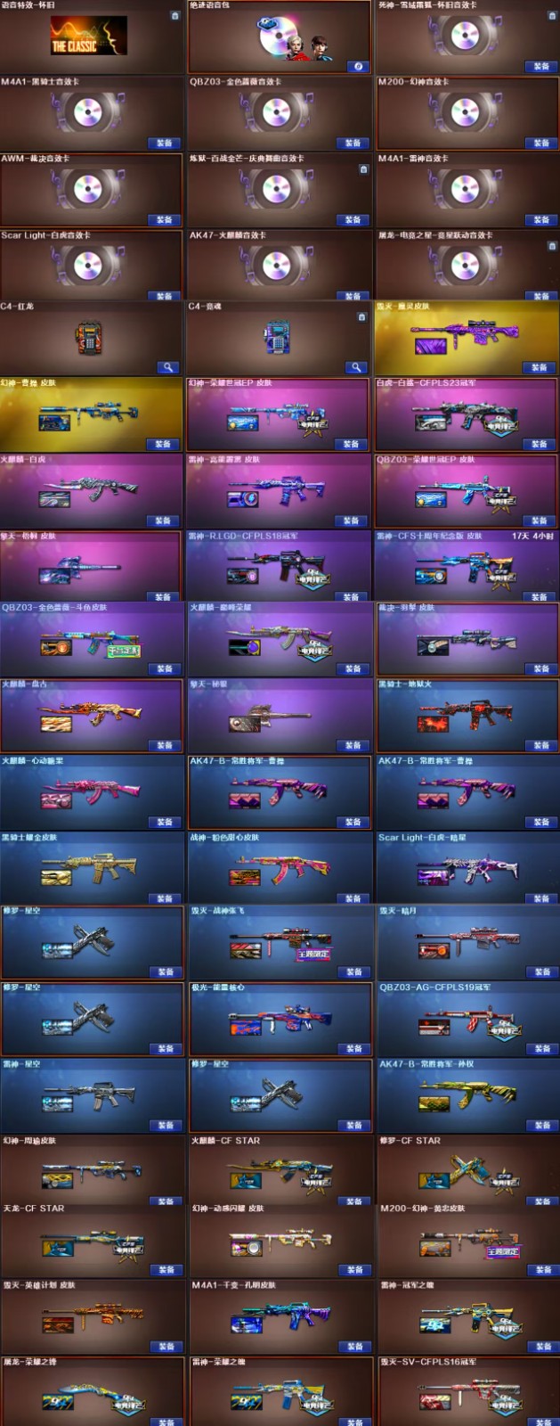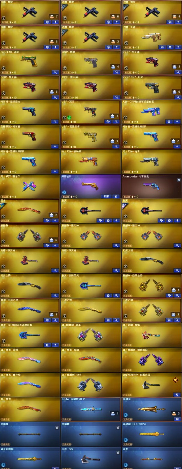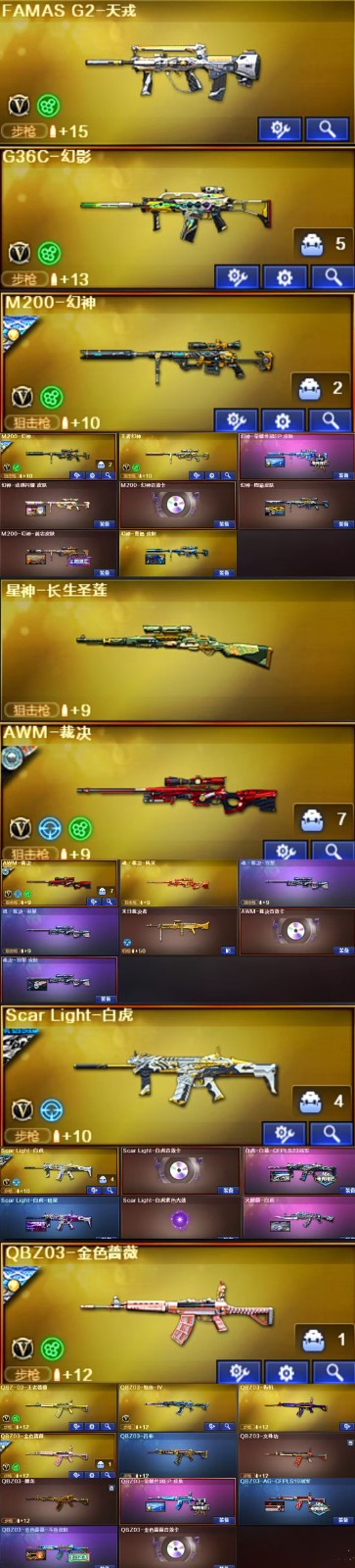 王者武器】:【QBZ-03-王者蔷薇-觉醒版-1,USP-雷暴王者-1,王者之刺-觉醒版-1,王者之影-觉醒版-1,王者之武-觉醒版-1,王者之锋-觉醒版-1,王者幻神-觉醒版-1,闪光弹-雷暴王者-5,高爆手雷-雷暴王者-4,炫金千变-1,炫金超新星-1】 【英雄武器】:【M4A1-死神-1,AK12-天启-1,M4A1-武圣-1,M4A1-黑骑士-1,屠龙-1,麒麟刺-1,AK47-火麒麟-3,Barrett-毁灭-2,汤姆逊-烈龙-6,Barrett-极光-1,RPK-盘龙-6,沙鹰-修罗-5,沙鹰-天神-1,Glock18-武圣-1,M4A1-雷神-1,9A91-烈火-1,M200-幻神-1,USP-雷暴-1,黑武士-CF网剧冠军-1,M200-竞技荣光-1,天神-CF网剧冠军-1,幻灵之锋-2,擎天-CF网剧冠军-1,擎天-竞技荣光-1,机械迷城-穹宇-1,柯尔特-竞技荣光-1,烟雾弹-竞技荣光-4,闪光弹-竞技荣光-3,高爆手雷-竞技荣光-4,Scar Light-白虎-1,传说光耀-1,无影-神兵利器-1,AA-12-雷霆-1,Barrett-暗月传说-1,QBZ03-金色蔷薇-1,FAMAS G2-天戎-1,USP-冥王-1,烟雾弹-玄豹-3,G36C-幻影-1,擎天-2,M4A1-堕天神-1,COP-堕天神-3,AWM-裁决-1,高爆手雷-堕天神-7,龙啸-堕天神-2,麒麟刺-堕天神-2,闪光弹-堕天神-7,烟雾弹-堕天神-7,M4A1-青龙-1,AK47-B-常胜将军-1,AK47-B-身先士卒-1,传说圣谕-1,COP 357-幻灵-1,M4A1-幻灵-1,传说圣灵-1,烟雾弹-幻灵-7,荣耀世冠-柯尔特-1,闪光弹-幻灵-6,高爆手雷-幻灵-6,M4A1-猎神-1,AK47-B-战士-1,Barrett-朱雀-1】;USP-雷暴,USP-雷暴王者,荣耀世冠-柯尔特,传说女帝,电竞教官-云悠悠,RPK-盘龙,QBZ03-金色蔷薇,