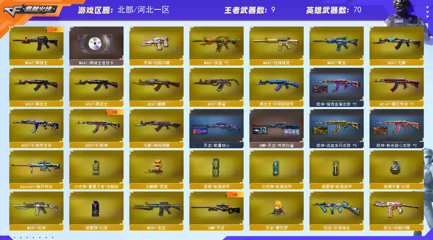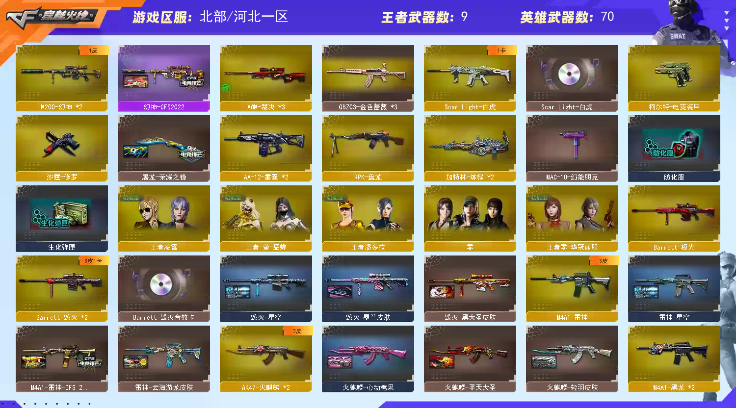 【m200幻神+cfs2022】【scar白虎+卡】【qbz金色蔷薇】【火麒麟】【黑龙】【雷神】【黑骑士+卡】【毁灭+卡】【极光】【裁决 】【武器:武圣 青龙 盘龙 炼狱*2 烈龙】【3手枪:修罗 天神 电竞装甲 】【15刀具:屠龙*4 龙啸 擎天*2 麒麟刺*3 屠龙 王者之啸*2 】【雷套:电竞装甲】【小人枪:雷神精英刀锋 火麒麟灵狐 天龙曼陀罗 天龙乔伊教练 cop白鲨】【音效卡:毁灭音效卡 白虎音效卡 黑骑士音效卡 】【四防角色:王者葵貂蝉 王者潘多拉 】;RPK-盘龙,QBZ03-金色蔷薇,M200-幻神,Scar Light-白虎,
