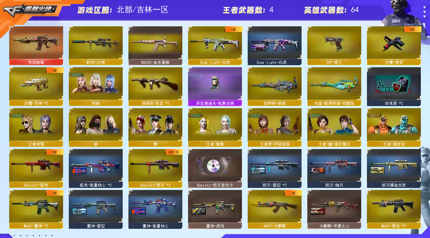 【传说暗裔】【M200 - 幻神】【USP - 冥王】【Scar Light - 白虎 + Scar Light - 白虎 - 暗星】【QBZ03 - 金色蔷薇】【2 烈龙 + 烈龙 - 星空 + 烈龙 - 云海游龙】【1 炼狱】【M4A1 - 雷神 (2)+ 雷神 - 葫芦兄弟 + 雷神 - 源计划 2.0 专属皮肤 + 雷神 - 虎将 + 雷神 - 能量核心 + 雷神 - 星空】【AK47 - 火麒麟 + 火麒麟 - CFSTAR + 火麒麟 - 华夏之心】【Barrett - 毁灭 (3)+ 毁灭 - 星空 + 毁灭耀金皮肤 + 毁灭 - 暗月 + Barrett - 毁灭音效卡】【M4A1 - 黑骑士 (3)+ 黑骑士 - 海王 + 黑骑士 - 暗月】【葵 / 樱 / 荆棘 / 王者 - 救世主 / 王者 - 魅影 / 王者 - 瞳 - 闭月羞花 / 王者零 - 华冠丽服 / 王者凌霄 / 代号:翼 / 铁扇公主 / 虚空 / 乔伊教练 / 幽 / 云海玲珑 / 兰 - 梨园特工】【Barrett - 极光 /barrett - 金色蔷薇 / 王者凰鸣 - 觉醒版 / 王者之怒 - 觉醒版 (2)/AWM - 天龙 (2)/M4A1 - 青龙 / M4A1 - 黑龙 (2)/M4A1 - 龙血 / M4A1 - 武圣 / M4A1 - 玫瑰精灵 / AK12 - 天启 / AK47 - 无影 (2)/ 无影 - 神兵利器 / AK47 - 黑鲨 / AN94 - 超新星 / 烈火 - 动感闪耀 / 悦蓝 - 惊涛骇浪 - 觉醒版 / 天神 - 动感闪耀 / 沙鹰 - 天神 (2)/ 沙鹰 - 修罗 / Glock18 - 武圣 / 麒麟刺 / 龙啸 (2)/ 擎天 (3)/ 擎天 - 云海游龙 / 屠龙 - 动感闪耀 / 屠龙 / 幻灵之锋 / 丛林匕首 - 玄豹 / 龙啸 - 烈火龙威】【白虎 - 迷你小艾 (2)/ 雷神 - 小红 / AWM - 灵狐 - 15 周年嘉年华 / 异变清道夫 - 蛇影双骄 / 夺魂 (3)/ 迷你曼提柯尔 / 迷你火种 (3)/ 迷你白狐 / Mini 沃特 X (2)/ 魔能飞环 - 曼陀罗 (2)/ 迷你裂空之翼 (3)/ 迷你波特博士 (3)/ 冰火魔兽】【Barrett - 极光 - 能量核心】【AK47 - 无影 - 暗月 + AK47 - 无影 - 能量核心】【AK47 - 黑武士 - 361】【M4A1 - 千变 - 孔明皮肤】【AK12 - 天启 - 暗月】【沙鹰 - 修罗 - CFSTAR + 沙鹰 - 修罗 - 能量核心】【沙鹰 - 天神 - 暗月】【牛魔王玩偶 - 至尊黄金】;QBZ03-金色蔷薇,M200-幻神,Scar Light-白虎,传说暗裔,