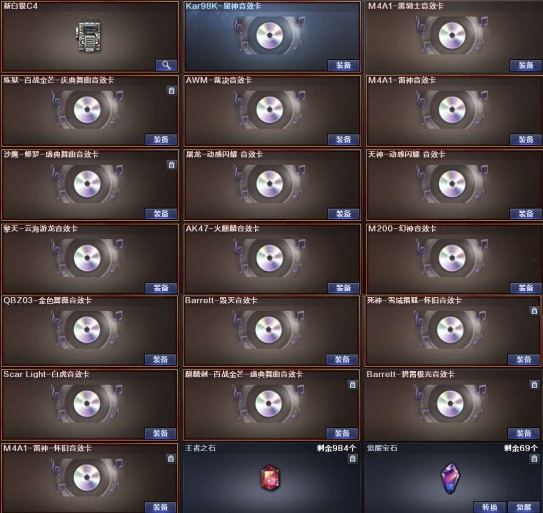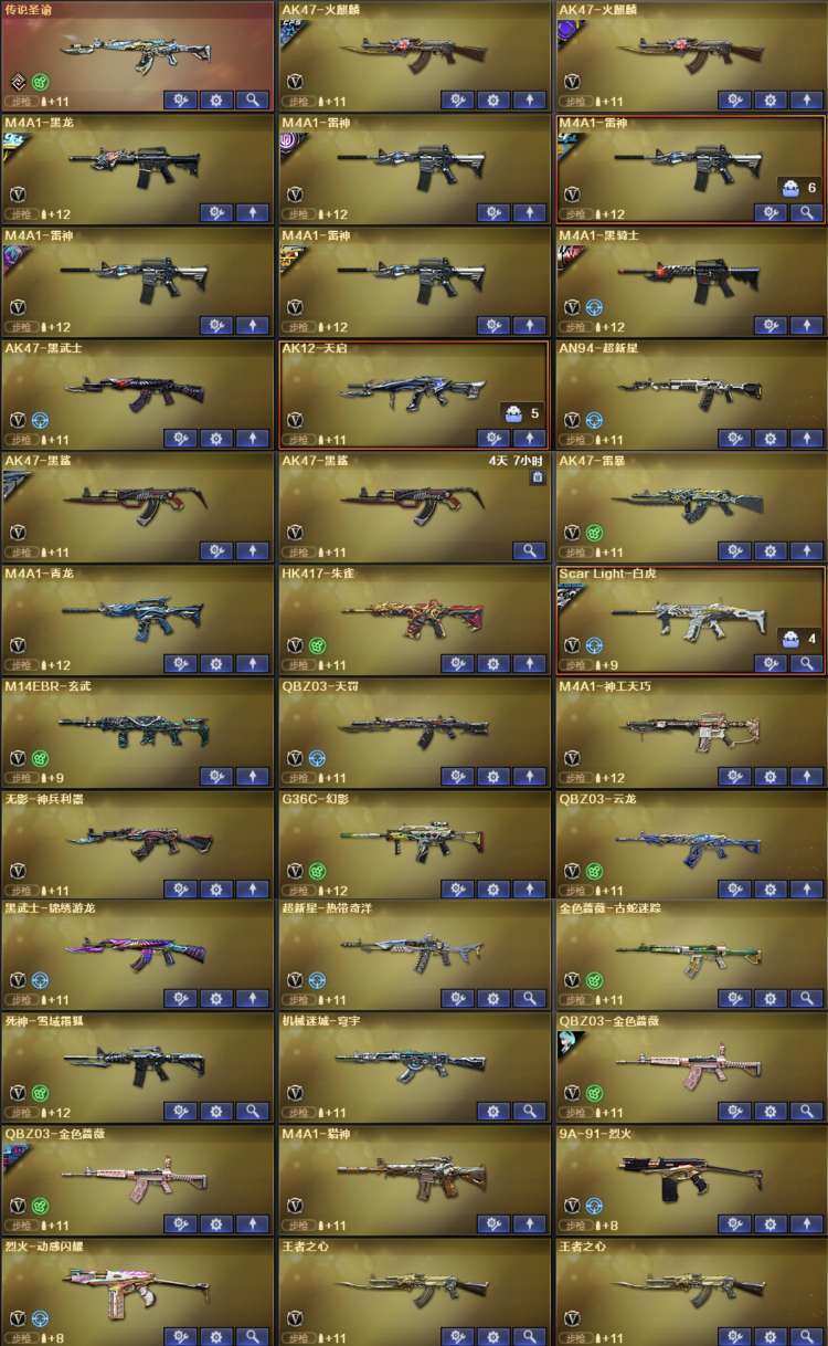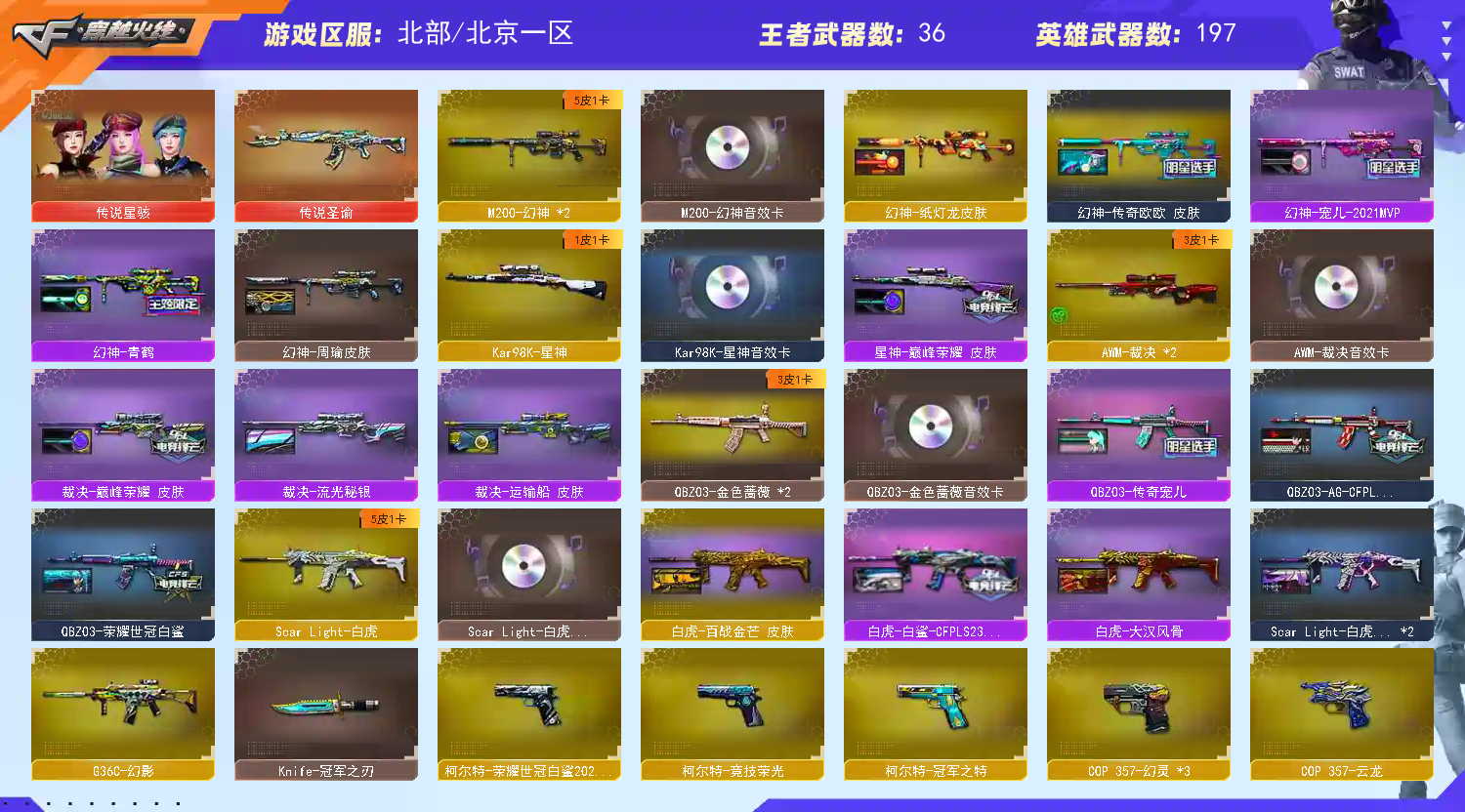 Scar Light-白虎-1,M4A1-神工天巧-1,USP-神工天巧-1,炽芒蝶刃-1,QBZ03-金色蔷薇-2,USP-冥王、HK417-朱雀、G36C-幻影、QBZ03-天罚、柯尔特特-荣耀世冠白鲨2023、QBZ03-云龙、Kar98K-星神、COP 357-云龙、AWM-裁决、传说圣谕、COP 357-幻灵、QBZ03-荣耀世冠白鲨、QBZ03-AG-CFPLS19冠军、QBZ03-传奇宠儿、雷神-荣耀之魄、毁灭-荣耀之怒、幻神-宠儿-2021MVP、幻神-青鹤、幻神-周瑜皮肤、裁决-运输船 皮肤、裁决-流光秘银,白虎-白鲨-CFPLS23冠军,白虎-巅峰荣耀 、星神-巅峰荣耀 ,炽芒蝶刃-冠军炽芒皮肤、裁决-巅峰荣耀、毁灭-SV-CFPLS16冠军、雷神-传奇N9、新海豹突击队、鹰、电竞教官-云悠悠、影豹、传说星骇、王者潘多拉、隼、炫、毁灭音效卡、雷神音效卡、火麒麟音效卡、黑骑士音效卡、幻神音效卡、金色蔷薇音效卡、白虎音效卡、星神音效卡、裁决音效卡;USP-雷暴,柯尔特-荣耀世冠白鲨2023,柯尔特-冠军之特,炽芒蝶刃,Knife-冠军之刃,传说星骇,隼,