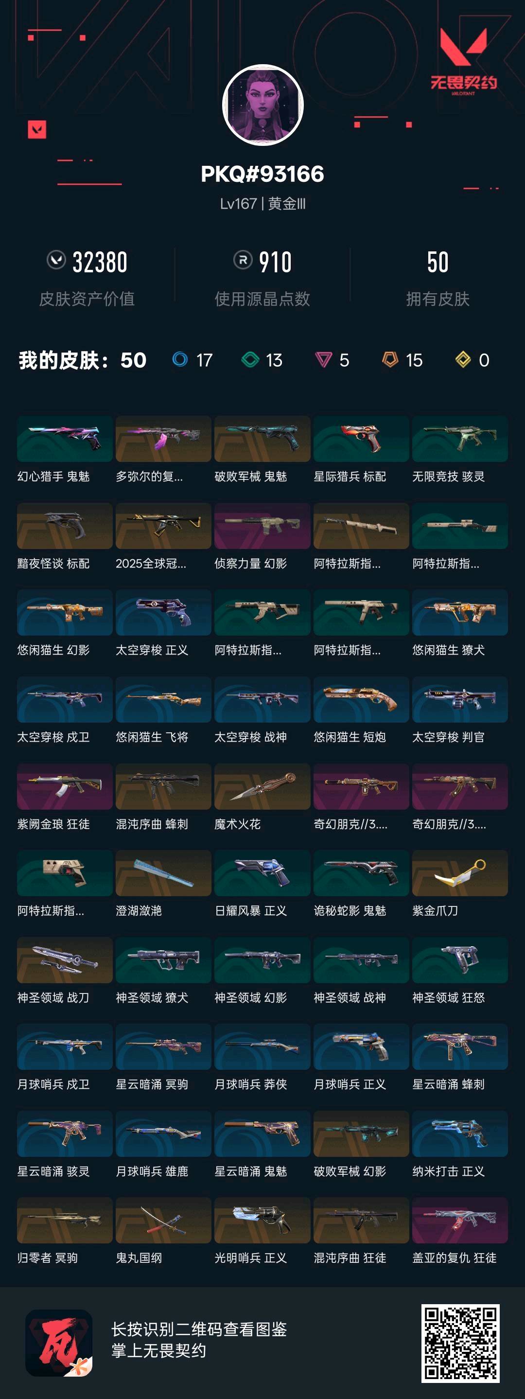 允许 英雄28 武器皮肤数量50;紫金爪刀,盖亚的复仇 狂徒,侦察力量 幻影,紫阙金琅 狂徒,混沌序曲 狂徒,混沌序曲 蜂刺,归零者 冥驹,