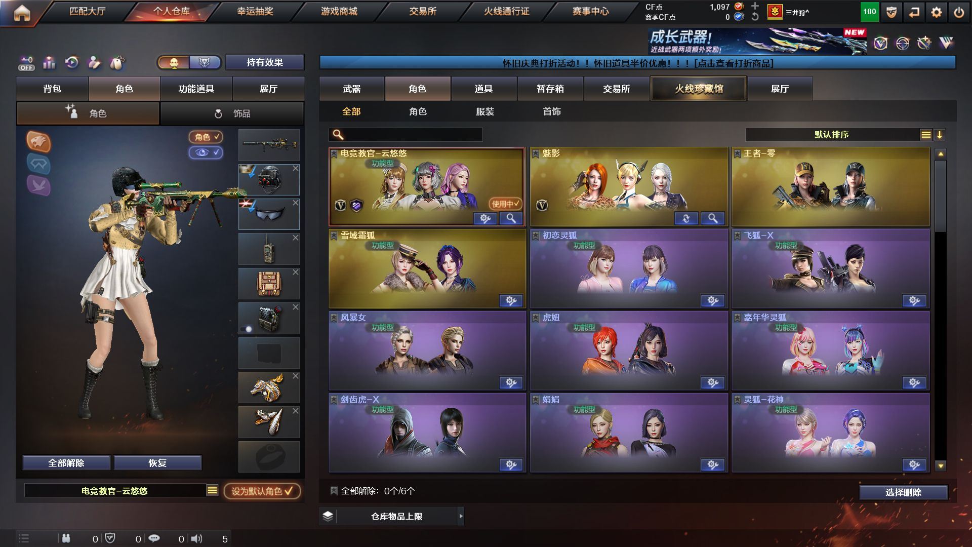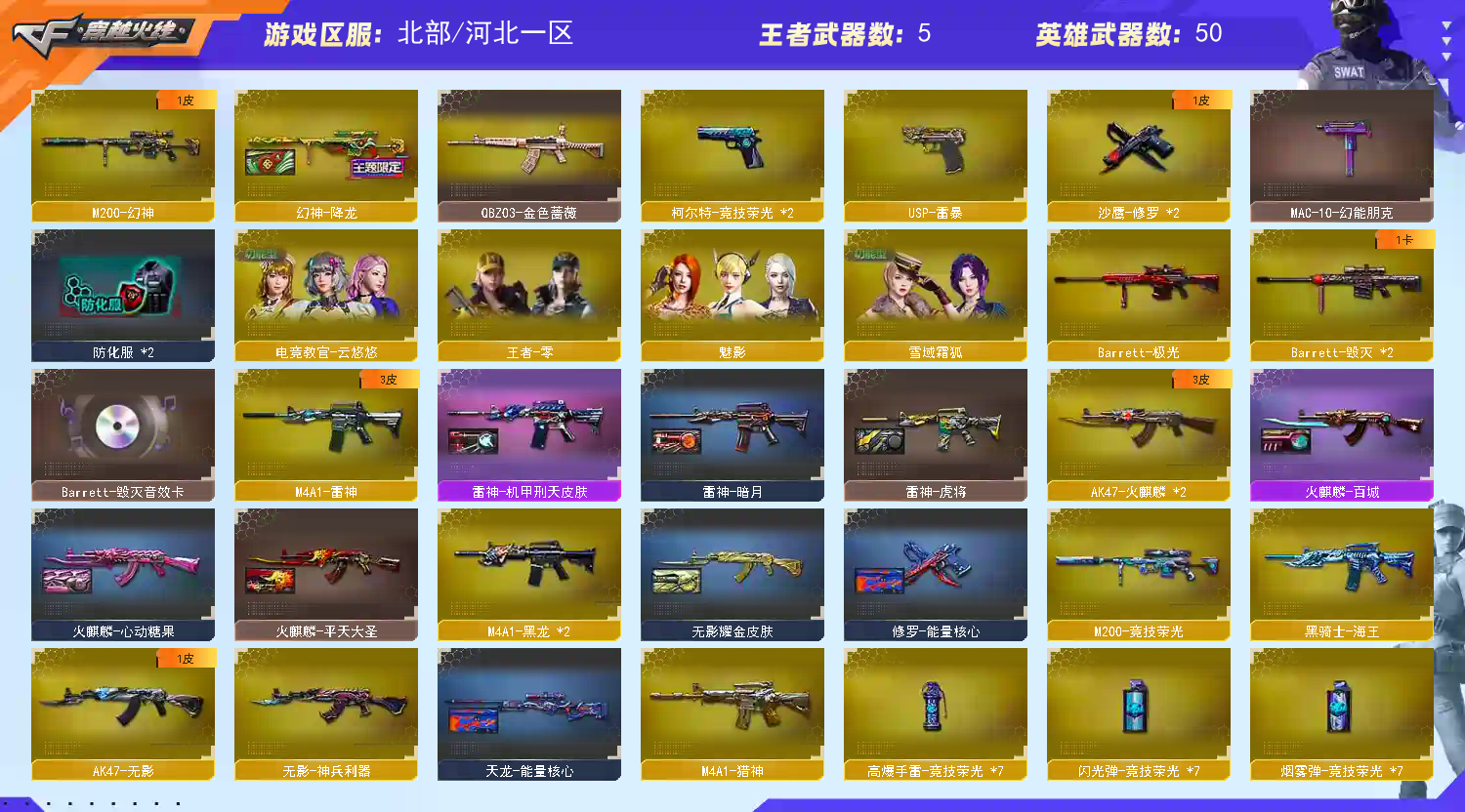 《m200幻神+幻神降龙》《m200竞技荣光》《usp雷暴 柯尔特竞技荣光 1911大黄蜂》《竞技荣光套》《qbz金色蔷薇》《烈火》《毁灭》《火麒麟》《雷神》《黑龙》《金刚伞》《裁决雪莉杨》《4防云悠悠》《毁灭音效卡》《雷神机甲刑天 火麒麟ag战队皮》;USP-雷暴,电竞教官-云悠悠,QBZ03-金色蔷薇,M200-幻神,