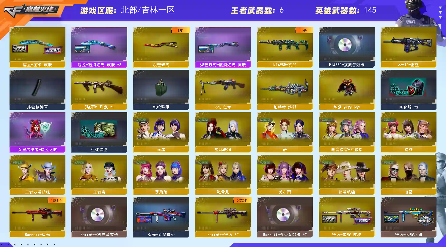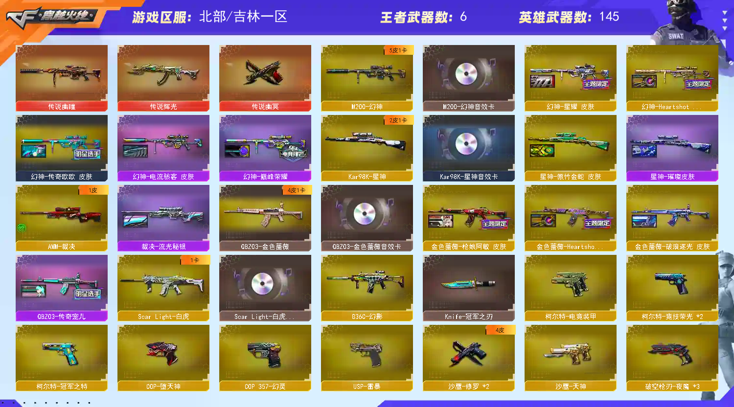 【商品标题】:北部吉林一区-156V-可二次实名-【Lv.102.荣耀元帅】-【段位:荣耀之巅】 【稀有武器】:传说辉光/传说幽瞳/传说幽冥/M200-幻神/Kar98K-星神/G36C-幻影/ScarLight-白虎/M14EBR-玄武/HK417-朱雀/M4A1-夜魔/USP-雷暴/COP-堕天神/破空枪刃-夜魔(3)/柯尔特-电竞装甲/COP357-幻灵/柯尔特-竞技荣光(2)/修罗-古蛇迷踪/柯尔特-冠军之特/金色蔷薇-古蛇迷踪/QBZ03-金色蔷薇/AK47-火麒麟/M4A1-黑龙/M4A1-雷神/M4A1-黑骑士/AK47-无影/白虎-电玩蓝兔/Barrett-毁灭(2)/Barrett-极光/AWM-裁决/M200-竞技荣光/RPK-盘龙/加特林-炼狱/汤姆逊-烈龙(4)/AA-12-雷霆/炽芒蝶刃/麒麟刺-堕天神(2)/龙啸-堕天神(4)/马来剑-夜魔/幻灵之锋/擎天-竞技荣光 【王者武器】: 【热门角色】:电竞教官-云悠悠/关小雨/荒漠琉璃/凌霄/晴雅/雾萌萌/星际战将/研/雨墨/岚兮儿/蛇隐宗/王者春/王者沙漠玫瑰/职业选手 【热门音效卡】:M200-幻神音效卡/Kar98K-星神音效卡/Scar Light-白虎音效卡/QBZ03-金色蔷薇音效卡/M4A1-雷神音效卡/Barrett-毁灭音效卡(2)/M4A1-黑骑士音效卡/AK47-火麒麟音效卡/M4A1-黑龙音效卡/Barrett-极光音效卡 【热门皮肤】:幻神-Heartshot皮肤/幻神-传奇欧欧皮肤/幻神-星耀皮肤/幻神-巅峰荣耀/幻神-电流骇客皮肤/雷神-HeartShot皮肤/金色蔷薇-破浪逐光皮肤/金色蔷薇-Heartshot皮肤/屠龙-星耀皮肤/毁灭-HeartShot皮肤/毁灭-星耀皮肤/擎天-傲竹金蛇皮肤/星神-傲竹金蛇皮肤/火麒麟-HeartShot皮肤/QBZ03-传奇宠儿/屠龙-破浪逐光皮肤(3)/星神-璀璨皮肤/裁决-流光秘银/炽芒蝶刃-破浪逐光皮肤/毁灭-直播专属/白虎-电玩粉兔皮肤/雷神-传奇N9/AK47-火麒麟-传奇EVEN/火麒麟-冠军之心/金色蔷薇-枪娘阿敏皮肤/毁灭-荣耀之怒/雷神-冠军之魄 【其他亮点】:炼狱-迷你小钢/Knife-冠军之刃/M4A1-奇幻占星神龙/USP-雷暴-深海特遣队/VEPR-12-金魔/Scar Light-马枪/贝雷塔687-射手座/黄金猫猫手套-白鲨/金刚伞-电玩红兔/M14EBR-冠军金牛/超核名片 (截图展示段位不代表实际段位,如赛季更新等不可抗拒因素发生变化,其余道具看截图或咨询客服);USP-雷暴,传说幽冥,柯尔特-冠军之特,炽芒蝶刃,Knife-冠军之刃,电竞教官-云悠悠,晴雅,