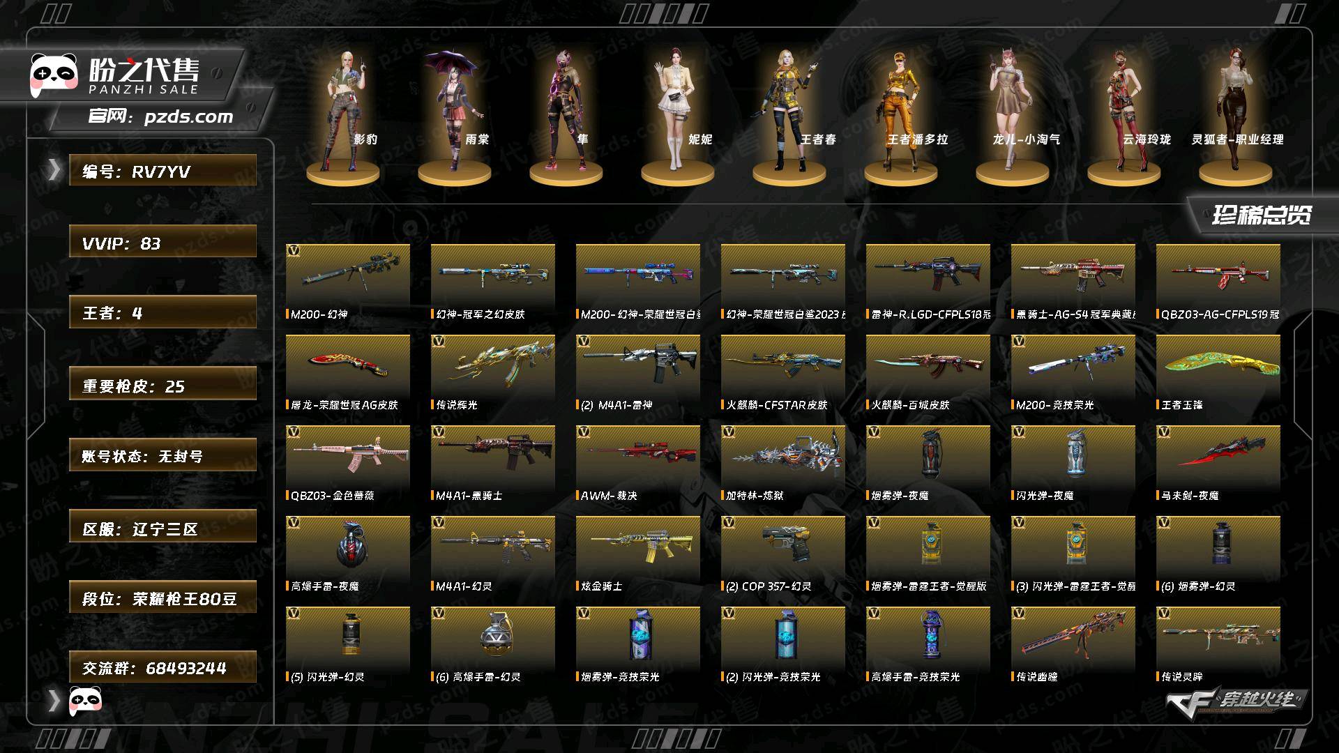 VIP6 83V,4王者,1炫金,传说辉光/传说幽瞳/传说灵眸/幻神荣耀世冠EP /幻神AGCFPL S24冠军 /幻神世冠白鲨/幻神荣耀世冠白鲨2023 /幻神冠军之幻/巴雷特SV/天龙CFSTAR/裁决巅峰荣耀 /火麒麟CFSTAR/火麒麟AG/_影豹/雨棠/隼/妮妮/M200-幻神/M200-竞技荣光/AWM-裁决/M4A1-雷神(2)/M4A1-黑骑士/幻灵套装/M200-幻神音效卡/QBZ03-金色蔷薇音效卡/M4A1-黑骑士音效卡/AWM-裁决音效卡;柯尔特-荣耀世冠白鲨2023,Knife-冠军之刃,隼,妮妮,QBZ03-金色蔷薇,传说幽瞳,M200-幻神,
