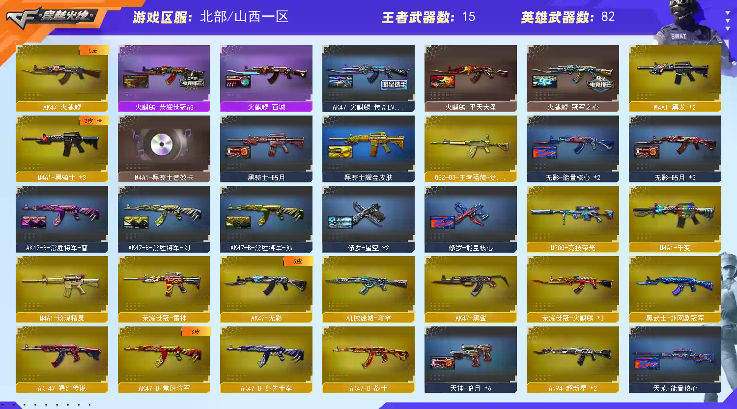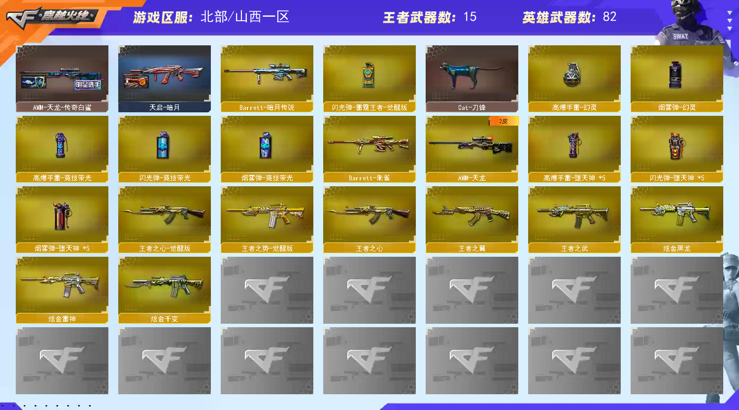 【王者武器】:【炫金黑龙-1,炫金雷神-1,王者之翼-1,王者之武-1,王者之心-1,王者玉锋-1,高爆手雷-雷霆王者-2,QBZ-03-王者蔷薇-觉醒版-1,炼狱-悦蓝-觉醒版-1,王者之势-觉醒版-1,王者之啸-觉醒版-3,王者之心-觉醒版-1,王者之锋-觉醒版-1,闪光弹-雷霆王者-觉醒版-1,炫金千变-1】 【英雄武器】:【AN94-超新星-2,M4A1-千变-1,M4A1-黑骑士-3,M4A1-玫瑰精灵-1,屠龙-3,龙啸-1,AK47-无影-1,麒麟刺-1,AK47-火麒麟-1,AWM-天龙-1,Barrett-毁灭-2,汤姆逊-烈龙-2,RPK-盘龙-1,沙鹰-修罗-4,加特林-炼狱-1,沙鹰-天神-2,M4A1-雷神-2,M4A1-黑龙-2,M200-幻神-1,USP-雷暴-1,黑武士-CF网剧冠军-1,M200-竞技荣光-1,天神-CF网剧冠军-1,幻灵之锋-2,擎天-CF网剧冠军-1,擎天-竞技荣光-1,机械迷城-穹宇-1,柯尔特-竞技荣光-1,烟雾弹-竞技荣光-1,闪光弹-竞技荣光-1,高爆手雷-竞技荣光-1,Scar Light-白虎-1,AK-47-猩红传说-1,Barrett-暗月传说-1,QBZ03-金色蔷薇-1,擎天-1,COP-堕天神-1,AWM-裁决-1,高爆手雷-堕天神-5,龙啸-堕天神-1,麒麟刺-堕天神-1,闪光弹-堕天神-5,烟雾弹-堕天神-5,AK47-B-常胜将军-1,AK47-B-身先士卒-1,烟雾弹-幻灵-1,荣耀世冠-柯尔特-1,荣耀世冠-火麒麟-3,荣耀世冠-雷神-1,荣耀世冠-龙啸-1,高爆手雷-幻灵-1,AK47-黑鲨-1,AK47-B-战士-1,Barrett-朱雀-1】 【装饰品】:【死神-秘银-1,天启-暗月-1,雷神-暗月-1,黑骑士-暗月-1,无影-暗月-1,天神-暗月-1,雷神-能量核心-1,天龙-能量核心-1,无影-能量核心-1,极光-能量核心-1,修罗-能量核心-1,灵狐潜伏者玩偶-1,巨人玩偶-1,刀锋玩偶-1,悦动玩偶-1,游泳喵-1,AWM-天龙-传奇白鲨-1,火麒麟-冠军之心-1,金色幸运鼠玩偶-1,雷神-荣耀世冠AG-1,雷神-R.LGD-CFPLS18冠军-1,毁灭-冠军之怒-1,雷神-宠儿-2019MVP-1,AK47-火麒麟-传奇EVEN-1,火麒麟-平天大圣-1,火麒麟-荣耀世冠AG-1,火麒麟-百城-1,雷神-虎将-1,黑骑士耀金皮肤-1,关羽玩偶-1,战神-粉色甜心皮肤-1,战神-流金岁月皮肤-1,AK47-B-常胜将军-曹操-1,火麒麟-AG战队皮肤-1,AK47-B-常胜将军-刘备-1,AK47-B-常胜将军-孙权-1,孙悟空玩偶-1,屠龙-荣耀之锋-1,雷神-荣耀之魄-1,毁灭-荣耀之怒-1,修罗-星空-1,幻神-冠军之幻-1,幻神-周瑜皮肤-1,屠龙-荣耀世冠AG-1,CFS 击杀图标-1,绝迹语音包-1,白泽玩偶-1】 【角色】:【魅影,金戈,陈龙野-X,堕天使,复仇者,幻影,雷豹,铁骑,猎狐者,潘多拉,G.E.M.邓紫棋,曼陀罗,波塞冬,夜玫瑰,活力灵狐,兰,灵狐者,嘉年华灵狐,电竞教官-云悠悠,圣诞潘多拉-X,救世主-X,风暴女,猎狐者-X,猎狐者-英特尔,斯沃特精英,奥摩-X,娟娟,娜塔莎,新斯沃特-英特尔,社长刀锋,迷迭香,灵狐者-职业经理,职业选手】 【道具】:【超级背包-1,炫彩背包-1,金蛇戒-1,银蛇戒-1,闪光护目镜-1,防弹衣-1,防弹头盔-1,手雷包-1,C4工具钳-1,防化服-1,夺命之镰-1,灵魂忍者-1,疯狂宝贝-1,迷雾幽灵-1,生化弹匣-1,步枪弹匣-1,Barrett-毁灭音效卡-1,M4A1-黑骑士音效卡-1,M200-幻神音效卡-1,绿色巨人-1,兔子发带-1】 查看全部 商品信息;USP-雷暴,荣耀世冠-柯尔特,电竞教官-云悠悠,RPK-盘龙,QBZ03-金色蔷薇,M200-幻神,Scar Light-白虎,
