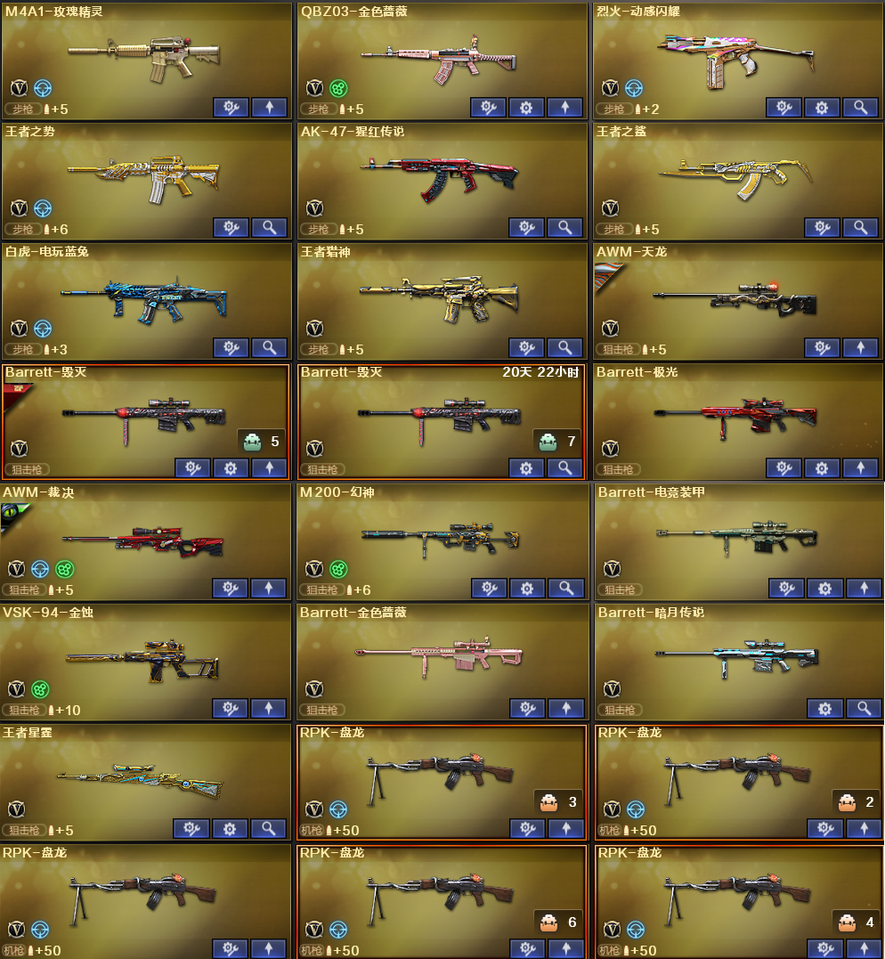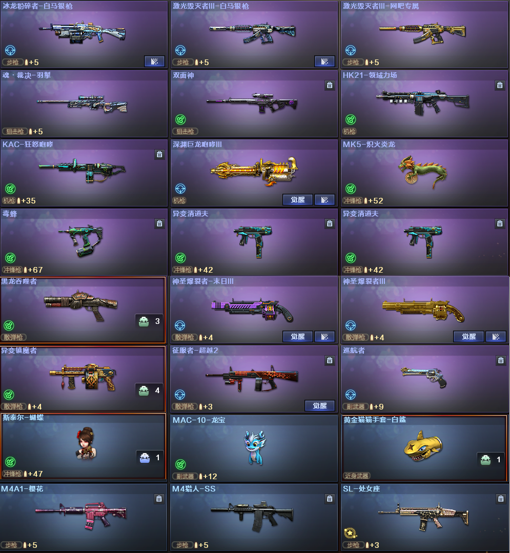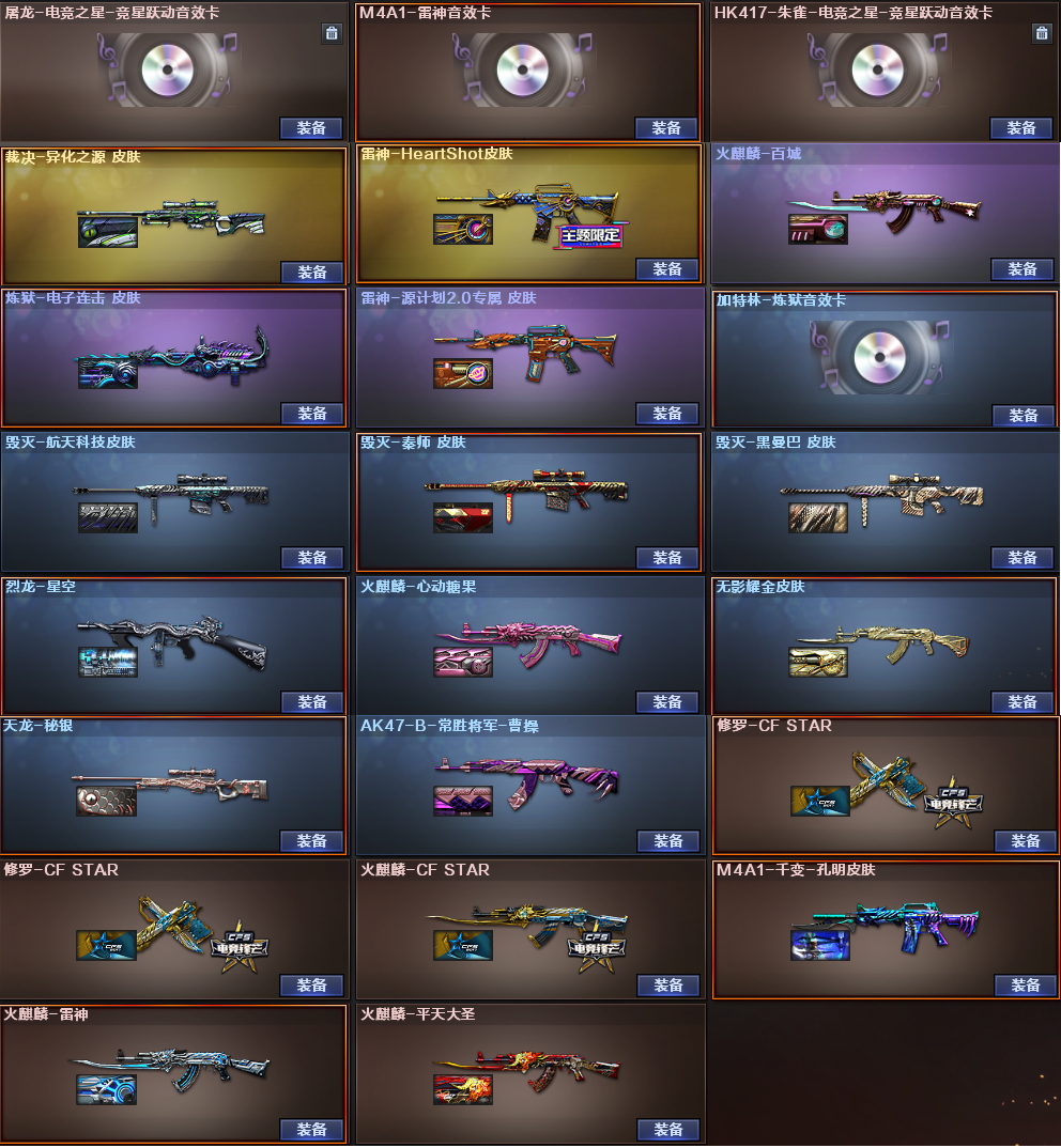 传说影煞破晓✅幻神+USP雷暴+炽芒蝶刃✅四防沙漠玫瑰+6烈龙炽火炎龙+6盘龙炼狱小刚✅幻灵套云龙套电竞装甲套✅全弹匣 稀有武器:传说破晓、M200幻神、USP雷暴、炽芒蝶刃、6把烈龙+MK5炽火炎龙+斯泰尔蝴蝶、烈龙云海游龙、6把盘龙+炼狱+迷你小刚、炼狱惊涛骇浪、VSK金蚀、QBZ金色蔷薇、QBZ天罚、M4幻灵、COP幻灵、幻灵之锋、QBZ云龙、COP云龙、云龙扇、Barrett电竞装甲、柯尔特电竞装甲、尼泊尔电竞装甲、M4武圣、Glock武圣、HK朱雀-电竞之星、千变、火麒麟、黑龙、雷神、黑骑士、无影、死神、黑武士、天启X2、、黑鲨、龙血、无影神兵利器、黑武士锦绣游龙、超新星热带奇洋、金色蔷薇古蛇迷踪、玫瑰精灵、烈火动感闪耀、白虎电玩蓝兔、天龙、毁灭、极光、裁决、Barrett金色蔷薇、暗月传说、A12雷霆、修罗X5、天神X2、修罗古蛇迷踪、屠龙、龙啸、擎天、麒麟刺、尼泊尔雷霆、斩神刀雷暴、屠龙动感闪耀、擎天云海游龙、龙啸热带奇洋、屠龙电竞之星、龙啸烈火龙威、M4凌龙-2、源雷神、QBZ独角兽、AK竞魂无影、M4胜者为王、黑武士能量核心、无影波塞冬、冰龙粉碎者白马银枪、激光毁灭者白马银枪、双面神、领域力场、KAC狂怒咆哮、深渊巨龙咆哮、毒蜂、异变清道夫X2、黑龙吞噬者、神圣爆裂者-末日3、异变镇魔者、巡航者 稀有角色:传说影煞(四防:生化背包变更+捕食者之眼+生化觉醒狂暴化+佣兵觉醒无需换弹) 、晴雅(四防:减少闪光效果+免疫队友炸弹伤害+减少掉落伤害+副武器自动装弹) 、沙漠玫瑰(四防:生化背包变更+生化移速提升+生化觉醒狂暴化+佣兵觉醒无需换弹) 、雨墨(四防)、幻面灵狐、审判者、瞳、樱、影豹(四防)、机械姬、零、葵、奇洋探员、乔伊教练、蛇影宗、王者瞳闭月羞花(四防)、王者凌霄(四防)、王者樱热浪之夏、云海玲珑、电竞少女 音效卡:炼狱音效卡、屠龙电竞之星竞星跃动音效卡、雷神音效卡、朱雀电竞之星竞星跃动音效卡 稀有皮肤:裁决异化之源皮肤、雷神Heartshot皮肤/源计划2.0专属皮肤、毁灭黑曼巴皮肤/航天科技皮肤/秦狮皮肤、烈龙星空皮肤、火麒麟平天大圣皮肤/百城皮肤/心动糖果皮肤/CFstar皮肤/雷神皮肤、无影耀金皮肤、天龙秘银皮肤、修罗CFstar皮肤、千变孔明皮肤 王者炫金武器:王者之势、王者之鲨、王者猎神、王者星霆、炫金毁灭 投掷套装:雷暴套X5、雷霆套、电竞装甲套X7、幻灵套、云龙套、手雷动感闪耀、手雷云海游龙、手雷热带奇洋、手雷古蛇迷踪、烟雾弹古蛇迷踪 小人枪武器特殊武器:HK朱雀蛇影宗、火麒麟灵狐、雷神小红、炼狱迷你小刚、MK5炽火炎龙、斯泰尔蝴蝶X2、MAC龙宝、猩红司令玩偶-M37、黄金猫猫手套白鲨、猫猫手套、迷你生化手雷X7;USP-雷暴,炽芒蝶刃,沙漠玫瑰,传说影煞,晴雅,RPK-盘龙,QBZ03-金色蔷薇,