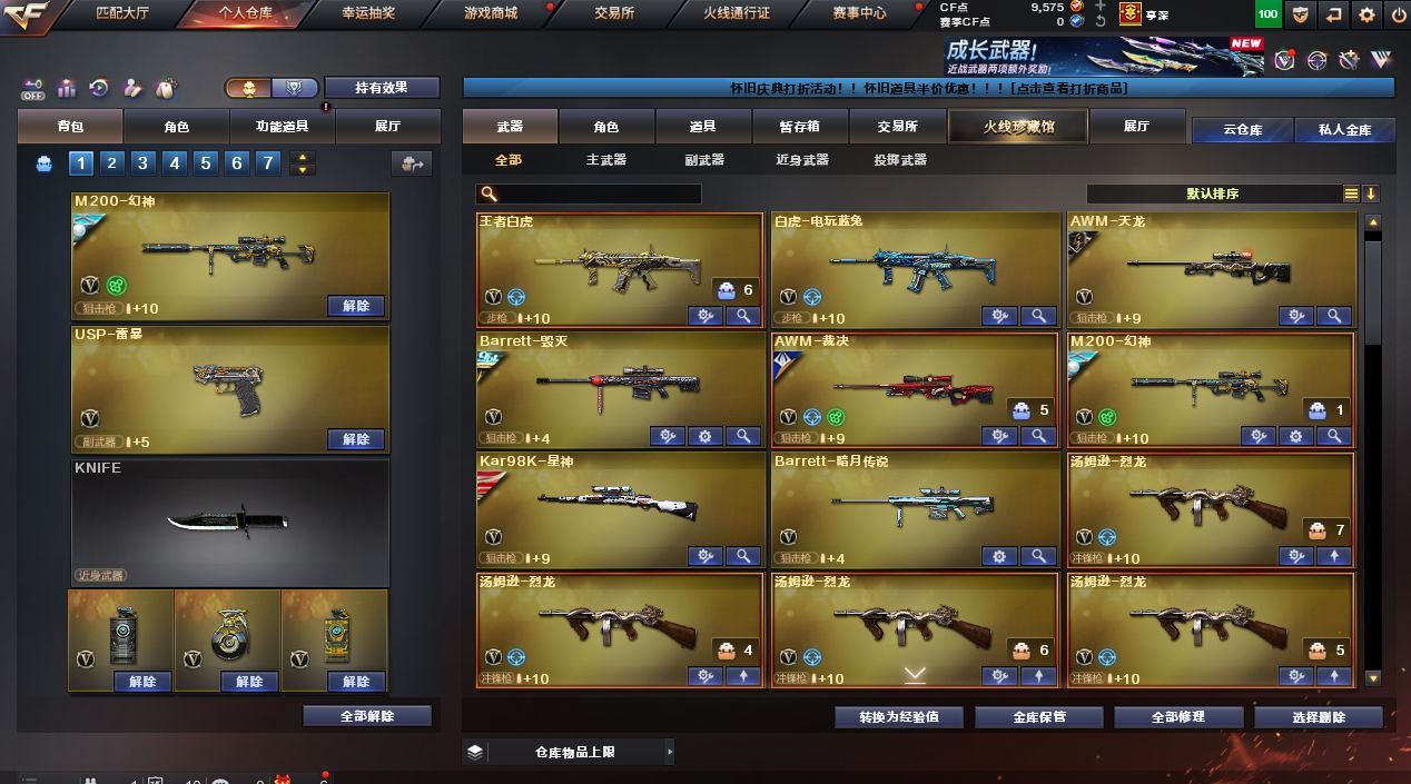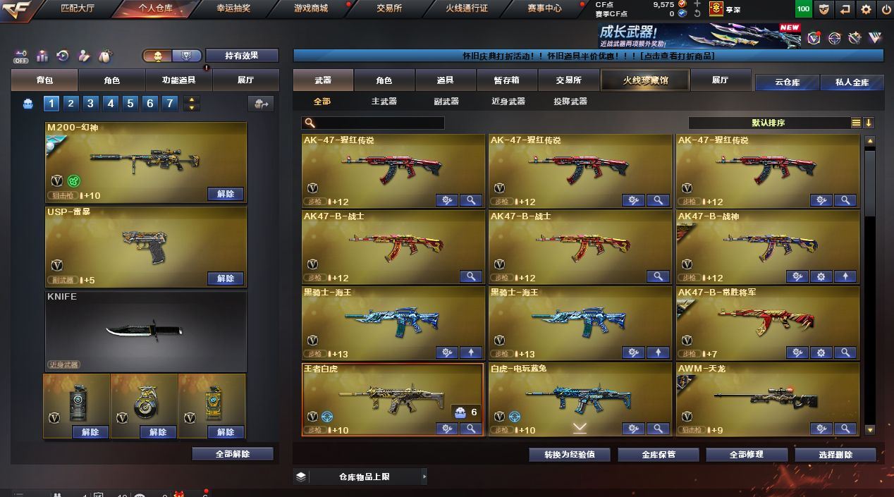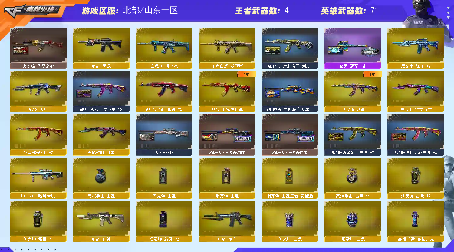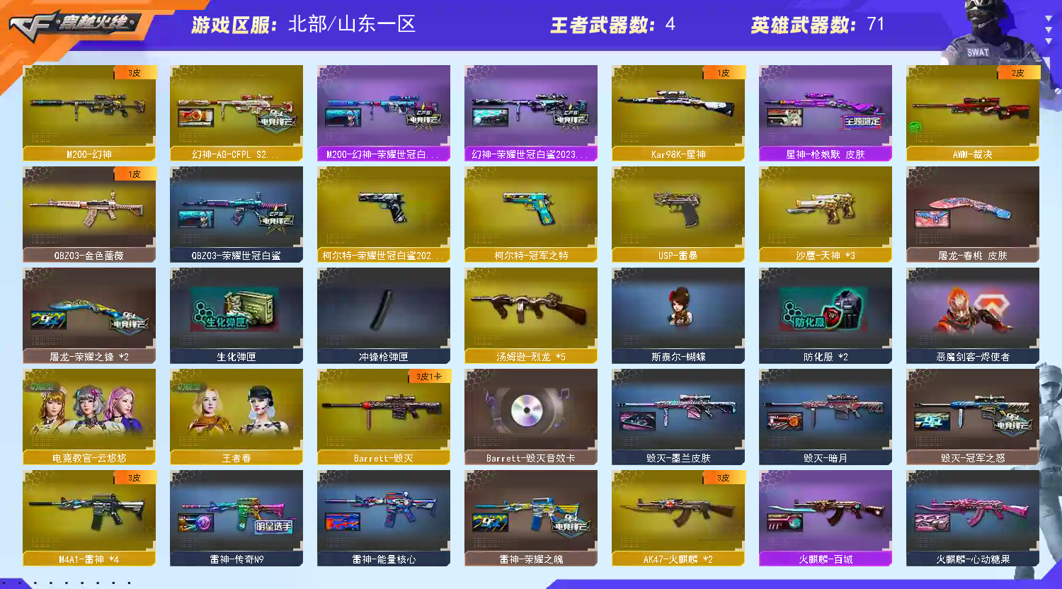 【M200-幻神+AG-CFPL S24冠军皮肤+荣耀世冠白鲨+荣耀世冠白鲨2023皮肤】【Kar98K-星神+枪娘默皮肤】【AWM-裁决+百城联赛天津皮肤】【白虎-白鲨-CFPLS23冠军】【白虎-电玩蓝图】【QBZ03-金色蔷薇+荣耀世冠白鲨】【王者之魄-觉醒版/王者之势-觉醒版/王者白虎-觉醒版】【USP-雷暴/沙鹰-天神(3)/柯尔特-冠军之特/柯尔特-荣耀世冠白鲨2023】【麒麟刺+荣耀世冠白鲨/龙啸+热带奇洋/擎天+冠军之击/屠龙(2)/雷霆之锋/斩神刀-雷暴】【5烈龙】【斯泰尔-蝴蝶】【电竞教官-云悠悠/王者春/修道士/奇洋探员/乔伊教练/职业选手/云海玲珑/灵狐者-职业经理/空/灵狐者-黄金海岸/兰-海滩派对/斯沃特-X/潘多拉-N】【Barrett-毁灭音效卡】【毁灭-冠军之怒/毁灭-墨兰皮肤/毁灭-暗月/极光-能量核心/AWM-天龙-传奇70KG/AWM-天龙-传奇白鲨/天龙-秘银/火麒麟-CFSTAR/火麒麟-AG/火麒麟-华夏之心/火麒麟-心动糖果/火麒麟-百城/AK47-黑武士-361/AK47-B-常胜将军-刘备/AK-47-雷神/M4A1-千变-孔明皮肤/雷神-源计划2.0专属皮肤/M4A1-雷神-白鲨皮肤/雷神-传奇N9/雷神-荣耀之魄/雷神-能量核心/战神-流金岁月皮肤/战神-紫绶金章皮肤/战神-粉色甜心皮肤/修罗-CFSTAR/炽芒蝶刃-荣耀世冠白鲨2023皮肤】【Barrett-毁灭/Barrett-暗月传说/AWM-天龙/M4A1-雷神(4)/M4A1-死神/M4A1-黑龙/M4A1-龙血/黑骑士-海王(2)/AK12-天启/AK47-火麒麟(2)/无影-神兵利器/AK-47-猩红传说(5)/AK47-B-常胜将军/AK47-B-战士(2)/AK47-B-战神/超新星-热带奇洋/黑武士-锦绣游龙】;USP-雷暴,柯尔特-荣耀世冠白鲨2023,柯尔特-冠军之特,电竞教官-云悠悠,QBZ03-金色蔷薇,M200-幻神,Kar98K-星神,