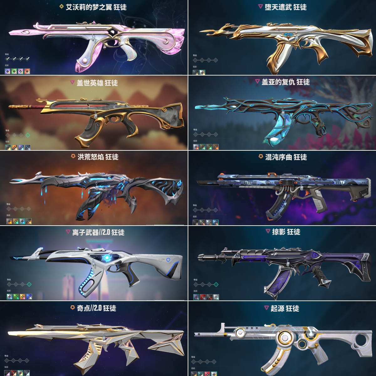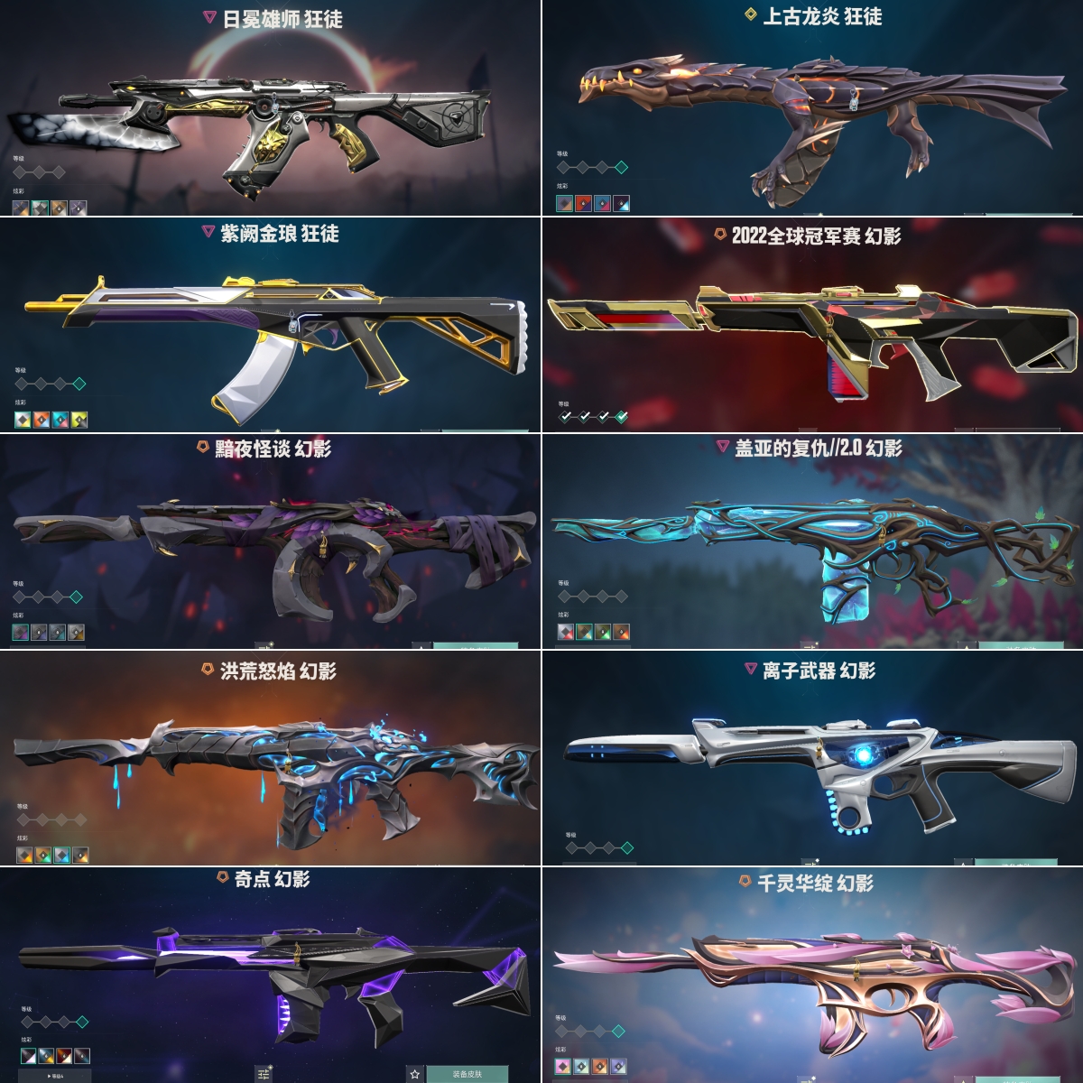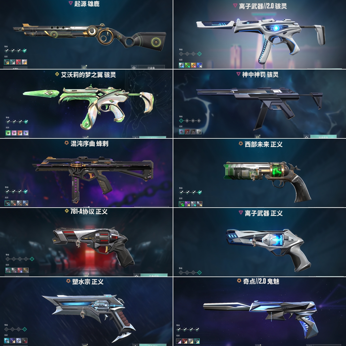 【拥有手枪】VCT-x-TLN-标配/塑水宗-正义/781-A协议-正义/离子武器-正义/日耀风暴-正义/诡秘蛇影-鬼魅/神圣领域-狂怒/荒土机兵-标配/超限闪存-正义/沙尘幻旅-正义/弧光异彩-短炮/魄月玄兔-鬼魅/悠闲猫生-短炮/甜蜜战术-鬼魅/神罚//2.0-鬼魅/幻语魔咒-狂怒/折光棱晶-标配/末日之翼-短炮/星云暗涌-鬼魅/月球哨兵-正义/纳米击-正义/逆冲蛮牛-狂怒/浮光跃金-标配/模拟赫兹-鬼魅/