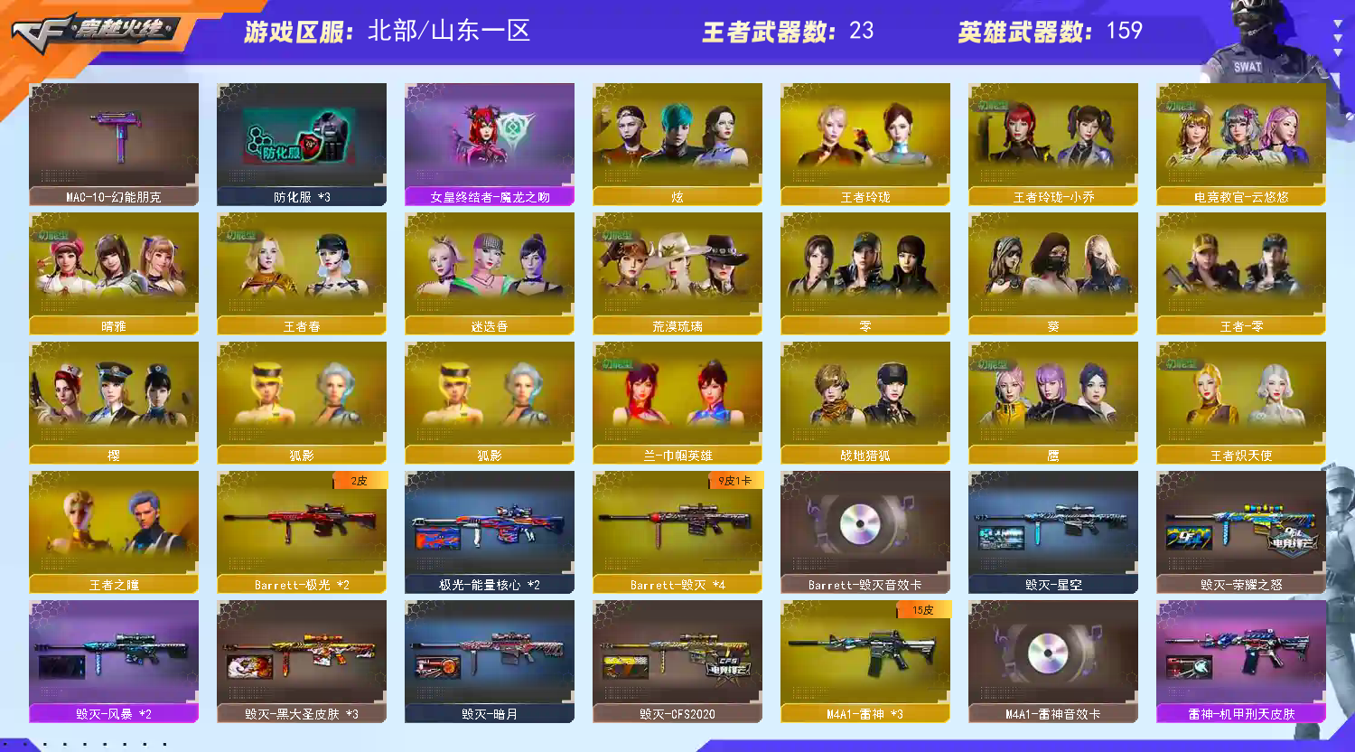 全装 4防传说女帝 盘6烈;USP-雷暴,荣耀世冠-柯尔特,电竞教官-云悠悠,晴雅,传说艾莉莎,RPK-盘龙,QBZ03-金色蔷薇,