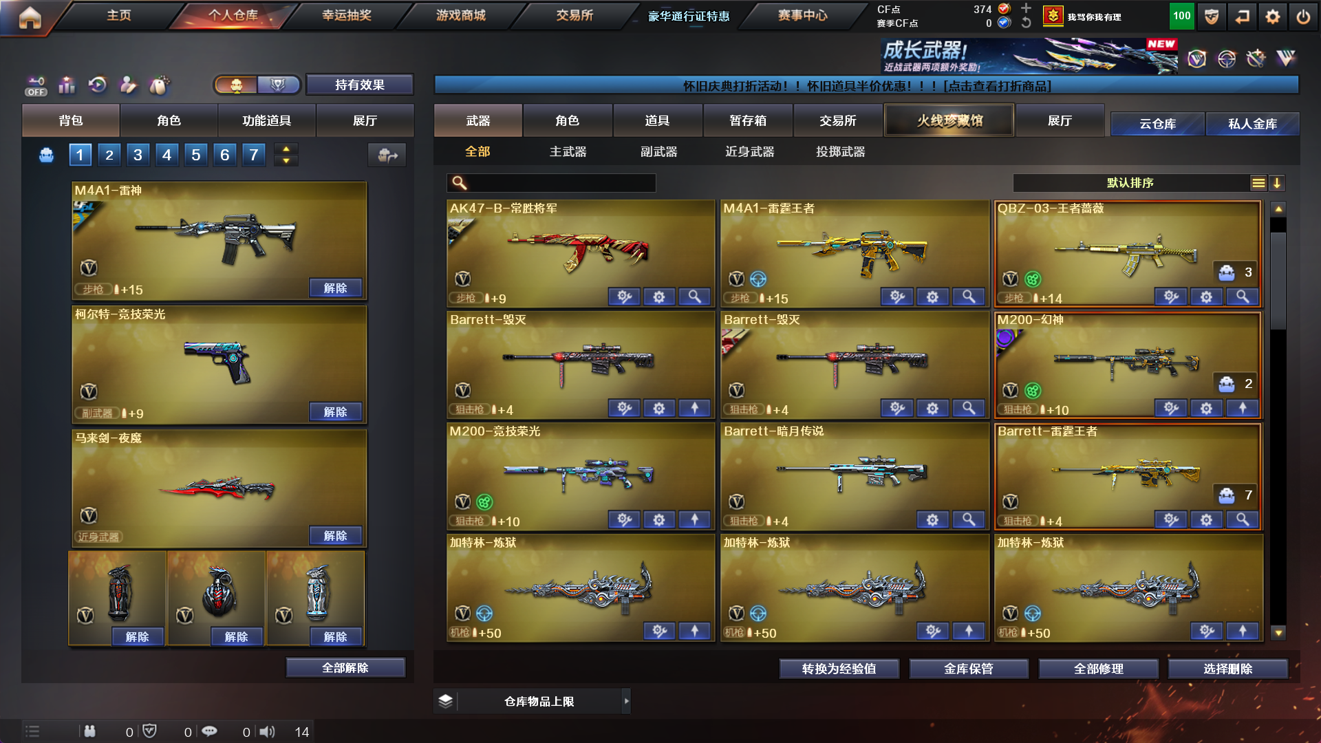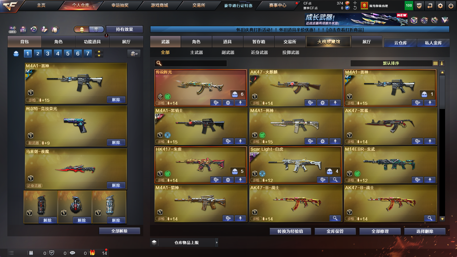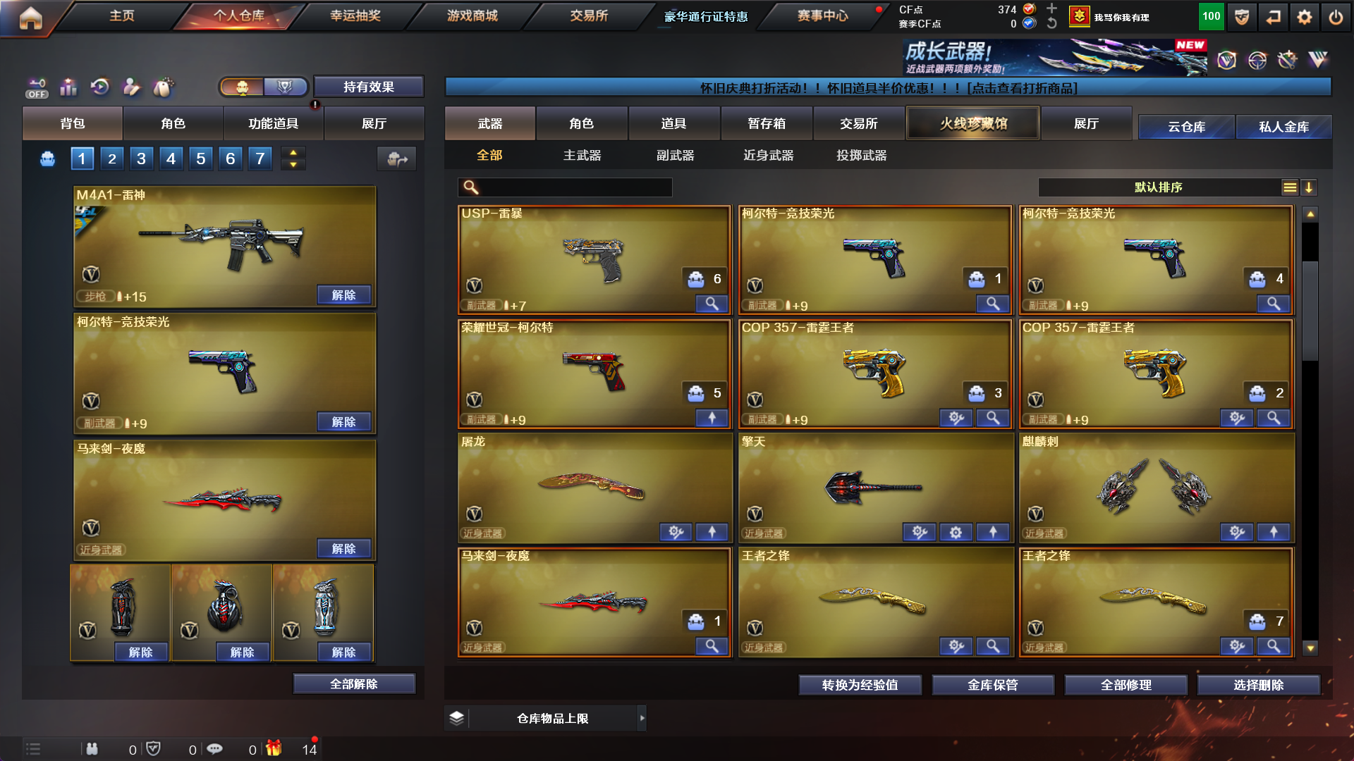 7套雷;USP-雷暴,荣耀世冠-柯尔特,电竞教官-云悠悠,王者沙漠玫瑰,M200-幻神,Scar Light-白虎,