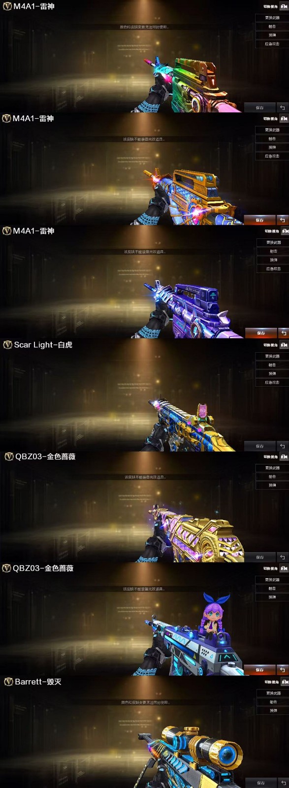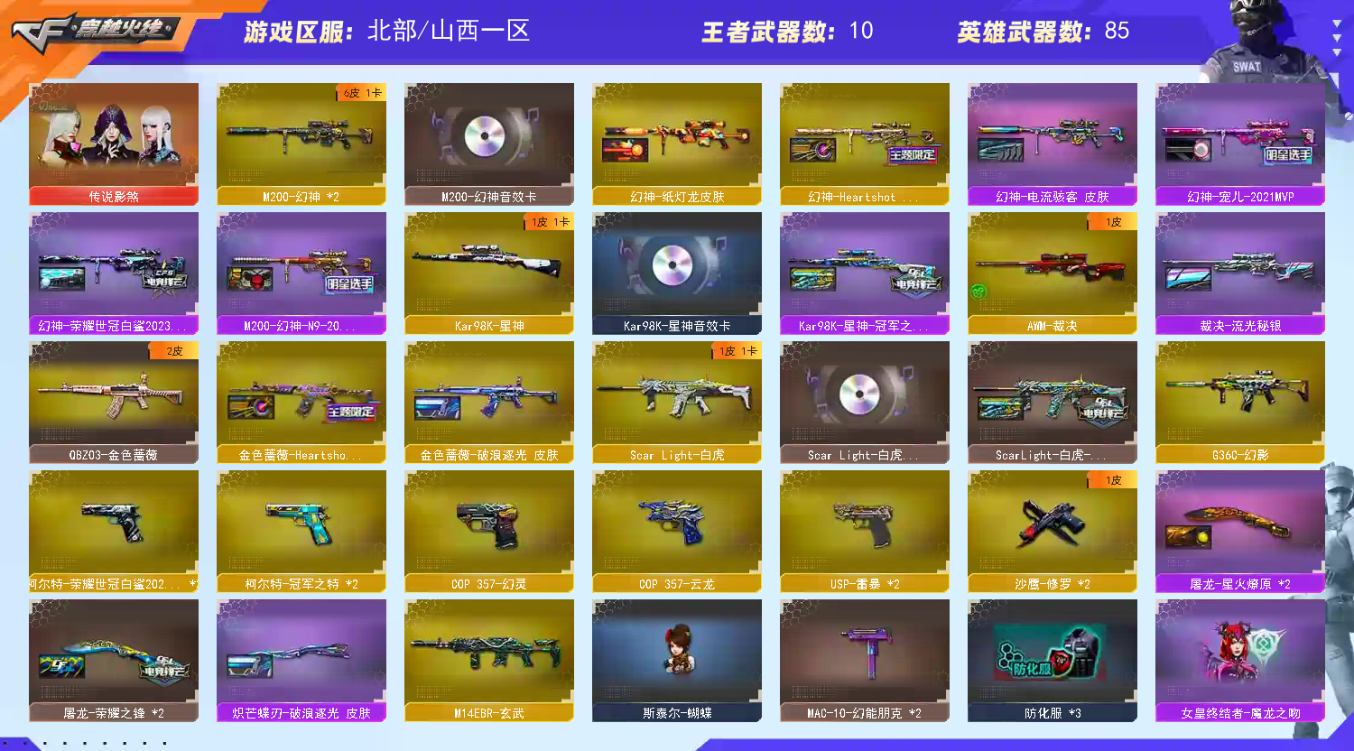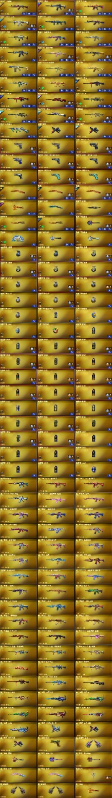 王者武器:王者之城-觉醒版;QBZ-03-王者蔷薇-觉醒版;青龙之魄;王者之烈-觉醒版;凤吟之魄 英雄武器:M200-幻神;屠龙;AWM-裁决;柯尔特-荣耀世冠白鲨2023;USP-雷暴;高爆手雷-竞技荣光;Kar98K-星神;COP 357-云龙;云龙扇;高爆手雷-云龙;烟雾弹-云龙;闪光弹-云龙;烟雾弹-雷霆;高爆手雷-雷霆;闪光弹-雷霆;斩神刀-雷暴;雷霆之锋;高爆手雷-雷暴;烟雾弹-雷暴;闪光弹-雷暴;黑武士-锦绣游龙;炽芒蝶刃;手雷-热带奇洋;超新星-热带奇洋;龙啸-热带奇洋;沙鹰-修罗;柯尔特-冠军之特;Barrett-毁灭;G36C-幻影;HK417-朱雀;烈龙-云海游龙;擎天-云海游龙;手雷-云海游龙;龙啸;M4A1-雷神;烟雾弹-幻灵;闪光弹-幻灵;高爆手雷-幻灵;M14EBR-玄武;Scar Light-白虎;QBZ03-金色蔷薇;COP 357-幻灵;Barrett-极光;无影-神兵利器;AK47-火麒麟 角色:鹰;传说影煞;潘多拉;复仇者;堕天使;夜玫瑰;娜塔莎;精英部队;灵狐者;潜龙队-X;暗夜-X;紫霞;灵狐者-职业经理;夜玫瑰-X;剑齿虎-X;圣诞潘多拉-;USP-雷暴,柯尔特-荣耀世冠白鲨2023,柯尔特-冠军之特,炽芒蝶刃,传说影煞,QBZ03-金色蔷薇,G36C-幻影,