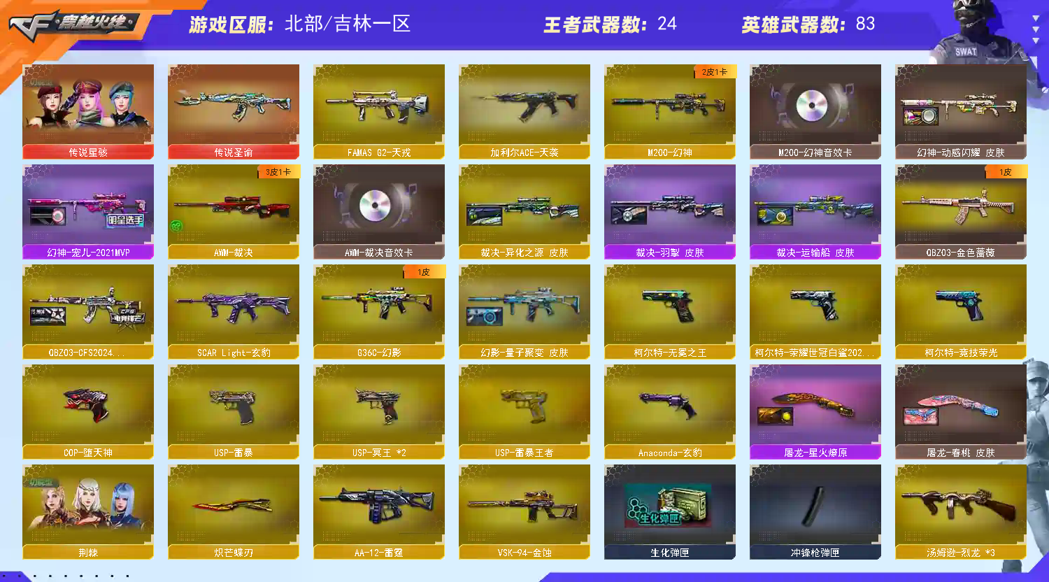 【传说星骇】【22王者1炫金】【M200幻神+幻神宠儿+幻神动感闪耀皮肤+幻神音效卡】【USP雷暴+竞技柯尔特+USP冥王+柯尔特荣耀世冠白鲨2023+柯尔特无冕之王+cop堕天神+USP雷暴王者】【炽芒蝶刃】【M200竞技荣光】【觉醒王者星霆】【裁决+裁决运输船+裁决羽掣皮肤+裁决异化之源+裁决音效卡】【传说圣谕】【竞技荣光套】【法玛斯天戎】【觉醒王者白虎】【青龙】【2烈龙+死亡之眼】【觉醒王者猎神】【金色蔷薇+QBZcfs2024】【白虎霓虹机甲皮肤+毁灭荣耀之怒++雷神诺拉皮肤+火麒麟轻羽+屠龙惊鸿皮肤】【火麒麟音效卡+黑骑士音效卡+毁灭音效卡+雷神音效卡】【荆棘+四防晴雅+雨墨+满配乔伊教练+满配蛇隐宗+满配云海玲珑+暗夜审判】【天罚+天罚音效卡】【猎神】【金蚀】【朱雀蛇隐宗+火麒麟灵狐+雷神小红+cop旗袍】【牛牛AK47】【1911大黄蜂】【手斧镜】【闪光护目镜+超级背包+炫彩背包】;USP-雷暴,柯尔特-无冕之王,USP-雷暴王者,柯尔特-荣耀世冠白鲨2023,炽芒蝶刃,传说星骇,晴雅,