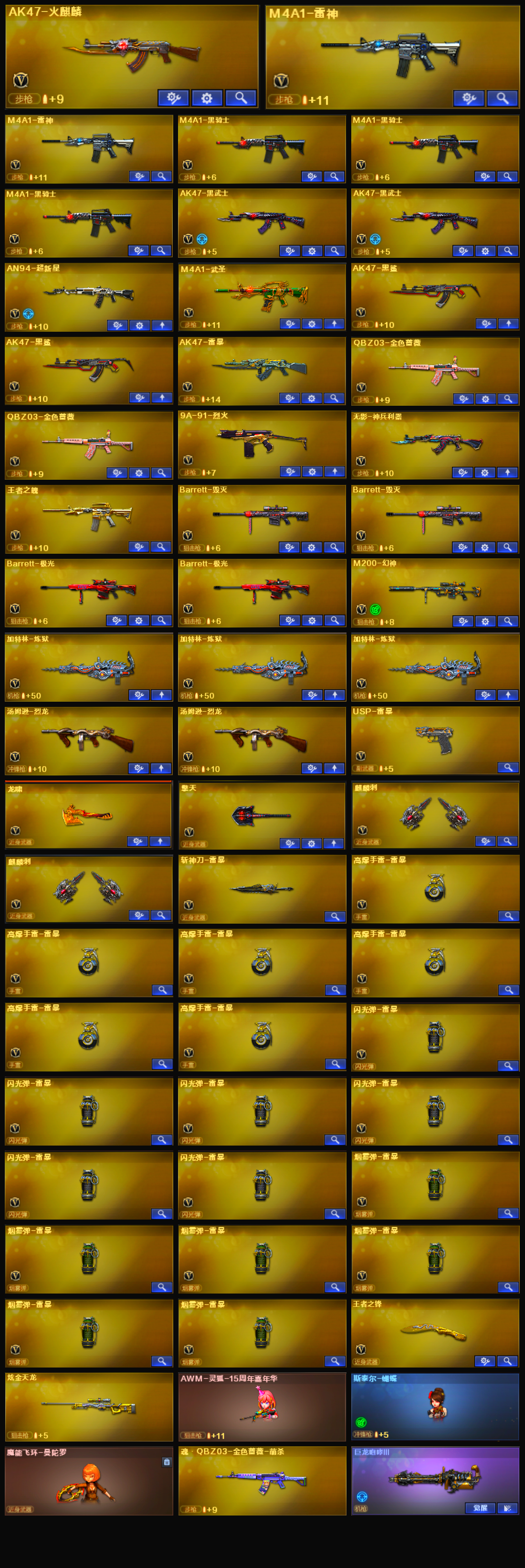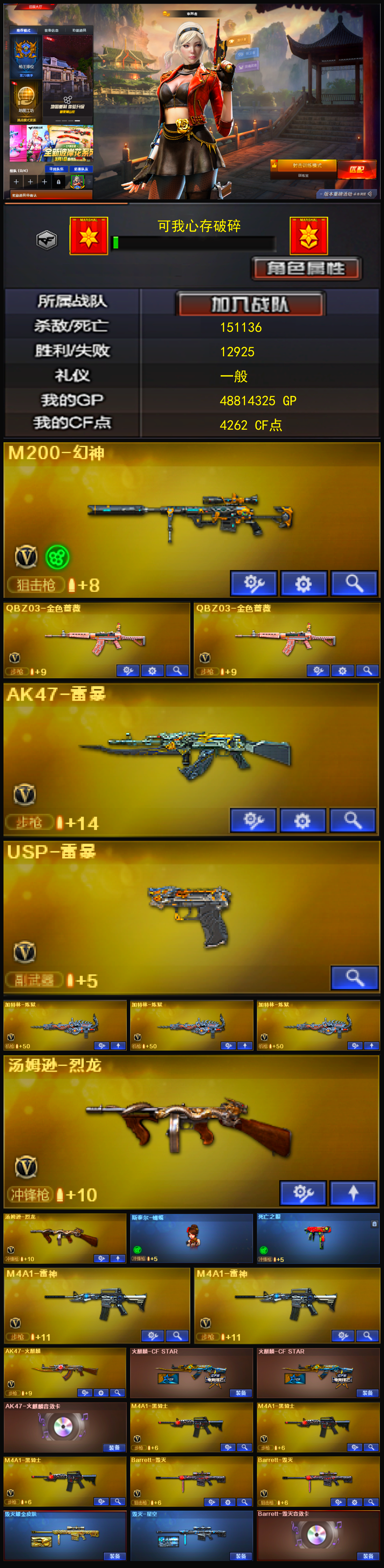 【m200幻神】【qbz金色蔷薇*2】【雷暴套】【3炼狱 2烈龙 斯泰尔蝴蝶 死亡之眼】【火麒麟+音效卡】【毁灭*2+音效卡】【王者之魄 王者之锋】【雷神*2 黑骑士*3 黑武士*2 超新星 m4武圣 黑鲨*2 无影神兵利器 烈火 天龙 极光*2】【龙啸 擎天 麒麟刺*2】【审判者 职业选手】;USP-雷暴,QBZ03-金色蔷薇,M200-幻神,