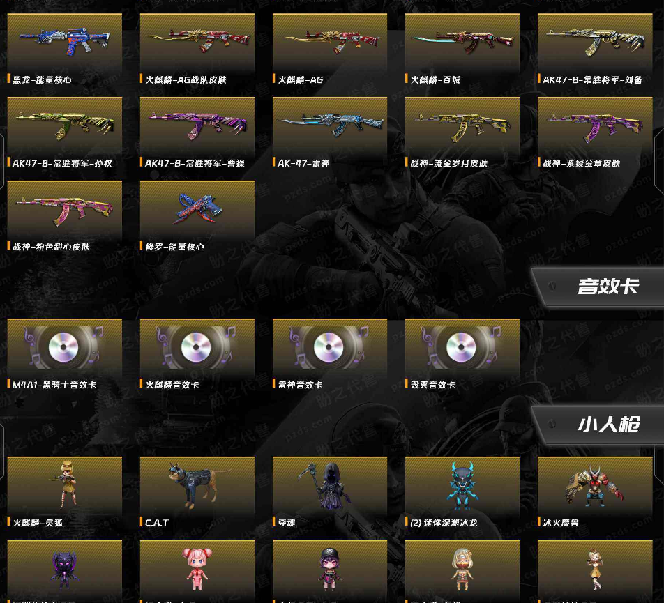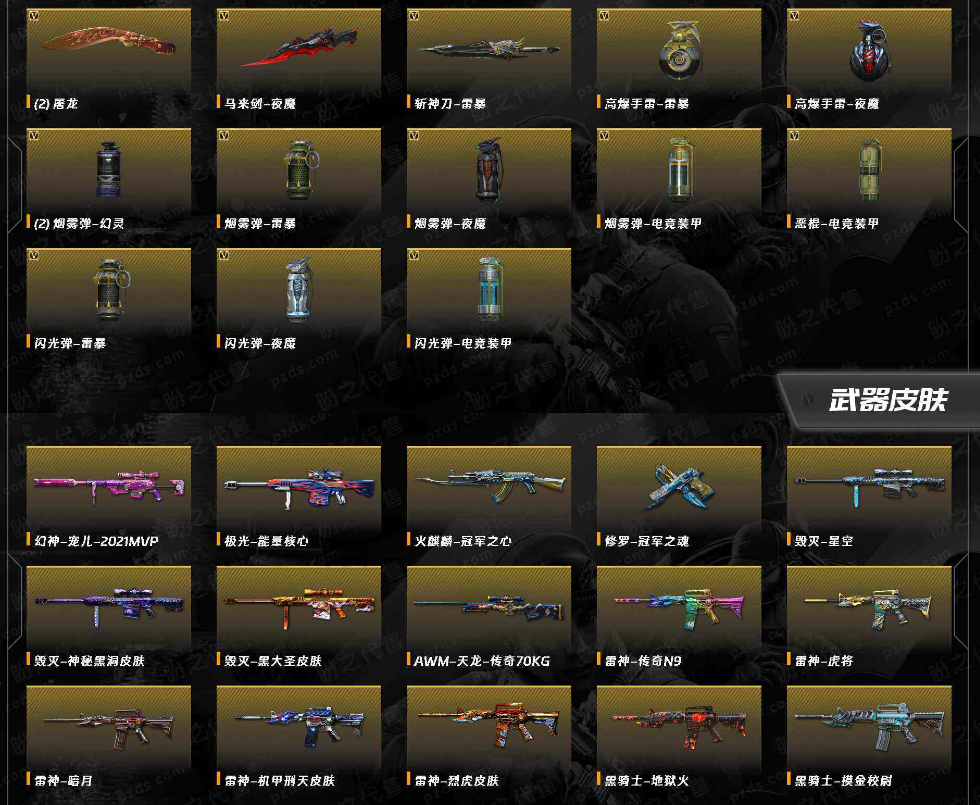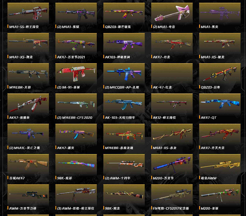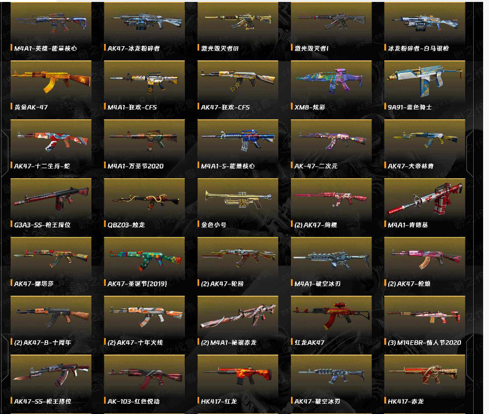 可排位M200-幻神+幻神宠儿/白虎+QBZ蔷薇+5烈4盘+柯尔特+雷神N9+冠军之心+网剧套;RPK-盘龙,QBZ03-金色蔷薇,M200-幻神,Scar Light-白虎,