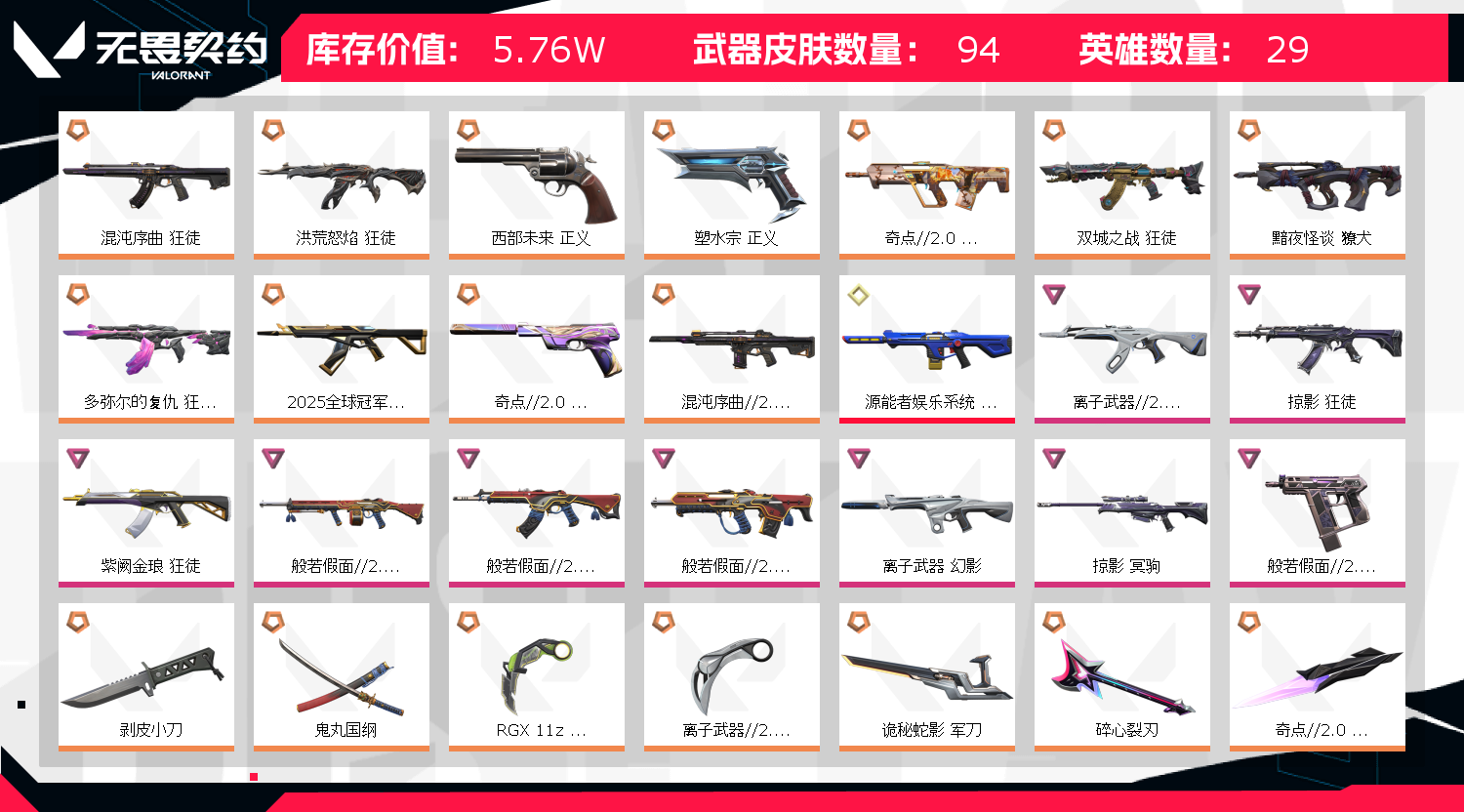 【拥有套装】奇点2.0套装(奇点//2.0-狂徒,奇点//2.0-鬼魅,奇点//2.0-蝴蝶刀)般若假面2.0套装(般若假面//2.0-狂徒,般若假面//2.0-獠犬,般若假面//2.0-战神,般若假面//2.0-狂怒,鬼丸国纲) 【拥有近战武器】超时空卫队-三棱军刺,流风回雪,离子武器//2.0-爪刀,洪荒双斩,RGX-11z-Pro//3.0-爪刀,剥皮小刀, 【拥有步枪】多弥尔的复仇-狂徒,混沌序曲//2.0-幻影,混沌序曲-狂徒,双城之战-狂徒,黯夜怪谈-獠犬,洪荒怒焰-狂徒,2025全球冠军赛-狂徒,源能者娱乐系统-幻影,离子武器//2.0-狂徒,紫阙金琅-狂徒,离子武器-幻影,掠影-狂徒 【拥有狙击枪】掠影-冥驹 【拥有手枪】西部未来-正义,塑水宗-正义 【卡面信息】无畏契约吉祥物卡面;剥皮小刀,洪荒怒焰 狂徒,掠影 狂徒,源能者娱乐系统 幻影,紫阙金琅 狂徒,混沌序曲 狂徒,离子武器//2.0 狂徒,