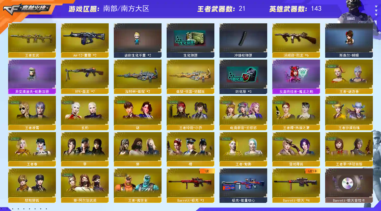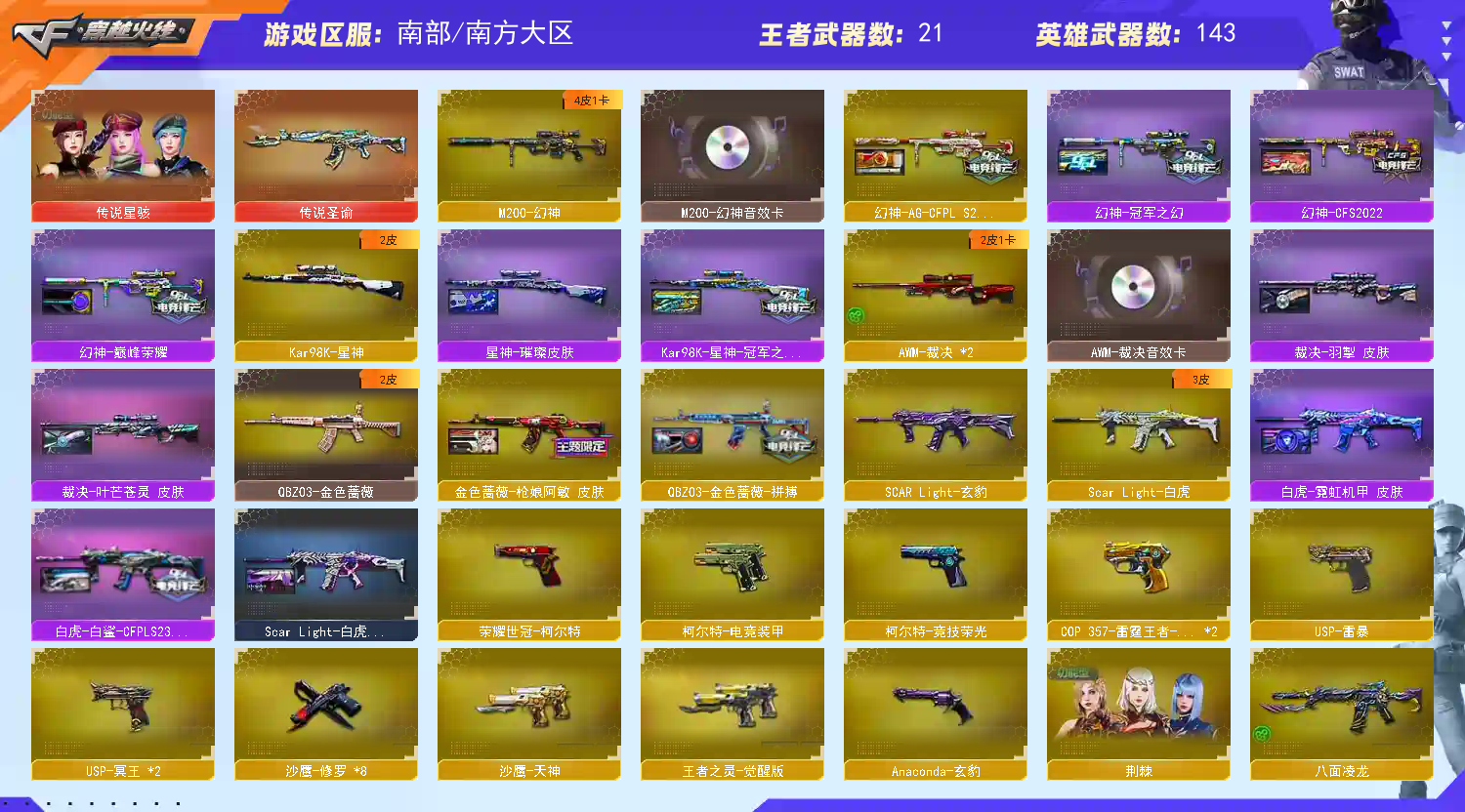 !!!!!!!!!!! 烦请各位大佬订单快结束不要开排位,可以打别的模式,麻烦爱惜此号,否则会永久拉黑处理 !!!!!!!!!!! 烦请各位大佬订单快结束不要开排位,可以打别的模式,麻烦爱惜此号,否则会永久拉黑处理 【南方大区】【V武器数148】【幻神3件套】【幻神4皮】【6烈龙】【斯泰尔-蝴蝶】【死亡之眼】【6盘龙】【竞技荣光套装X1套】【夜魔套装X1套】【传说星骇】【传说圣谕】【M200-幻神】【幻神-AG-CFPL S24冠军 皮肤】【幻神-冠军之幻】【幻神-巅峰荣耀】【幻神-CFS2022】【M200-幻神音效卡】【M200-竞技荣光】【Kar98K-星神】【Kar98K-星神-冠军之星皮肤】【星神-璀璨皮肤】【AWM-裁决】【AWM-裁决音效卡】【裁决-叶芒苍灵 皮肤】【裁决-羽掣 皮肤】【Scar Light-白虎】【白虎-白鲨-CFPLS23冠军】【白虎-霓虹机甲 皮肤】【Scar Light-白虎-暗星】【白虎-电玩粉兔皮肤】【白虎-电玩蓝兔】【QBZ03-金色蔷薇】【QBZ03-金色蔷薇-拼搏】【金色蔷薇-枪娘阿敏 皮肤】【八面凌龙】【SCAR Light-玄豹】【王者玄武】【M4A1-雷霆王者-觉醒版】【HK417-朱雀】【USP-雷暴】【USP-冥王】【荣耀世冠-柯尔特】【Anaconda-玄豹】【柯尔特-竞技荣光】【COP 357-雷霆王者-觉醒版】【丛林匕首-玄豹】【加特林-炼狱】【RPK-盘龙】【炼狱-悦蓝-觉醒版】【魂·炼狱-玩具枪】【汤姆逊-烈龙】【烈龙-悦心-觉醒版】【斯泰尔-蝴蝶】【异变清道夫-蛇影双骄】【死亡之眼】【传说星骇】【玄豹】【电竞教官-云悠悠】【葵】【零】【谜】【王者春】【王者-救世主】【王者-迷迭香】【王者-魅影】【王者玲珑-小乔】【王者零-华冠丽服】【王者凌霄】【王者沙漠玫瑰】【王者樱-热浪之夏】【修道士】【樱】【M4A1-雷神】【雷神-荣耀之魄】【雷神-宠儿-2019MVP】【雷神-R.LGD-CFPLS18冠军】【M4A1-雷神-白鲨皮肤】【雷神-冠军之魄】【雷神-杨戬】【雷神-赛博朋克】【雷神-能量核心】【雷神-耀金皮肤】【雷神-星空】【M4A1-雷神音效卡】【AK47-火麒麟】【火麒麟-巅峰荣耀】【火麒麟-轻羽皮肤】【火麒麟-心动糖果】【火麒麟-CFSTAR】【AK47-火麒麟音效卡】【M4A1-黑骑士】【黑骑士耀金皮肤】【M4A1-黑骑士音效卡】【M4A1-黑龙】【黑龙-冠军之武】【Barrett-毁灭】【毁灭-BEAN-2020MVP】【巴雷特-毁灭-CFPL冠军】【毁灭耀金皮肤】【毁灭-星空】【毁灭-黑大圣皮肤】【Barrett-毁灭音效卡】;USP-雷暴,荣耀世冠-柯尔特,传说星骇,电竞教官-云悠悠,王者沙漠玫瑰,RPK-盘龙,QBZ03-金色蔷薇,