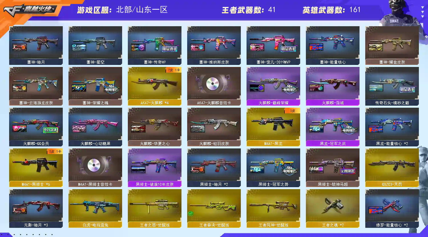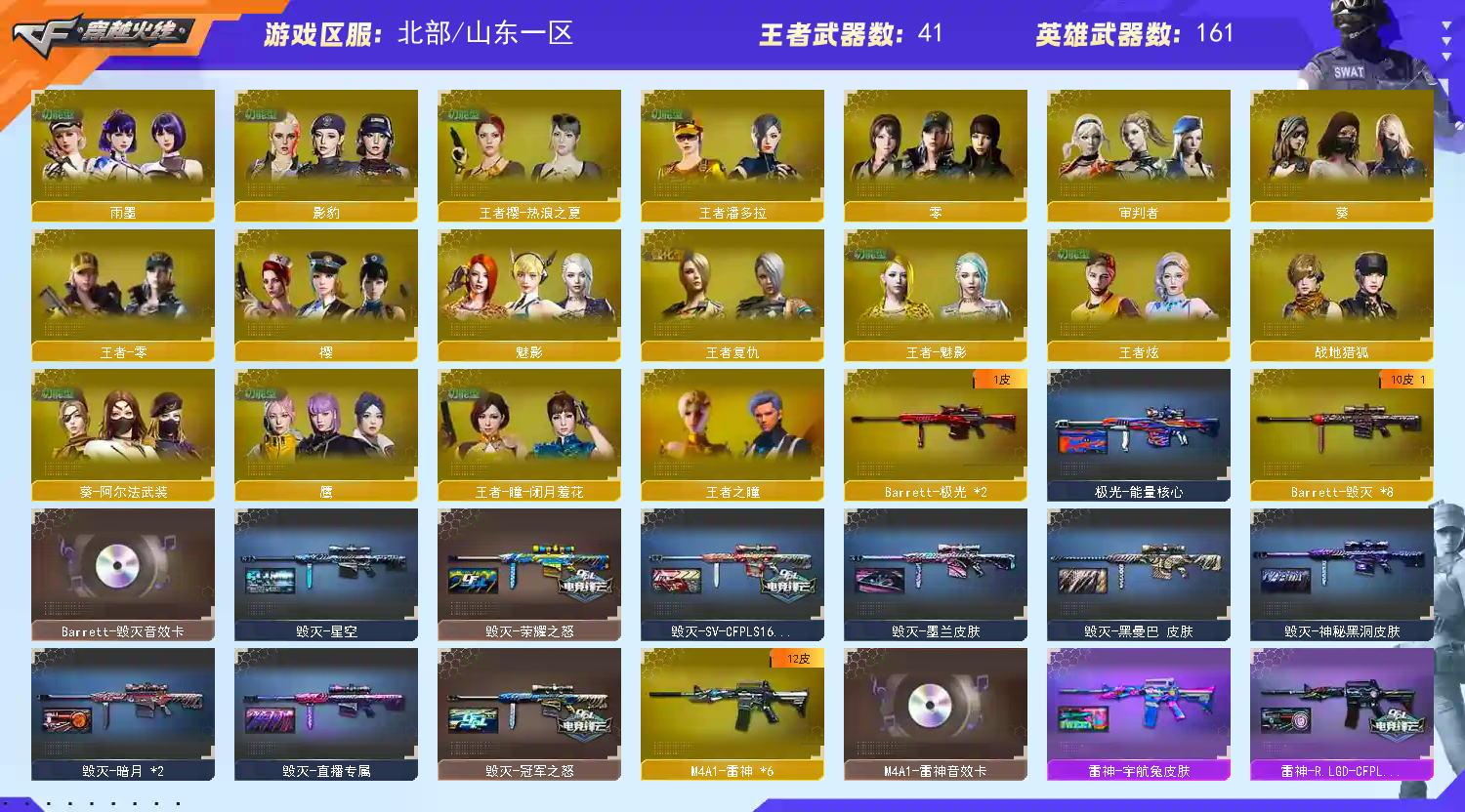 【商品标题】:北部山东一区-172V-可二次实名-【Lv.102.荣耀元帅】-【段位:荣耀之巅】 【稀有武器】:传说灵眸/M200-幻神/Kar98K-星神/G36C-幻影/ScarLight-白虎/HK417-朱雀/QBZ03-天罚/USP-雷暴/COP357-幻灵(2)/柯尔特-竞技荣光/COP357-云龙/柯尔特-无冕之王(2)/沙鹰-幻兽/荣耀世冠-柯尔特/COP357-雷霆王者-觉醒版(3)/柯尔特-冠军之特(3)/金色蔷薇-古蛇迷踪/QBZ03-金色蔷薇/AK47-火麒麟(4)/AK47-麒麟/M4A1-黑龙/M4A1-雷神(6)/M4A1-黑骑士(6)/AK47-无影(2)/AK47-黑武士(2)/荣耀世冠-雷神/白虎-电玩蓝兔/Barrett-毁灭(8)/Barrett-极光(2)/AWM-裁决/RPK-盘龙(2)/加特林-炼狱(4)/汤姆逊-烈龙(9)/AA-12-雷霆/炽芒蝶刃(2)/幻灵之锋/擎天-竞技荣光 【王者武器】:王者之魄-觉醒版/王者之怒-觉醒版/王者之力-觉醒版/王者森决-觉醒版/王者风神-觉醒版/王者之心/王者之魄/M4A1-雷霆王者/王者之光/王者雷怒/王者星霆 【热门角色】:传说影煞/鹰/影豹/雨墨/魅影/奇洋探员/乔伊教练/蛇隐宗/王者-零/王者-魅影/王者潘多拉/王者炫/空/流浪蔷薇/潘多拉-X/幽/潘多拉 【热门音效卡】:M200-幻神音效卡/Kar98K-星神音效卡/AWM-裁决音效卡/QBZ03-金色蔷薇音效卡/M4A1-雷神音效卡/Barrett-毁灭音效卡/M4A1-黑骑士音效卡/AK47-火麒麟音效卡 【热门皮肤】:M200-幻神-N9-2022MVP/幻神-宠儿-2021MVP/幻神-星火小队签名臻藏版皮肤/幻神-冠军之幻/幻神-巅峰荣耀/幻神-CFS2022/幻神-曹操皮肤/幻神-周瑜皮肤/幻神-动感闪耀皮肤/QBZ03-CFS2024皮肤/金色蔷薇-破浪逐光皮肤/白虎-热带奇洋皮肤/QBZ03-传奇宠儿/屠龙-星火燎原/天罚-孙权皮肤/裁决-羽掣皮肤/Kar98K-星神-冠军之星皮肤/雷神-R.LGD-CFPLS18冠军/屠龙-荣耀世冠AG/擎天-冠军之击/火麒麟-巅峰荣耀/星神-枪娘默 皮肤/白虎-巅峰荣耀 皮肤/白虎-霓虹机甲 皮肤/屠龙-破浪逐光皮肤/死神-机甲核心皮肤/裁决-流光秘银/黑龙-冠军之武/炽芒蝶刃-破浪逐光皮肤/毁灭-直播专属/传奇石头-横秒之巅/QBZ03-荣耀世冠白鲨/黑骑士-战神马超/雷神-宠儿-2019MVP/雷神-传奇N9/ScarLight-白虎-暗星/毁灭-冠军之怒/屠龙-荣耀之锋(4)/金色蔷薇-枪娘阿敏皮肤/毁灭-荣耀之怒/屠龙-春桃皮肤/龙啸-冠军之啸(2)/雷神-荣耀之魄 【其他亮点】:斯泰尔-蝴蝶(2)/Knife-冠军之刃/白虎-迷你小艾/毒蜂/海神三叉戟/斯泰尔-枪娘暗刃/贝雷塔687-射手座/黄金猫猫手套-白鲨/金刚伞-电玩红兔/烟雾弹-荣耀世冠白鲨2023/哔哩哔哩名片/超核名片/超核名片 (截图展示段位不代表实际段位,如赛季更新等不可抗拒因素发生变化,其余道具看截图或咨询客服);USP-雷暴,柯尔特-无冕之王,荣耀世冠-柯尔特,柯尔特-冠军之特,炽芒蝶刃,Knife-冠军之刃,传说影煞,
