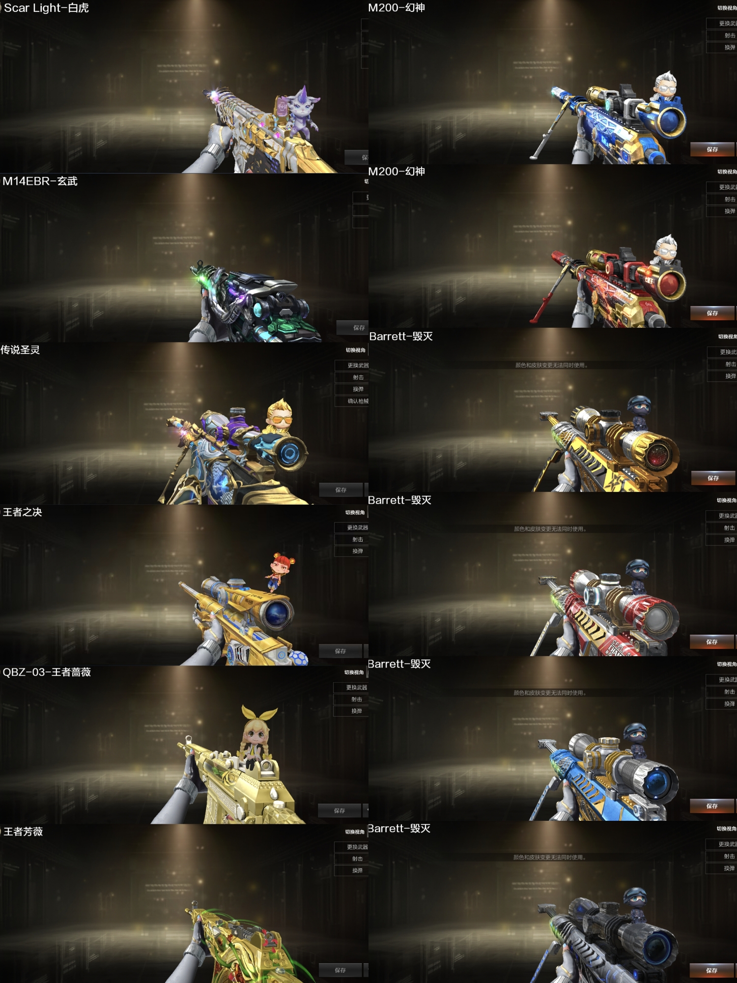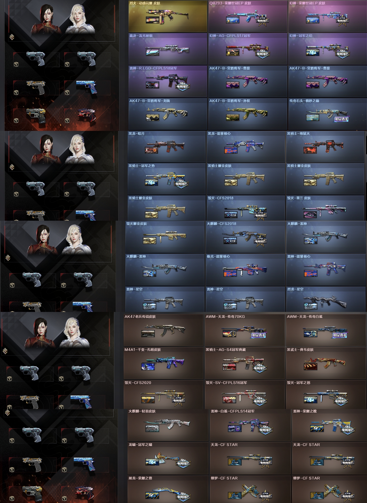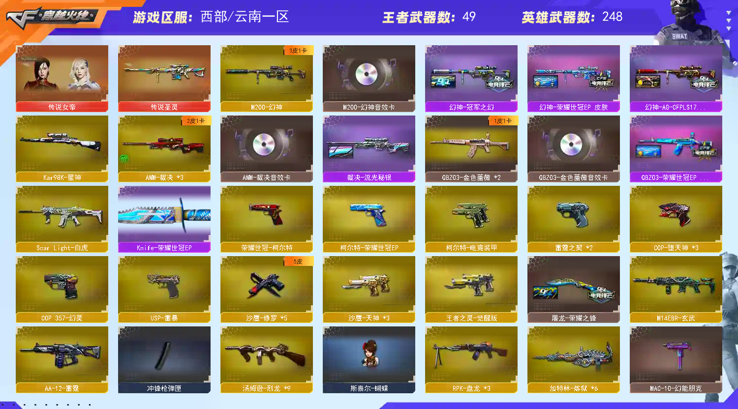 四防传说女帝,幻神三件套,幻神EP皮肤,星神白虎,QBZ三件套,EP全套,EP小刀,幻神AG,冠军之幻;USP-雷暴,荣耀世冠-柯尔特,传说女帝,RPK-盘龙,QBZ03-金色蔷薇,M200-幻神,Scar Light-白虎,
