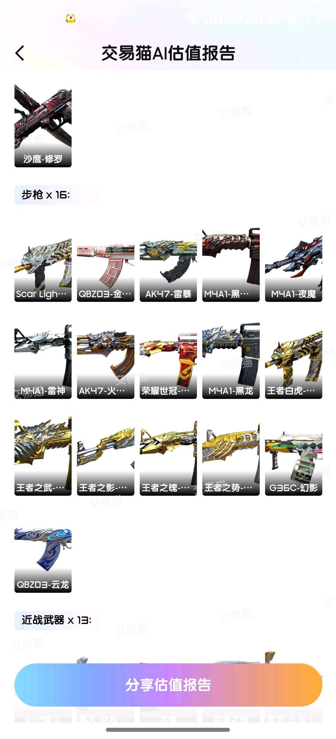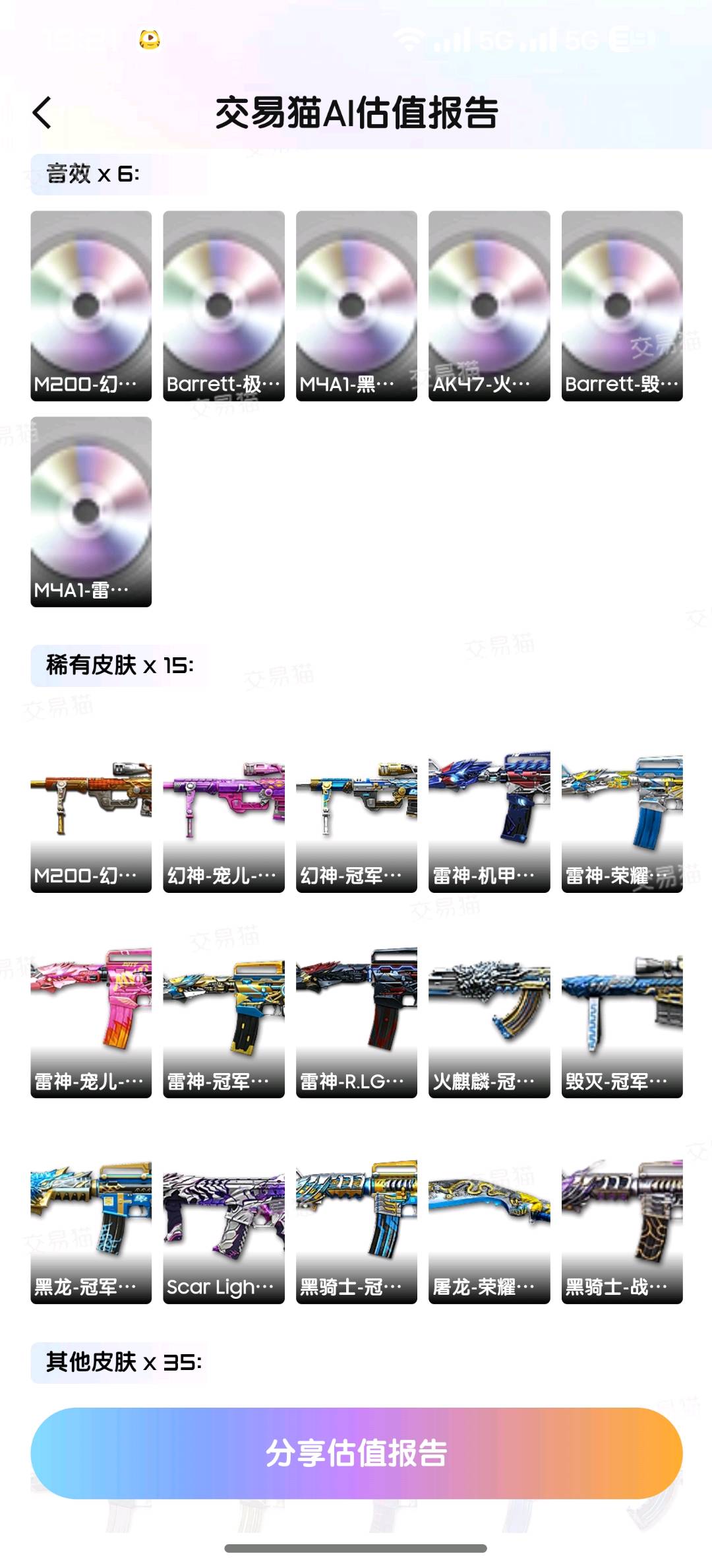 四防角色5个 影煞跟云悠悠都可以每天更换 老神器雷神火麒麟大炮都有热门皮肤有音效卡 神器刀基本全有,蝴蝶刀2把冠军之刃2把;USP-雷暴,荣耀世冠-柯尔特,柯尔特-冠军之特,炽芒蝶刃,Knife-冠军之刃,传说影煞,电竞教官-云悠悠,