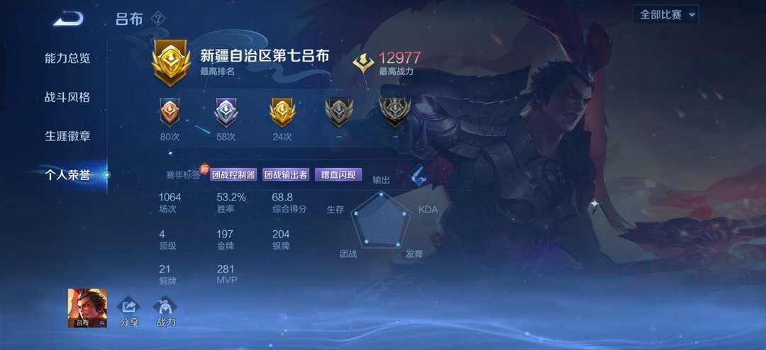 立即租号首页 > 租号大厅 > 王者荣耀 > 标题写明区服/QQ > 段位王者,1.4w战力司空震,1.3万战力吕布,金标狂铁账号,有对抗路基础的可以去大厅五排装杯.